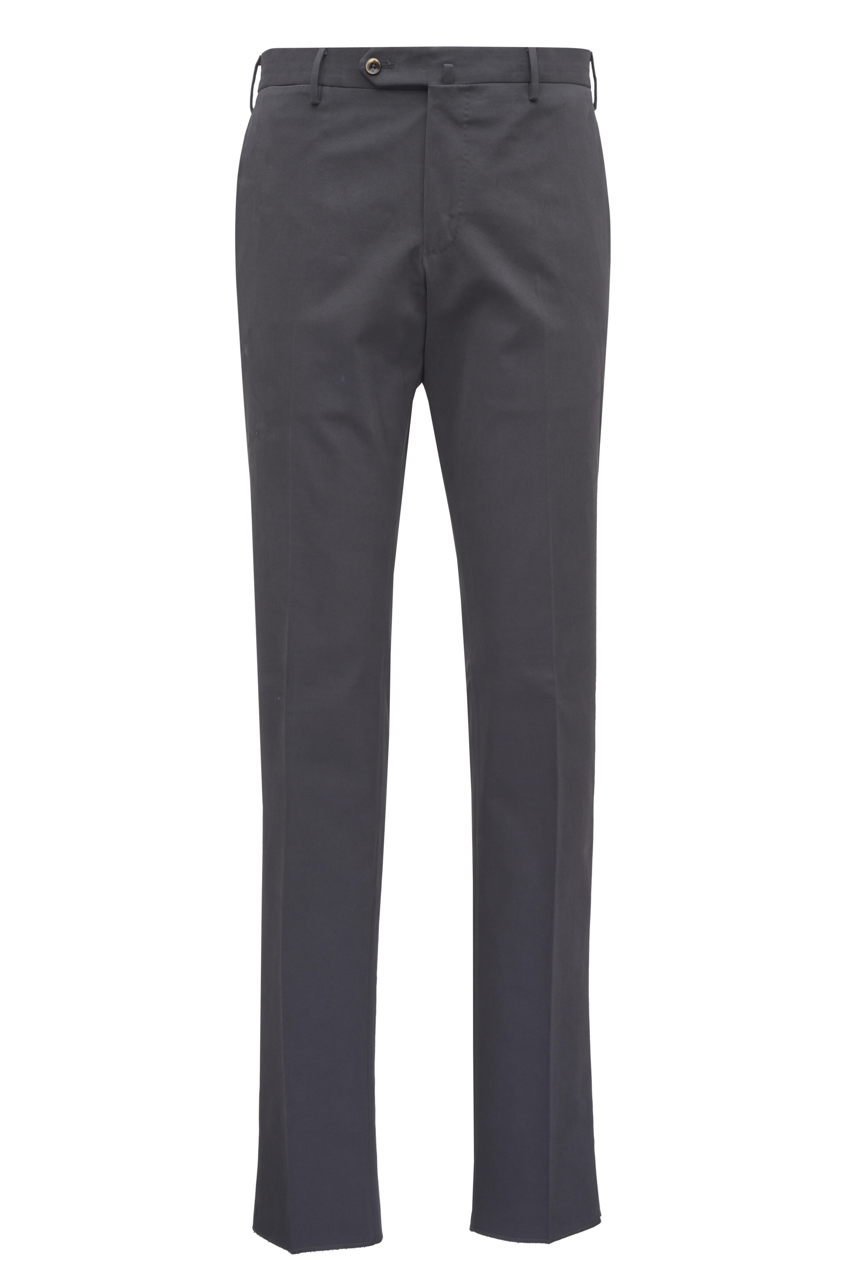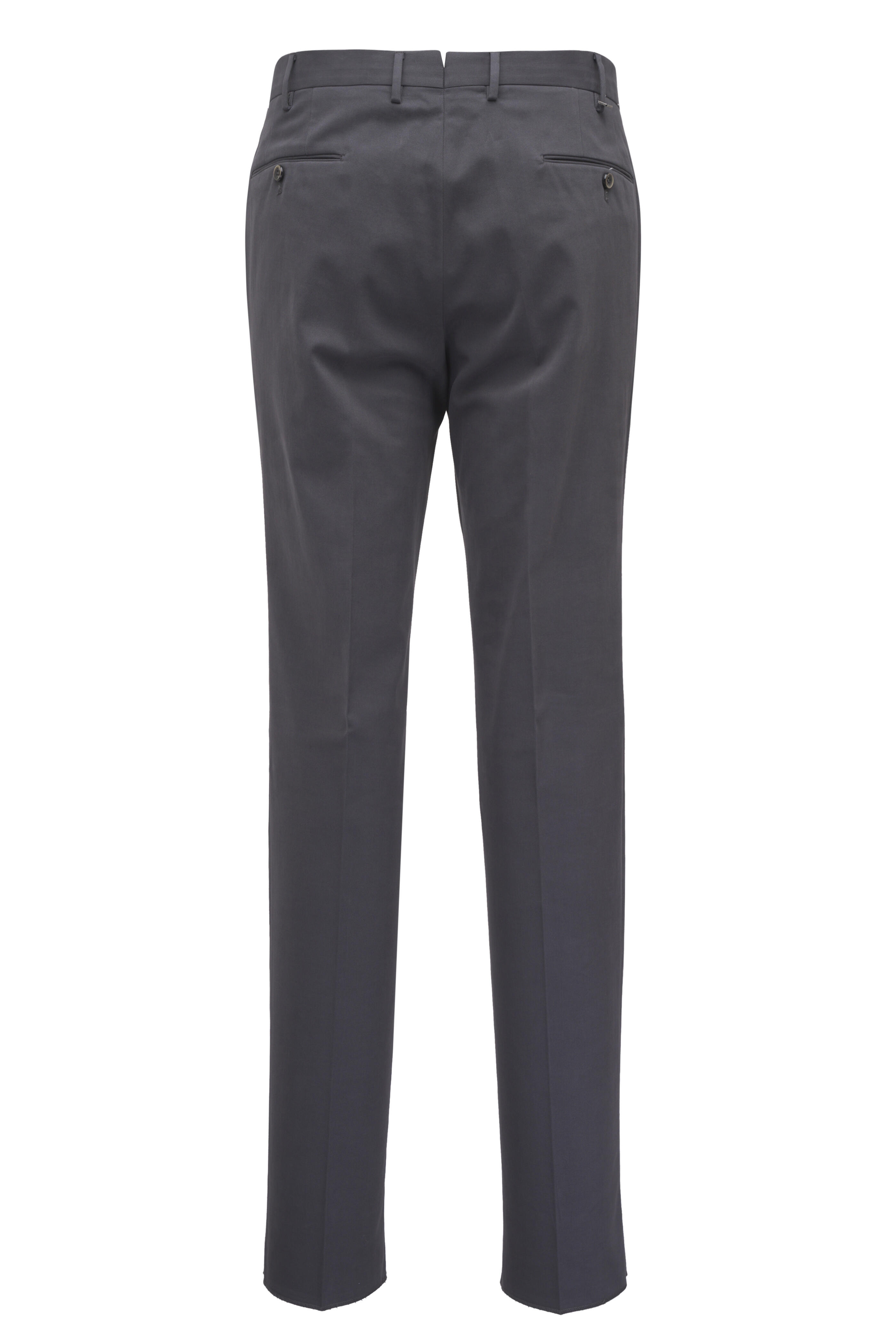 Zip fly; extended button tab. Banded waist; belt loops. Side slash pockets; back welt button pockets. Unfinished hem. Imported. Slim fit. 95% cotton, 3% cashmere, 2% elastane. Dry clean.