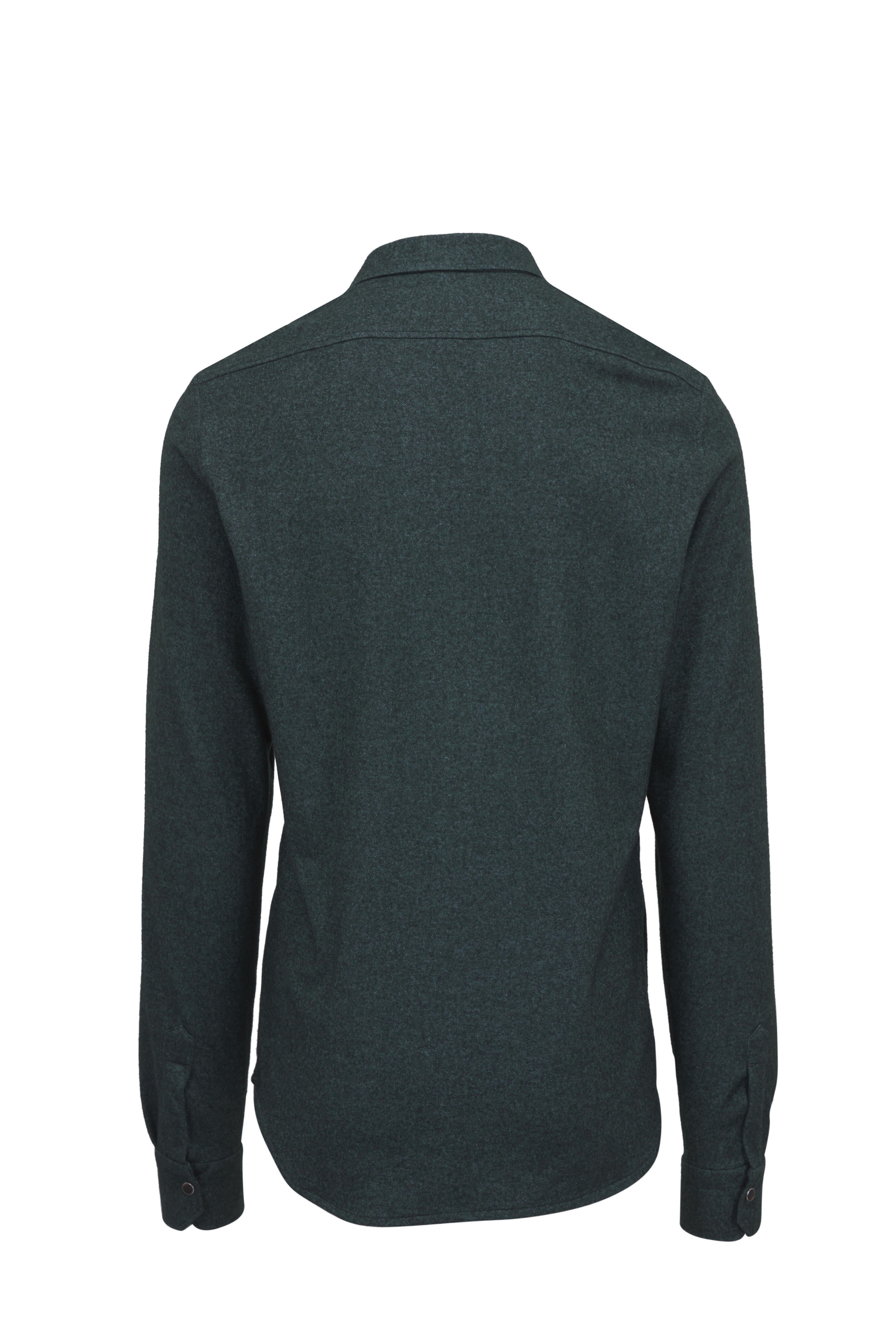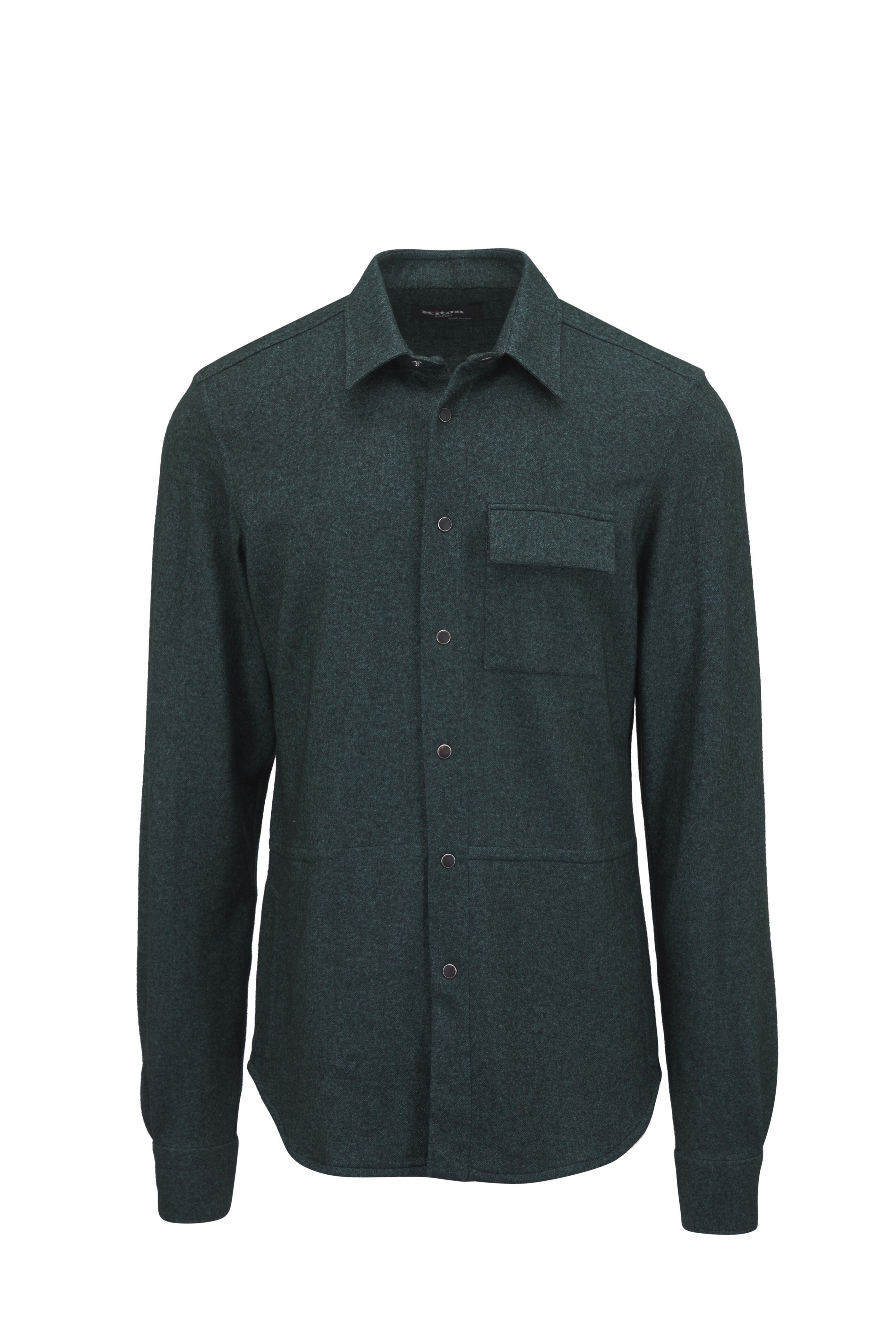 Pointed collar. Front snap button placket. Chest flap pocket; lower waist slip pockets. Single button cuffs. Made in Italy. 52% silk, 48% cashmere. Dry clean.