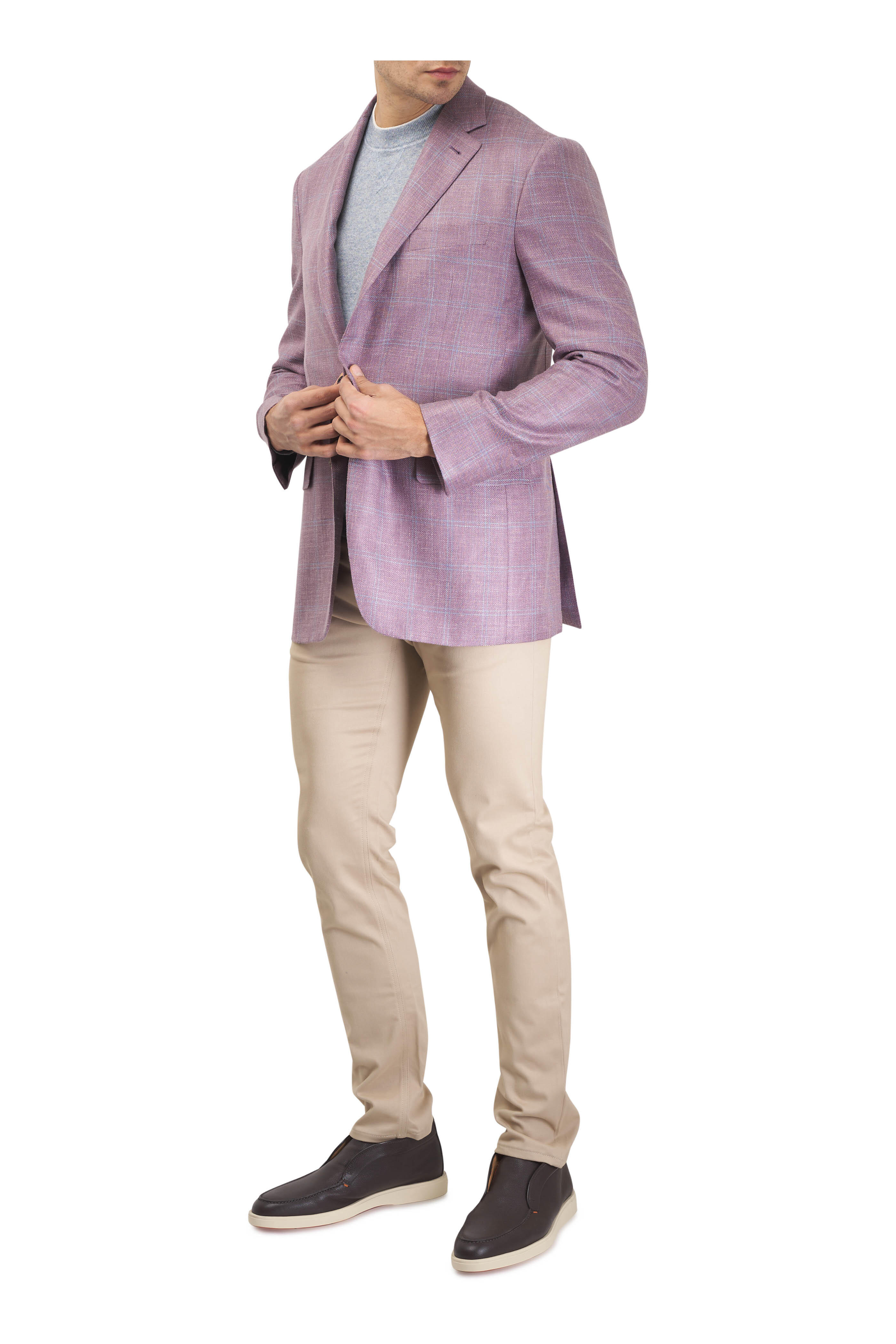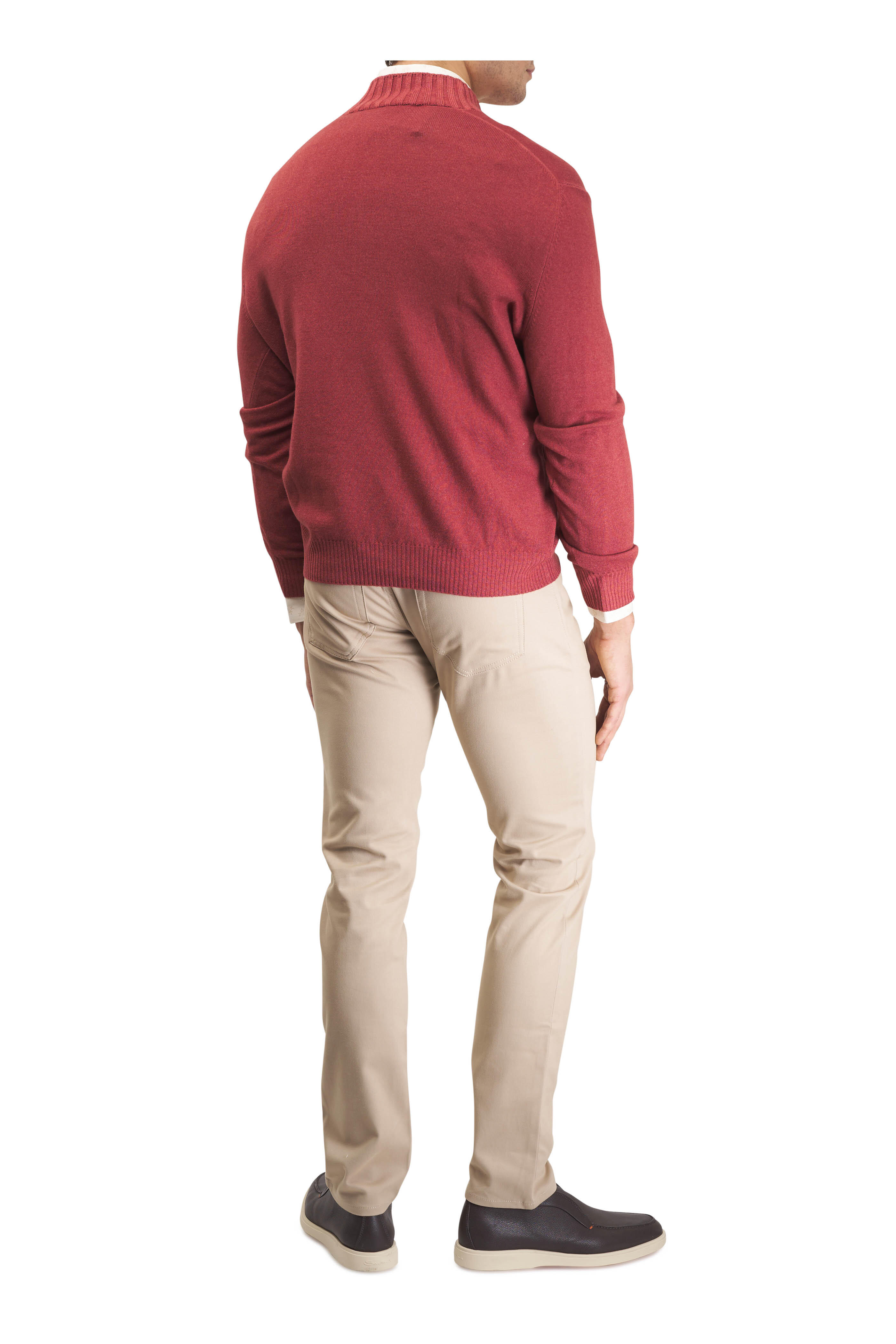 Zip fly with button closure. Banded waist; belt loops. Five pocket styling. Straight hem. Made in Italy. 34" inseam. 58% cotton, 27% lyocell, 12% cashmere, 3% elastane. Dry clean.