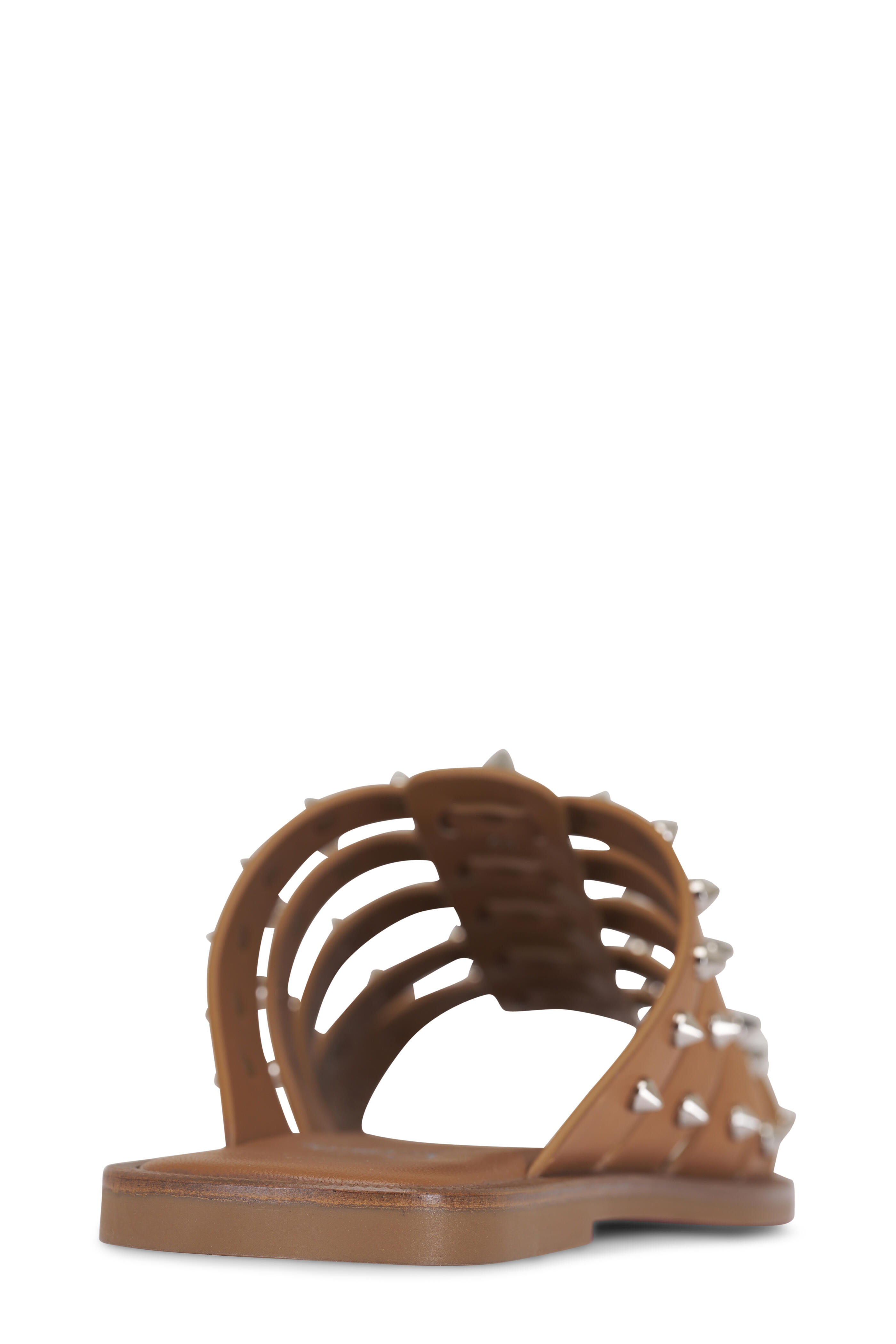 Leather upper. Open toe. Slip-on style. Embellished spikes. Leather lining and insole. Signature red rubber sole. Made in Spain.