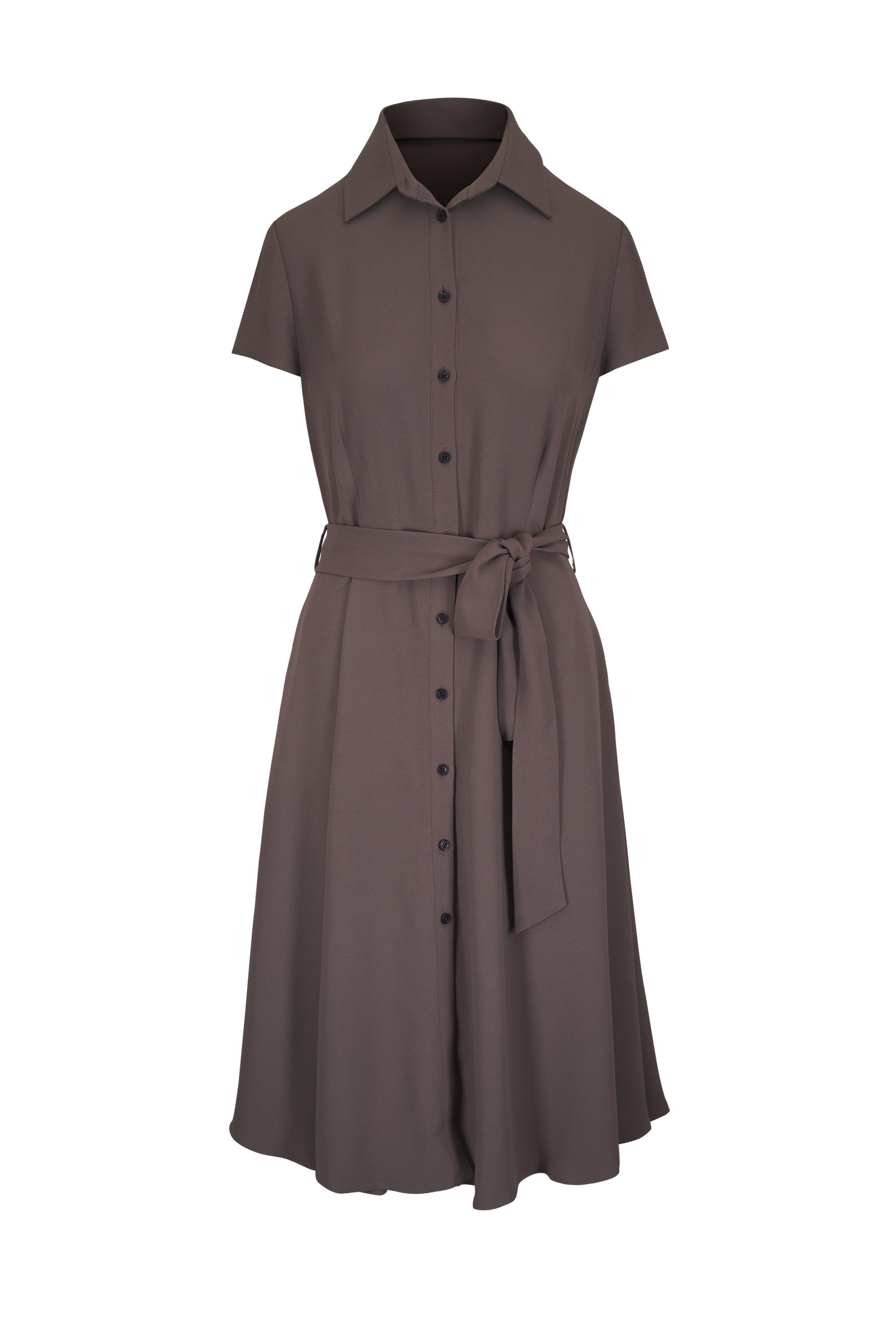 Spread collar. Front button placket. Belt loops; removable self-tie belt. Made in Italy. Approximately 45" shoulder to hem (measurements taken from size 6). 79% acetate, 21% viscose. Dry clean.