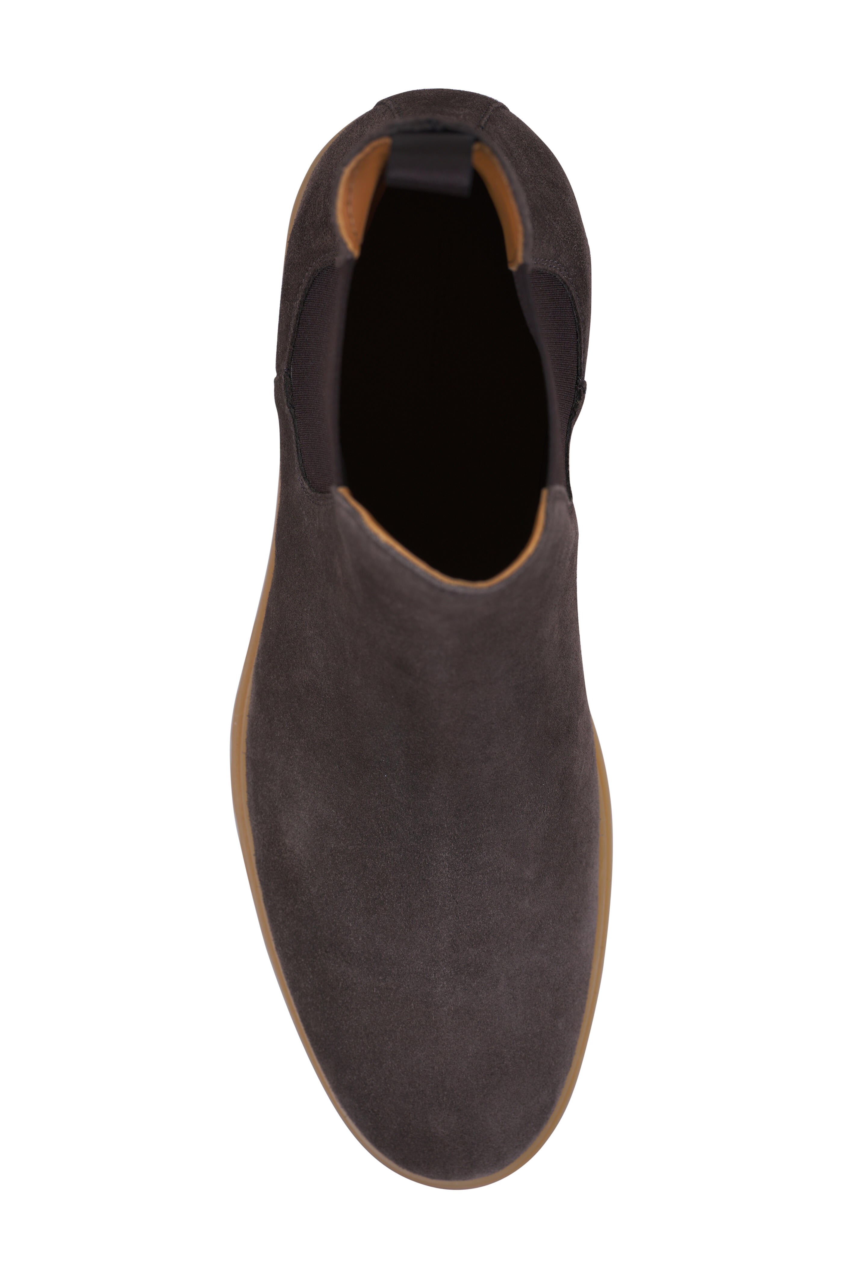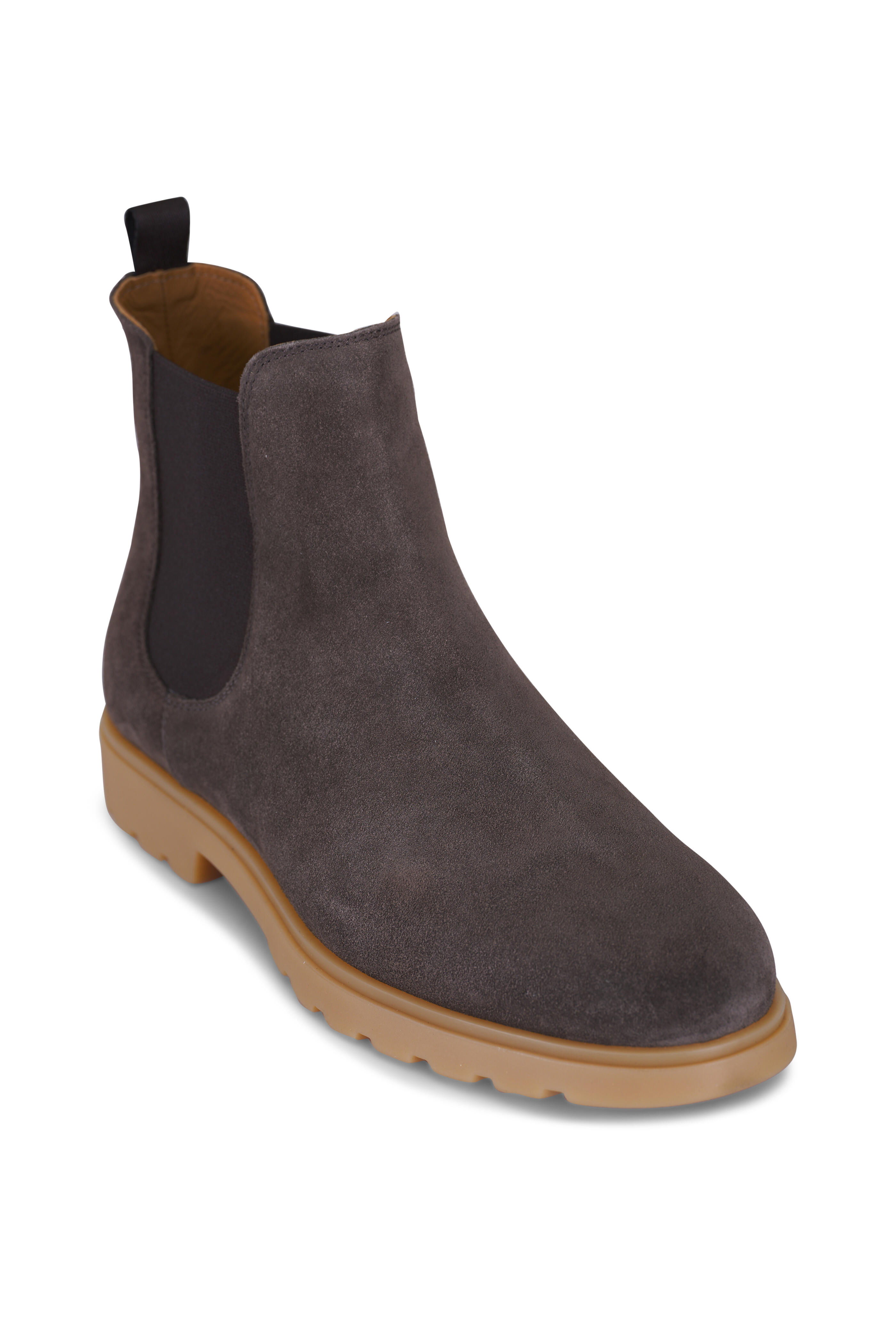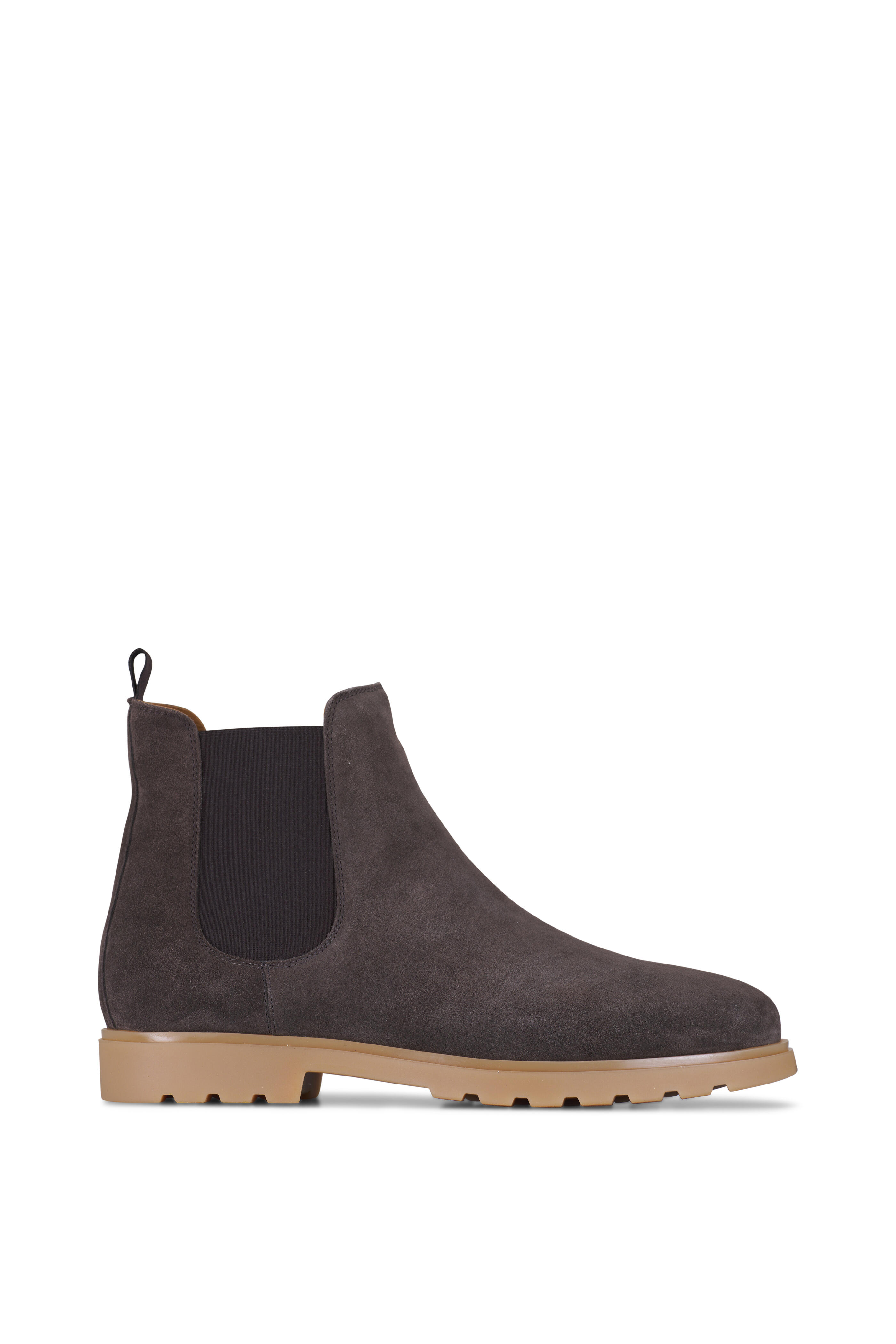 Suede upper. Round toe. Back pull tab. Leather lining and insole. Rubber gum sole. Made in Italy.
