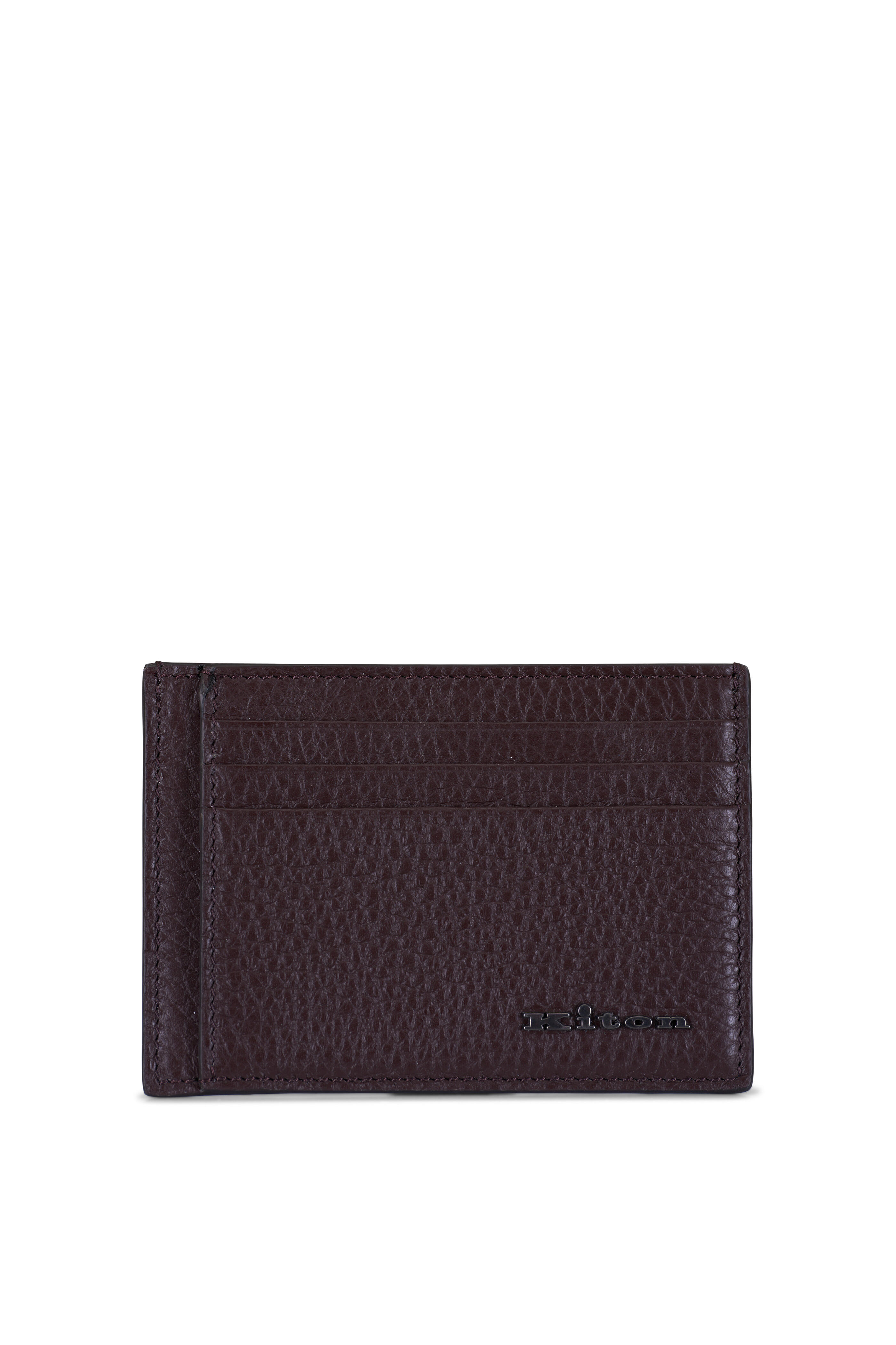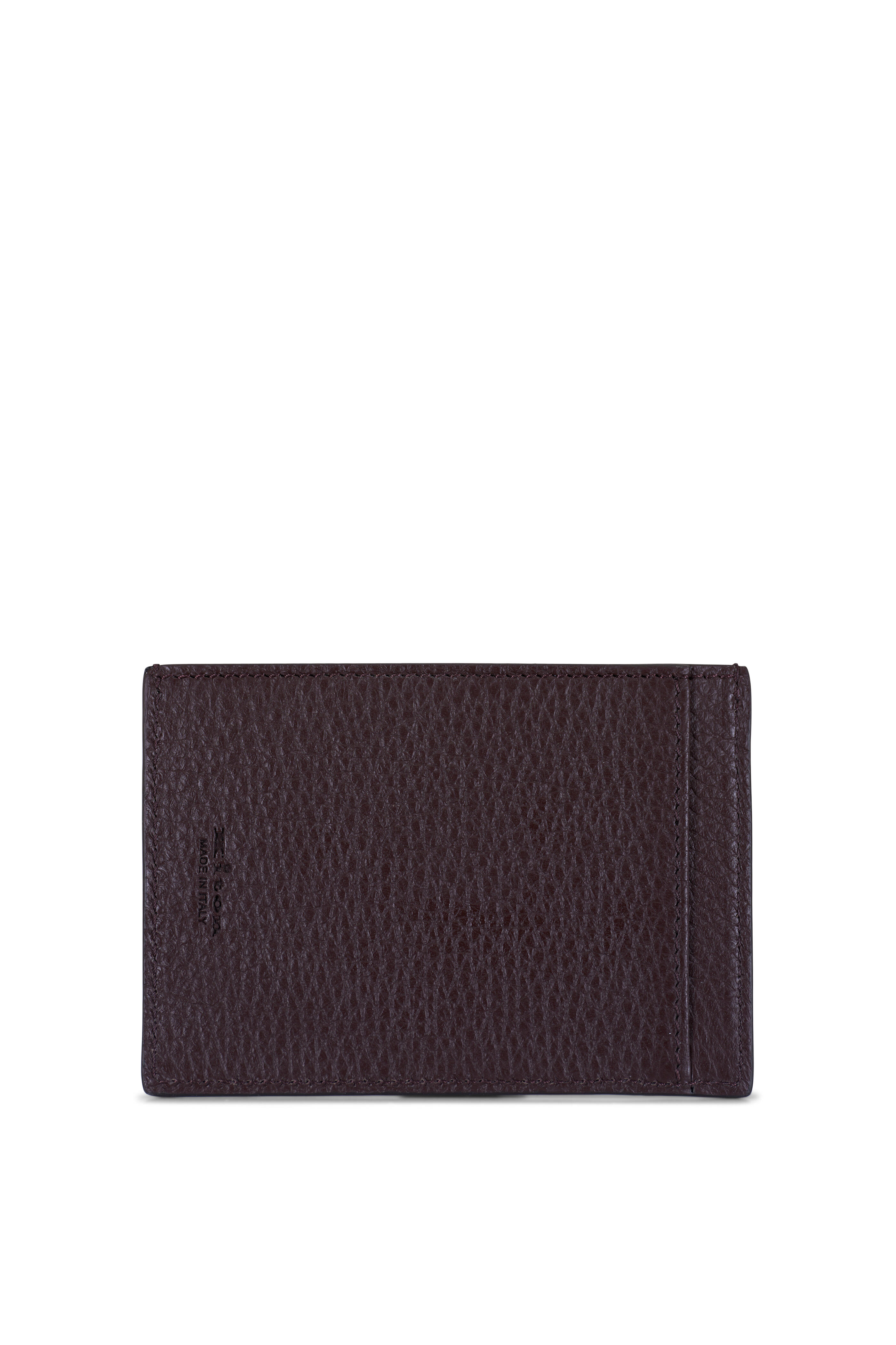 Grained calfskin leather. Three horizontal card slots. Two vertical card slots. Center open compartment. Made in Italy.