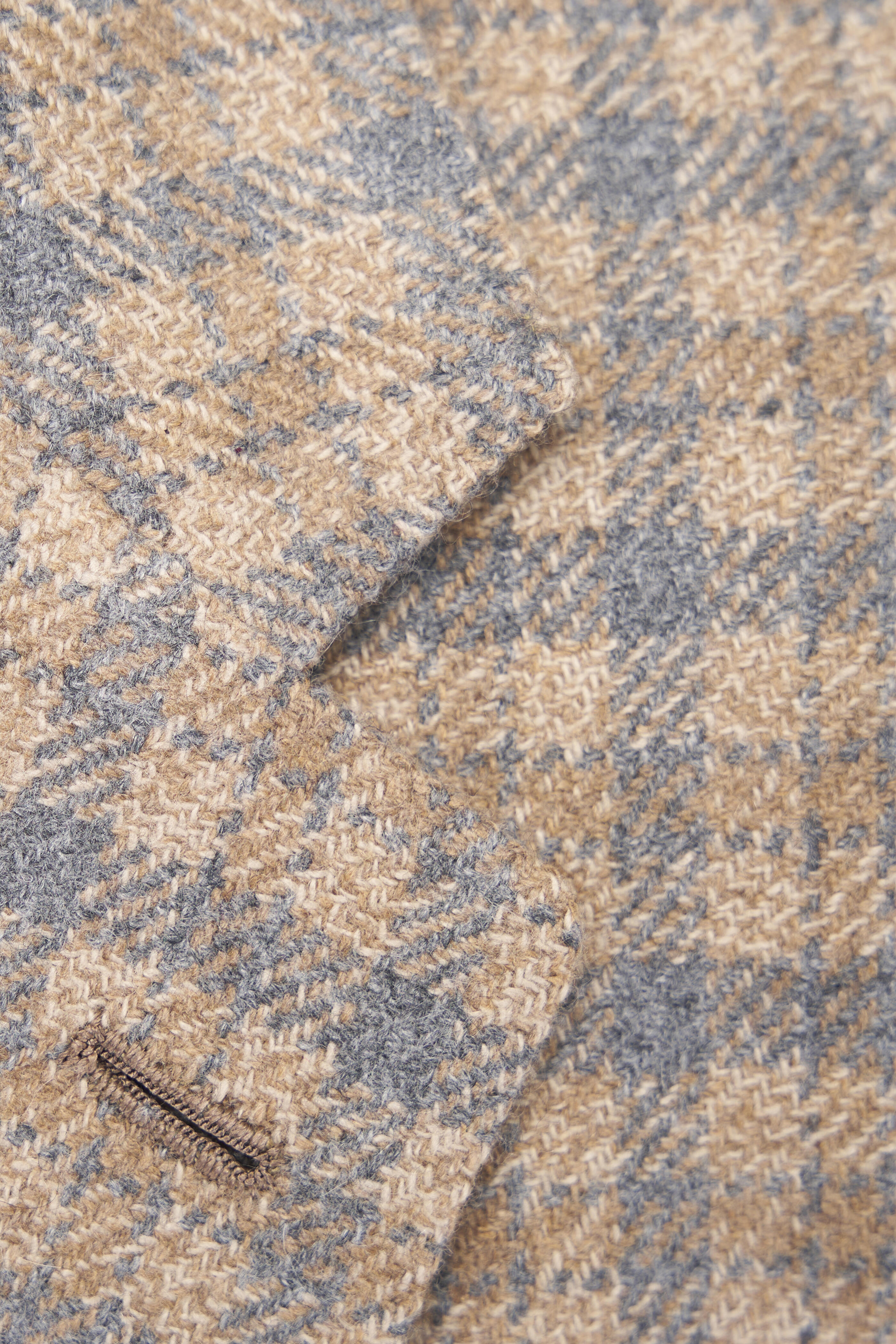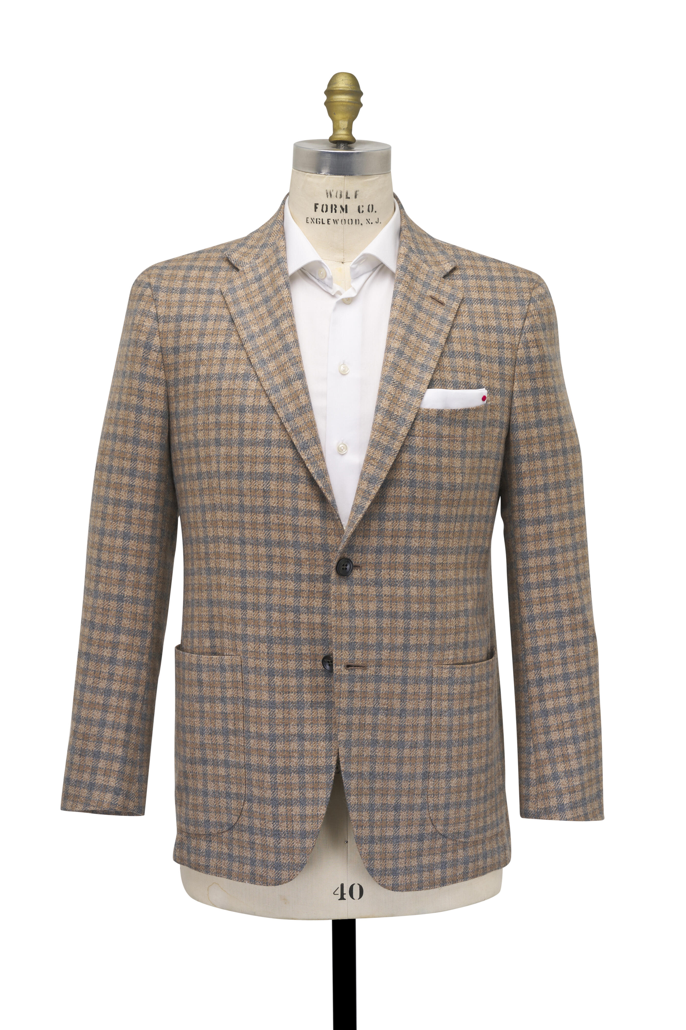 Notched lapels. Two button closure. Chest welt pocket; lower waist patch pockets; interior slip pockets. No buttons attached. Double vent. Made in Italy. 100% cashmere; partially lined. Dry clean.