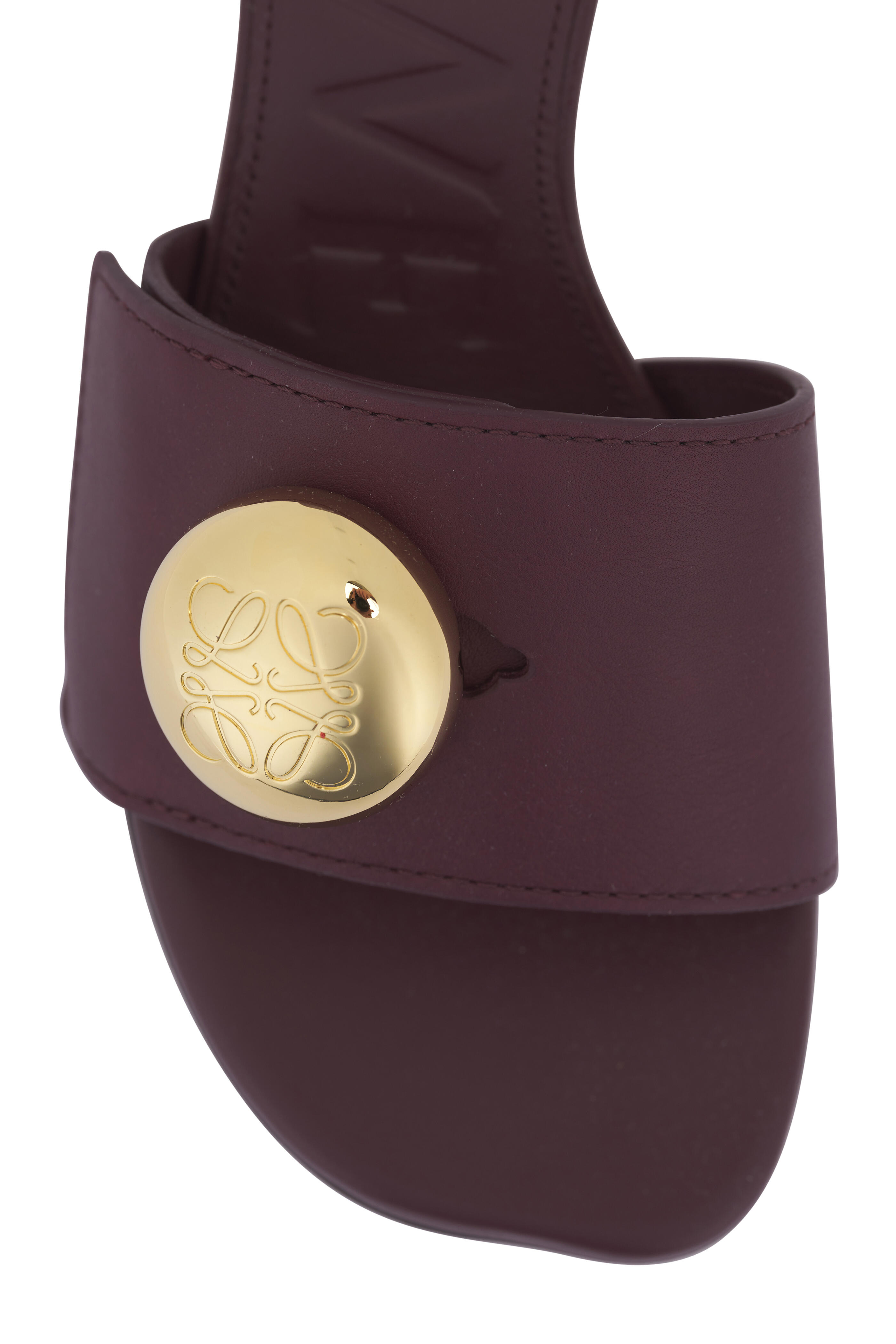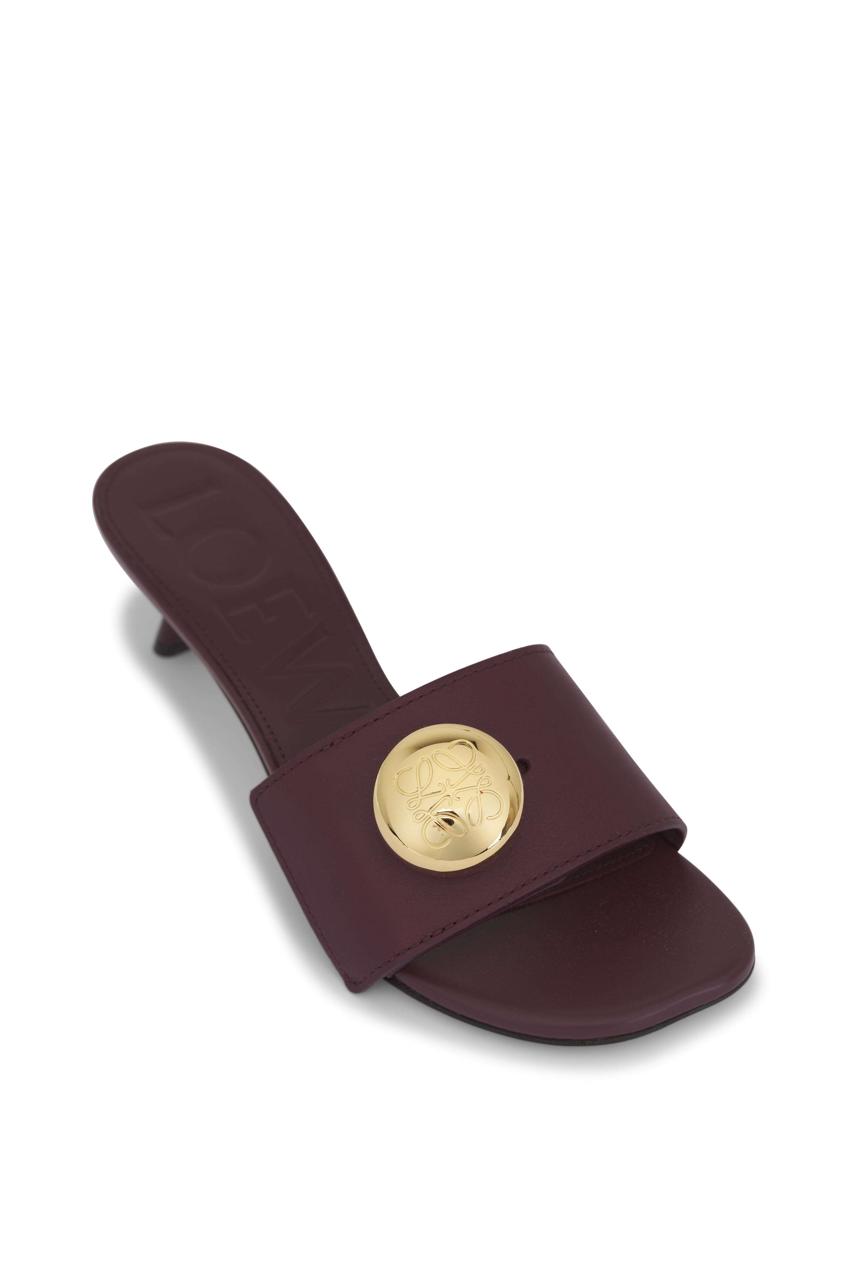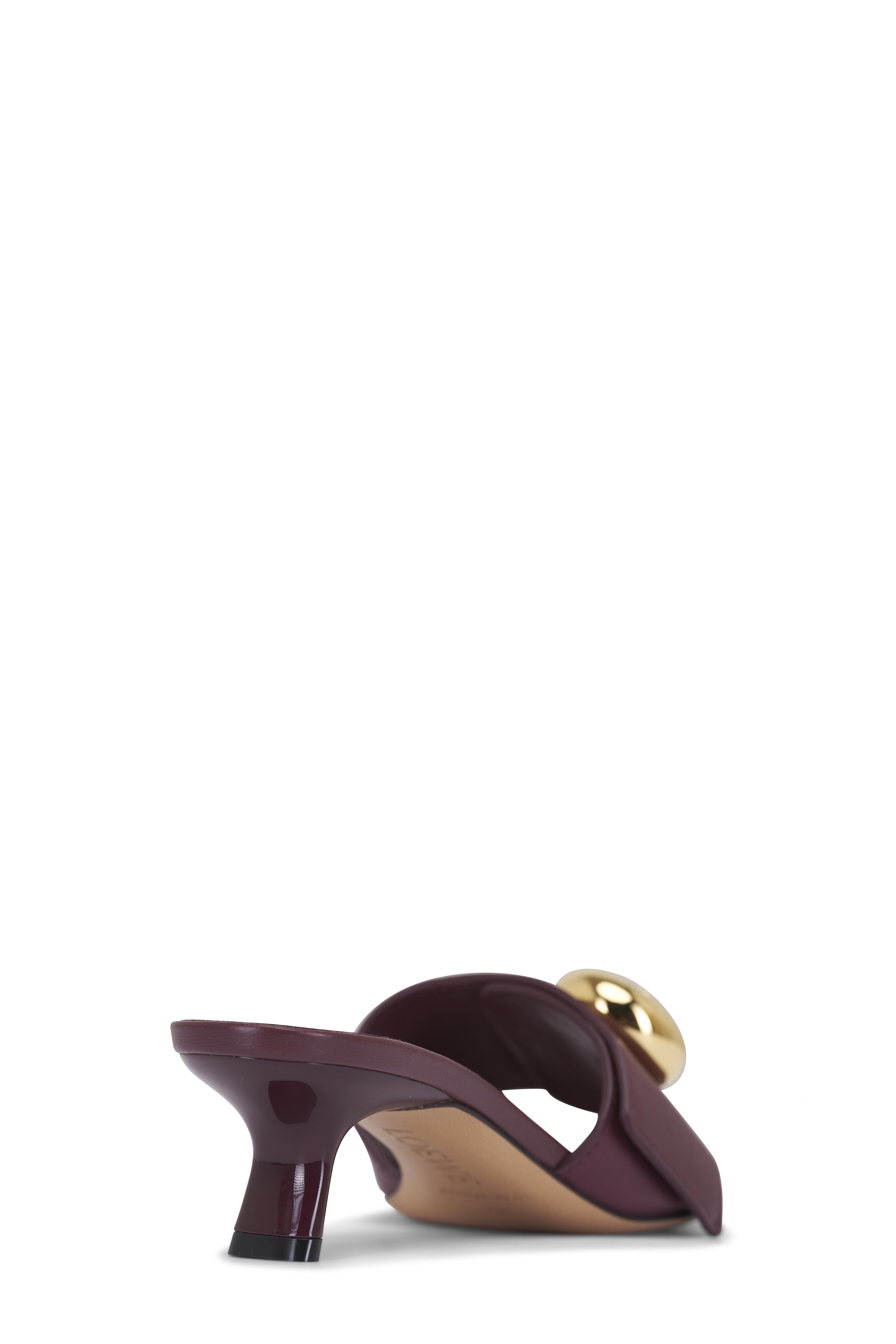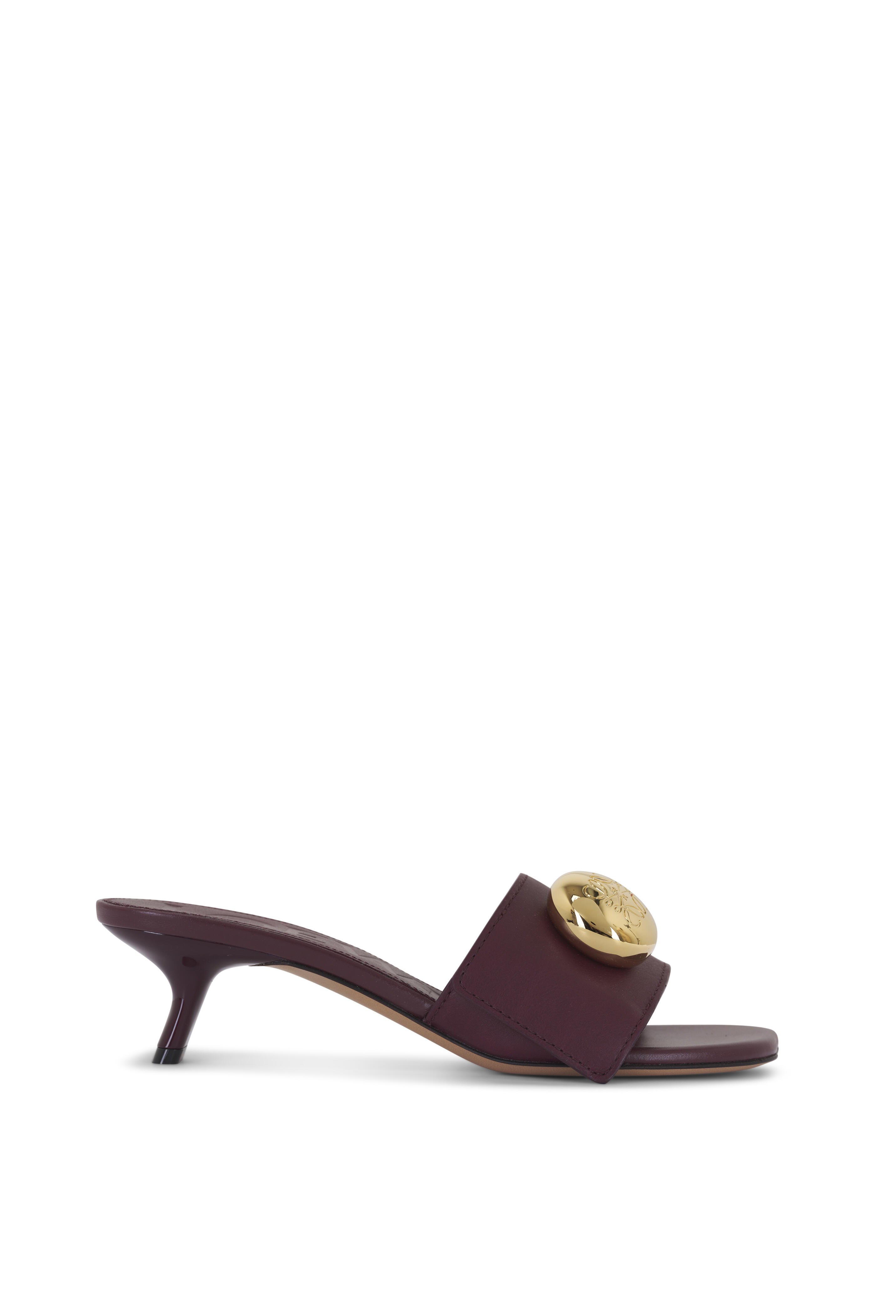 Leather upper. Squared, open toe. Slip on style. Engraved Anagram pebble on strap. Leather lining and insole. Sculpted kitten heel. Leather sole. Made in Italy. Heel height: 45mm.