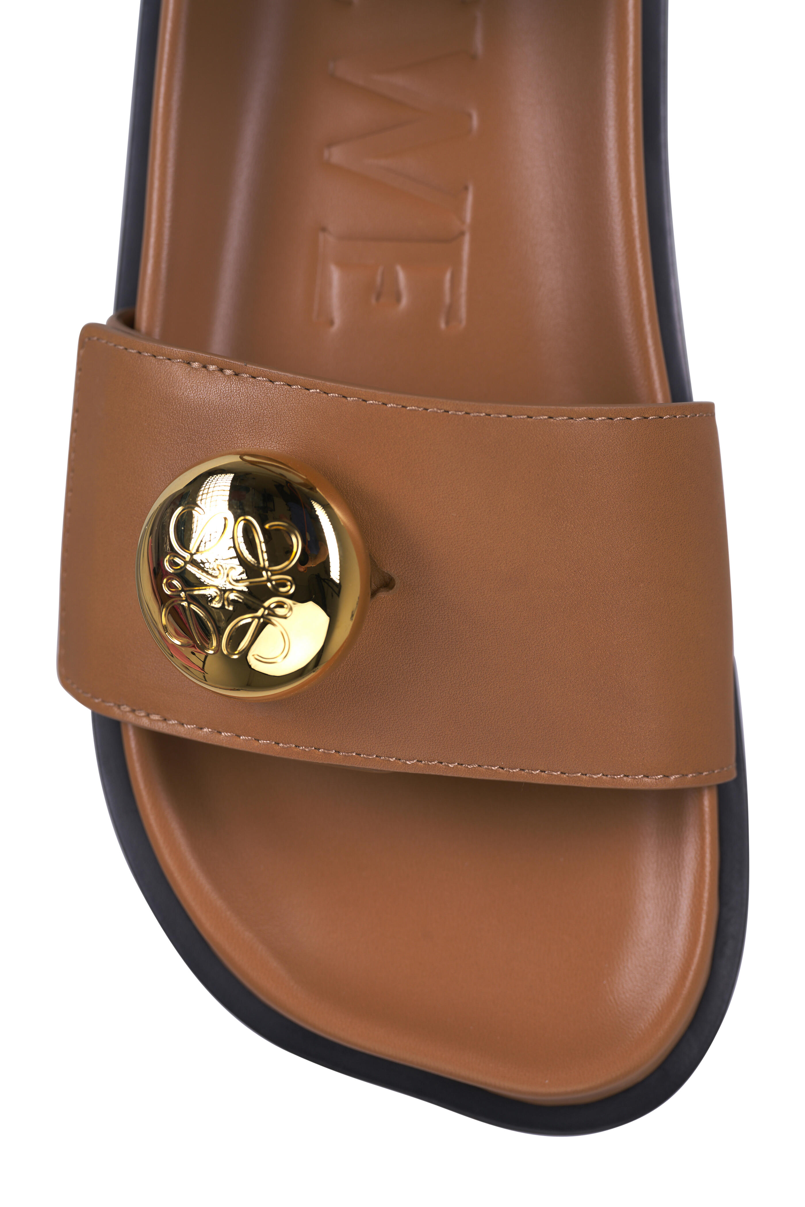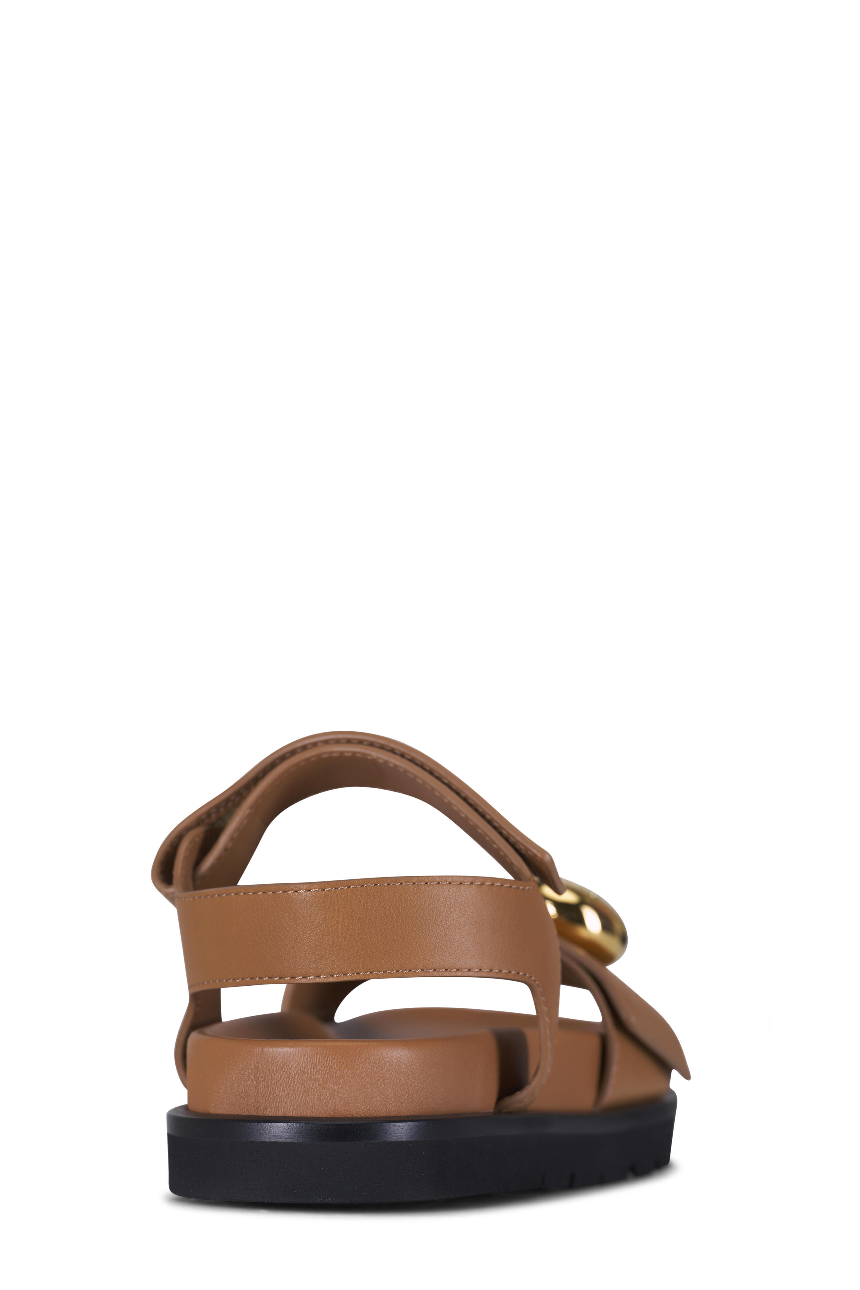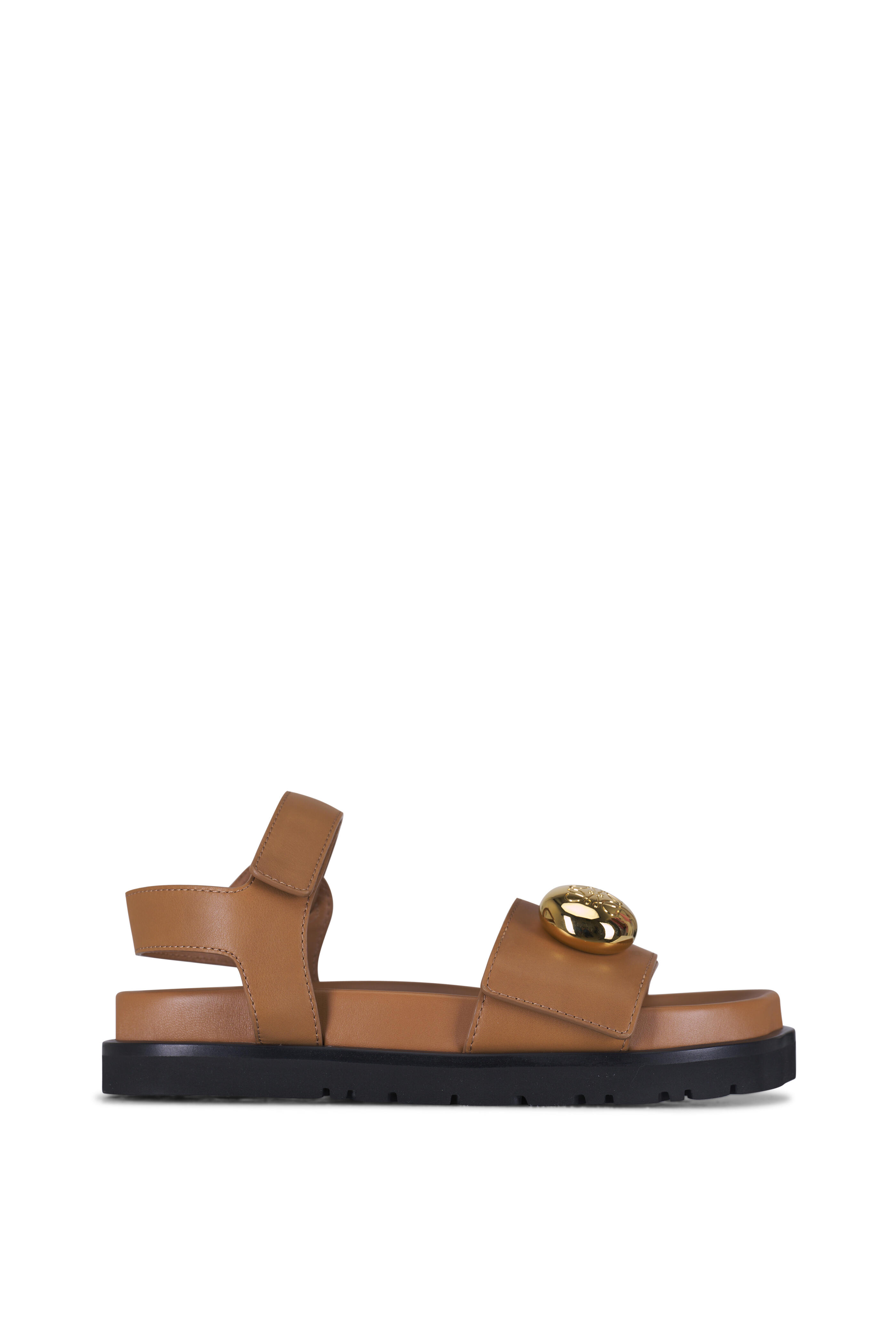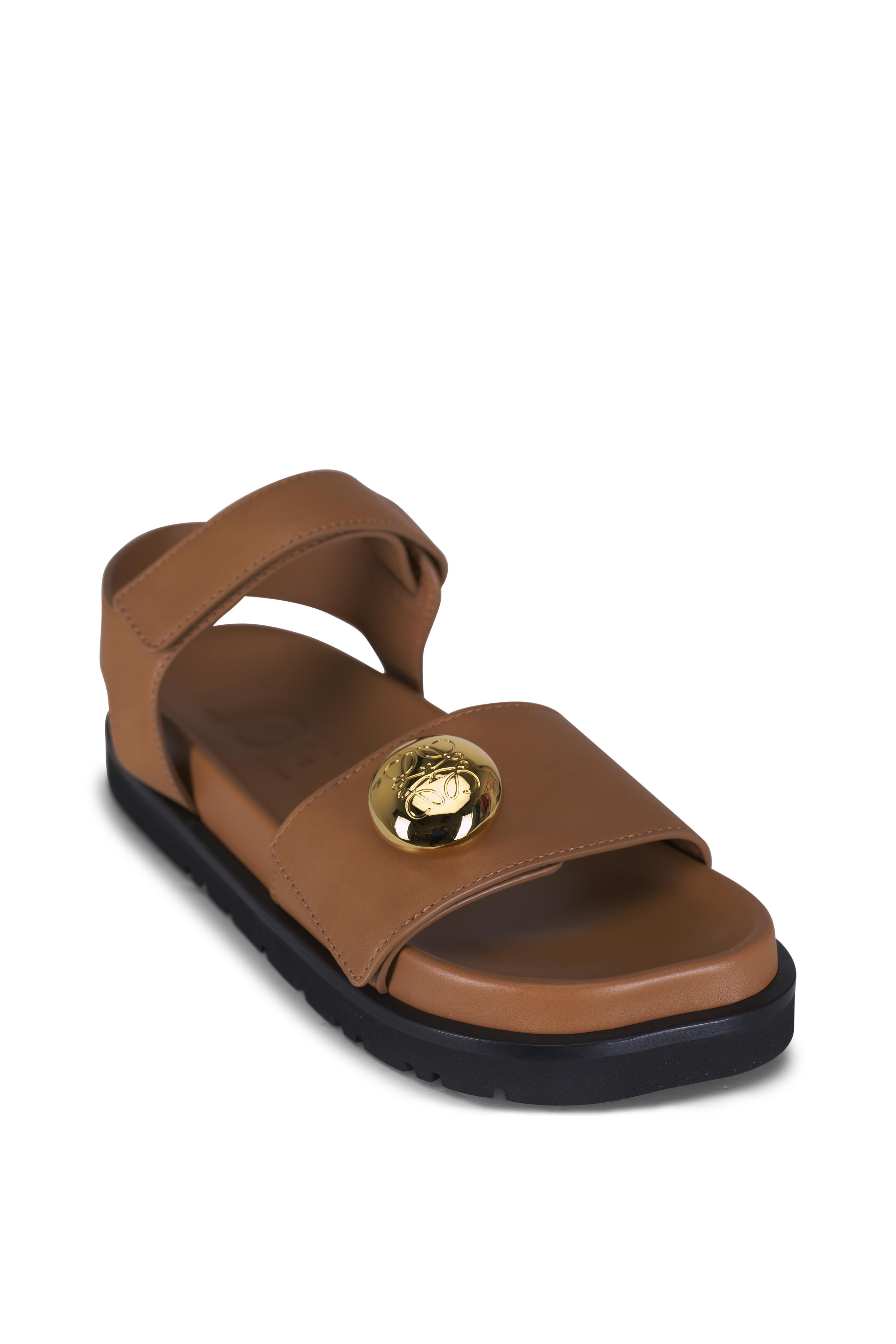 Leather upper. Squared, open toe. Adjustable Velcro straps. Engraved Anagram pebble on strap. Leather lining and insole. Rubber sole. Made in Italy.