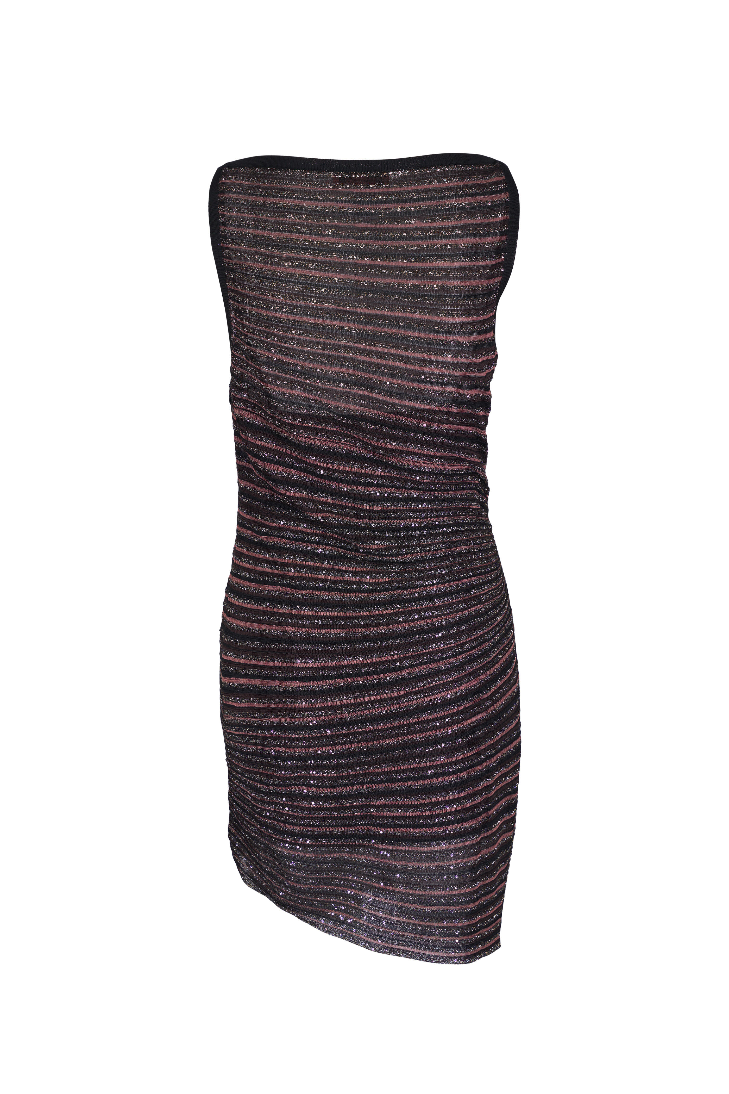 Bateau neckline. Concealed side zip. Made in Italy. Approximately 38 ½" shoulder to hem (measurements taken from size 6). 70% viscose, 25% polyamide, 7% metalized fiber ; lined. Dry clean.