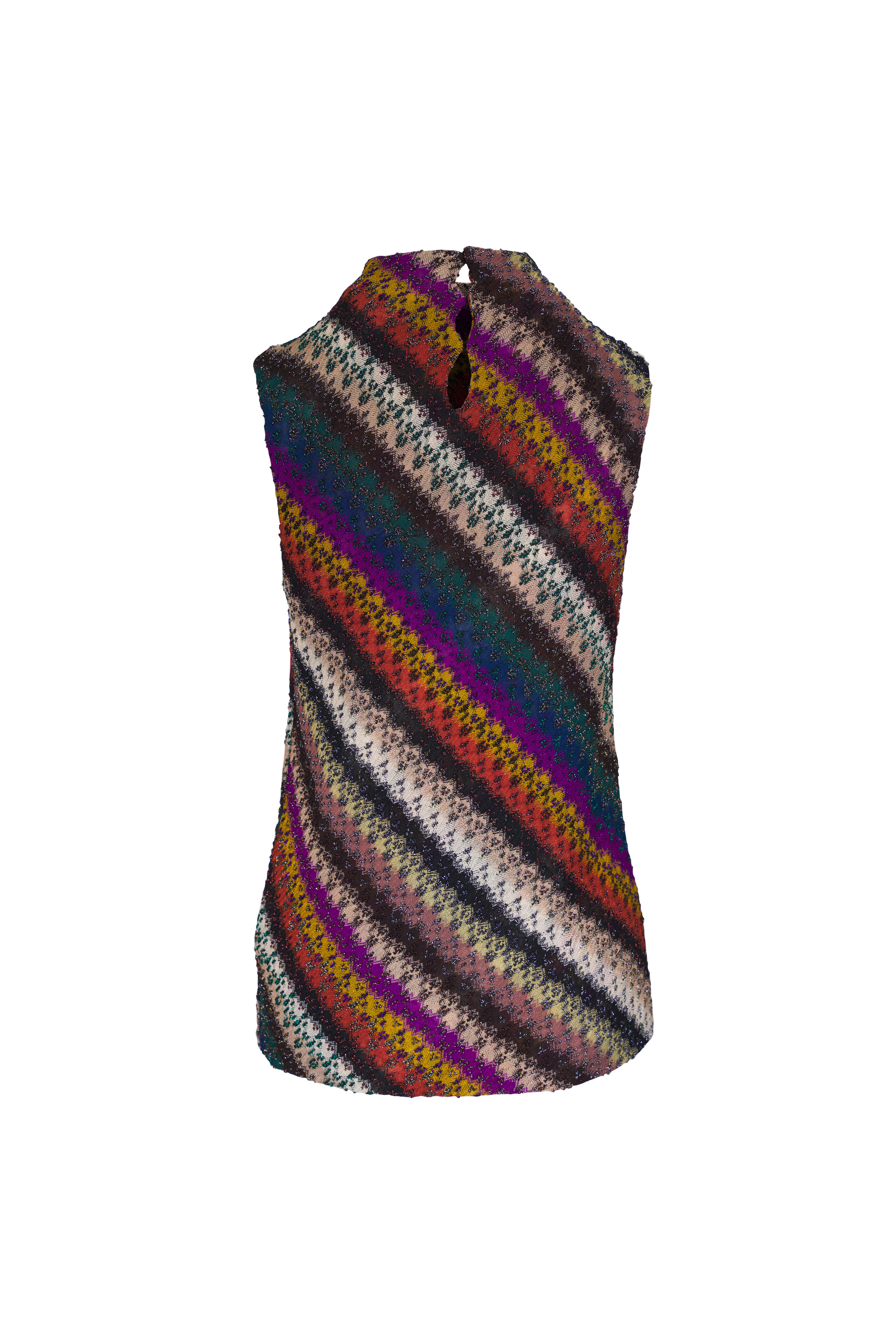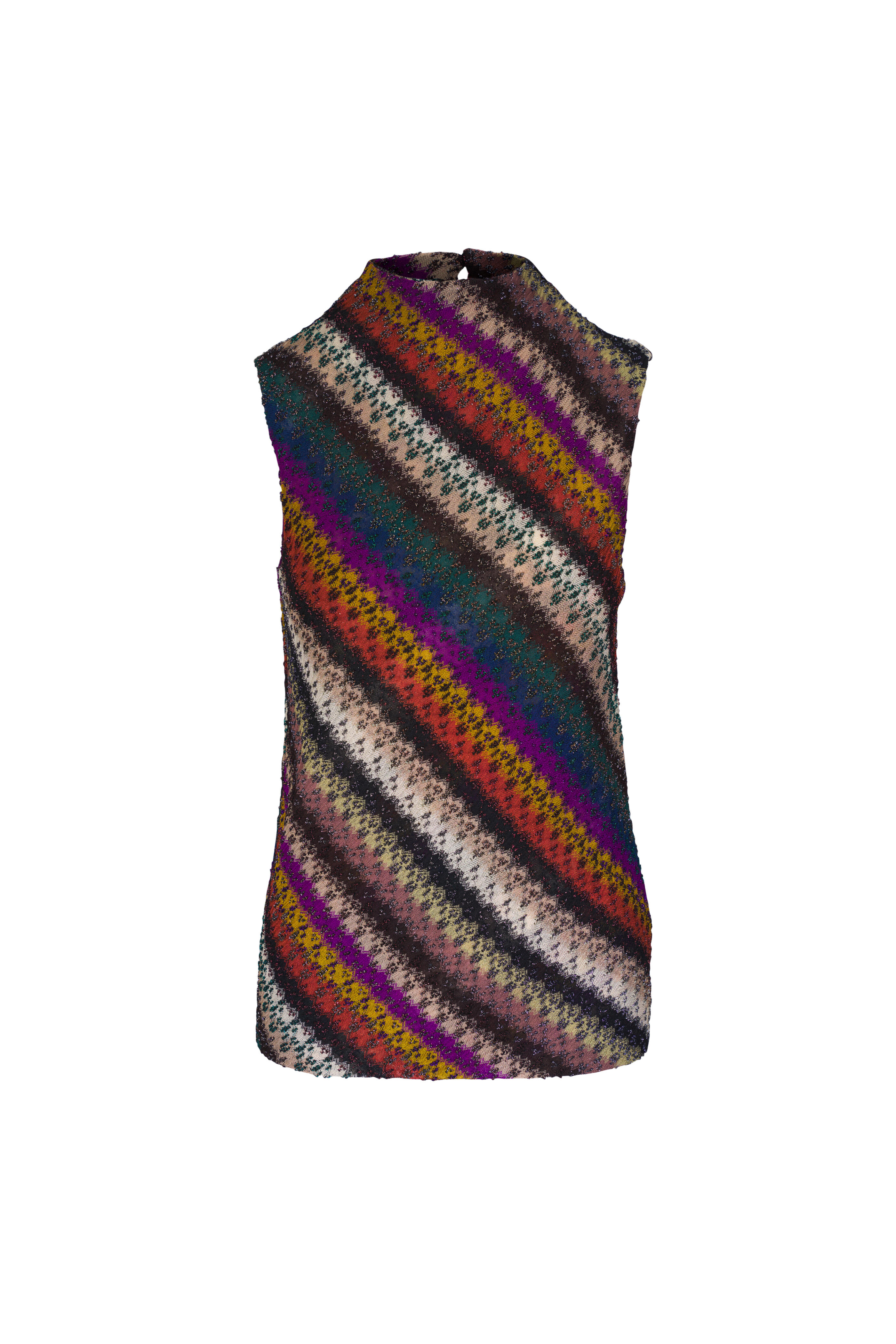 Mock neckline. Three button keyhole back. Made in Italy. 91% viscose, 9% metallized fiber. Dry clean.