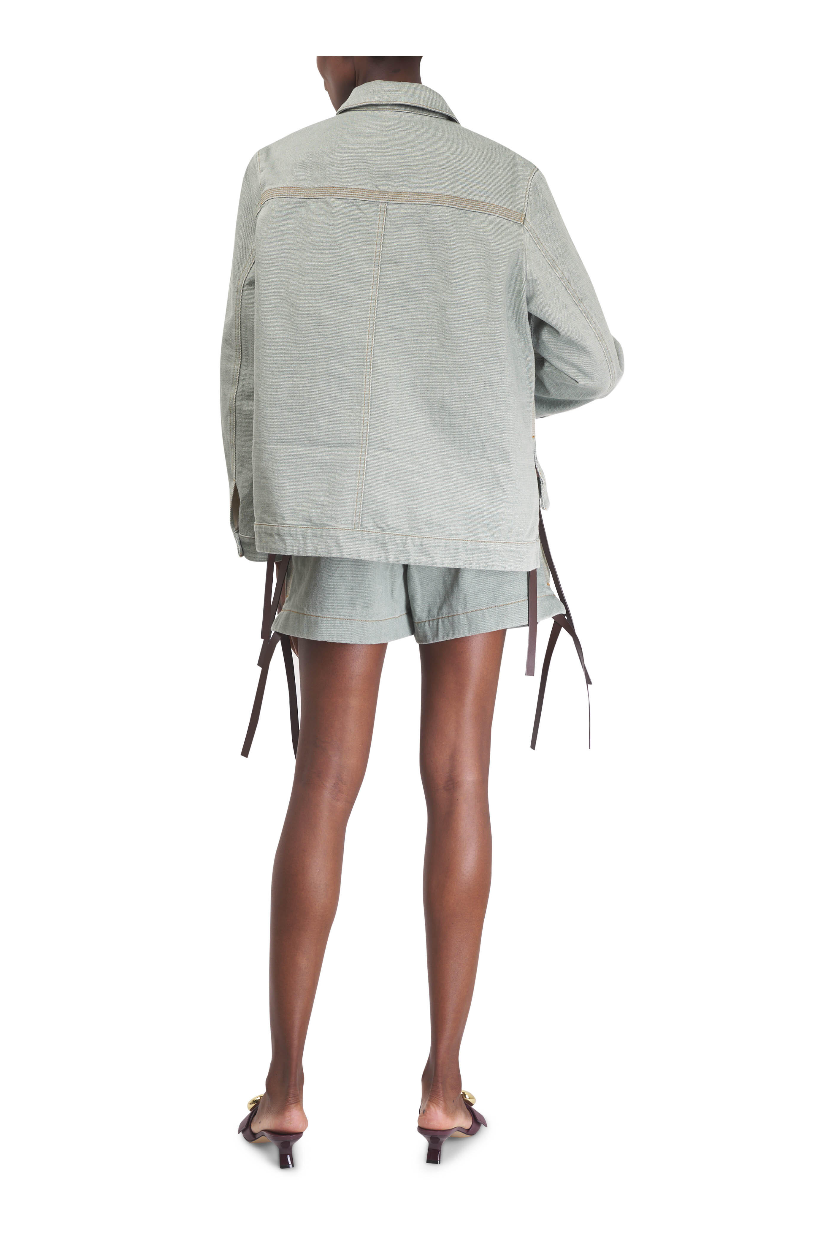 - Vented hem; leather ties