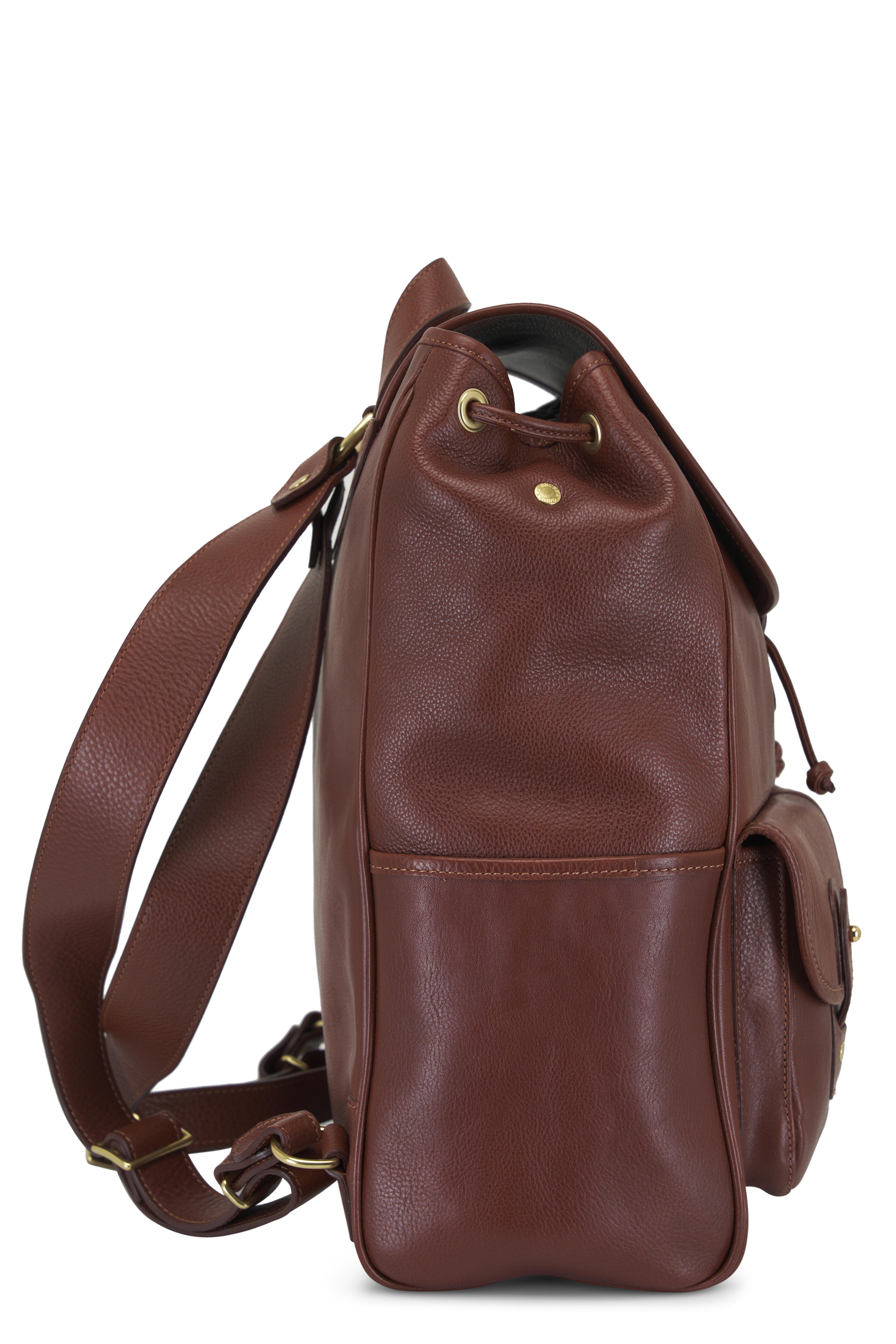 Italian vegetable-tanned, tumbled leather. Single top handle; adjustable shoulder straps. Two exterior flap pockets. Brass hardware. Interior key ring clip. Check cotton twill lining. Handcrafted in the USA. Color: Vintage Chestnut Leather. 12"L x 15”H x 6.25”W. Interior laptop sleeve, 12” L. Interior zip pocket, 9” L. 3.9 lb.