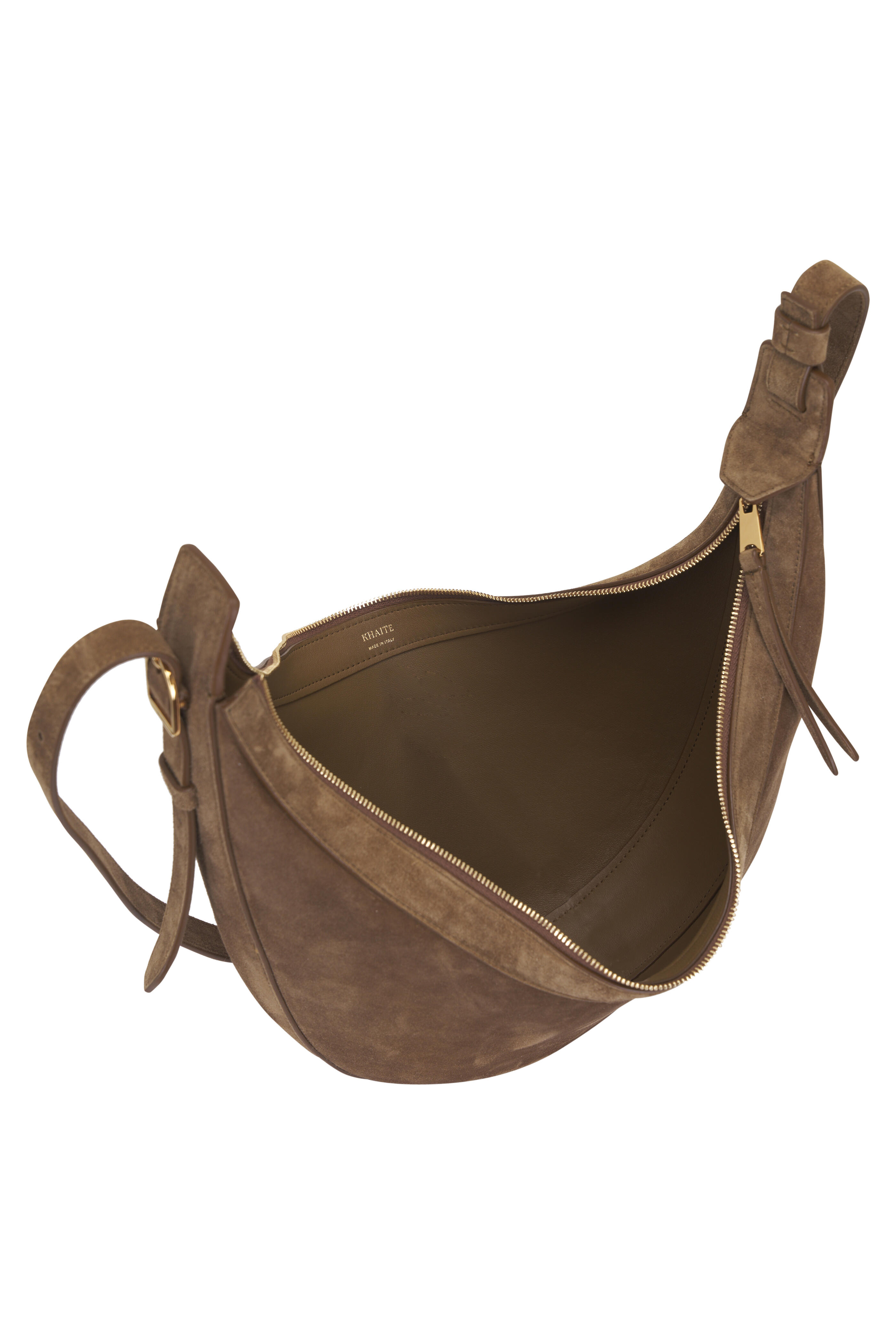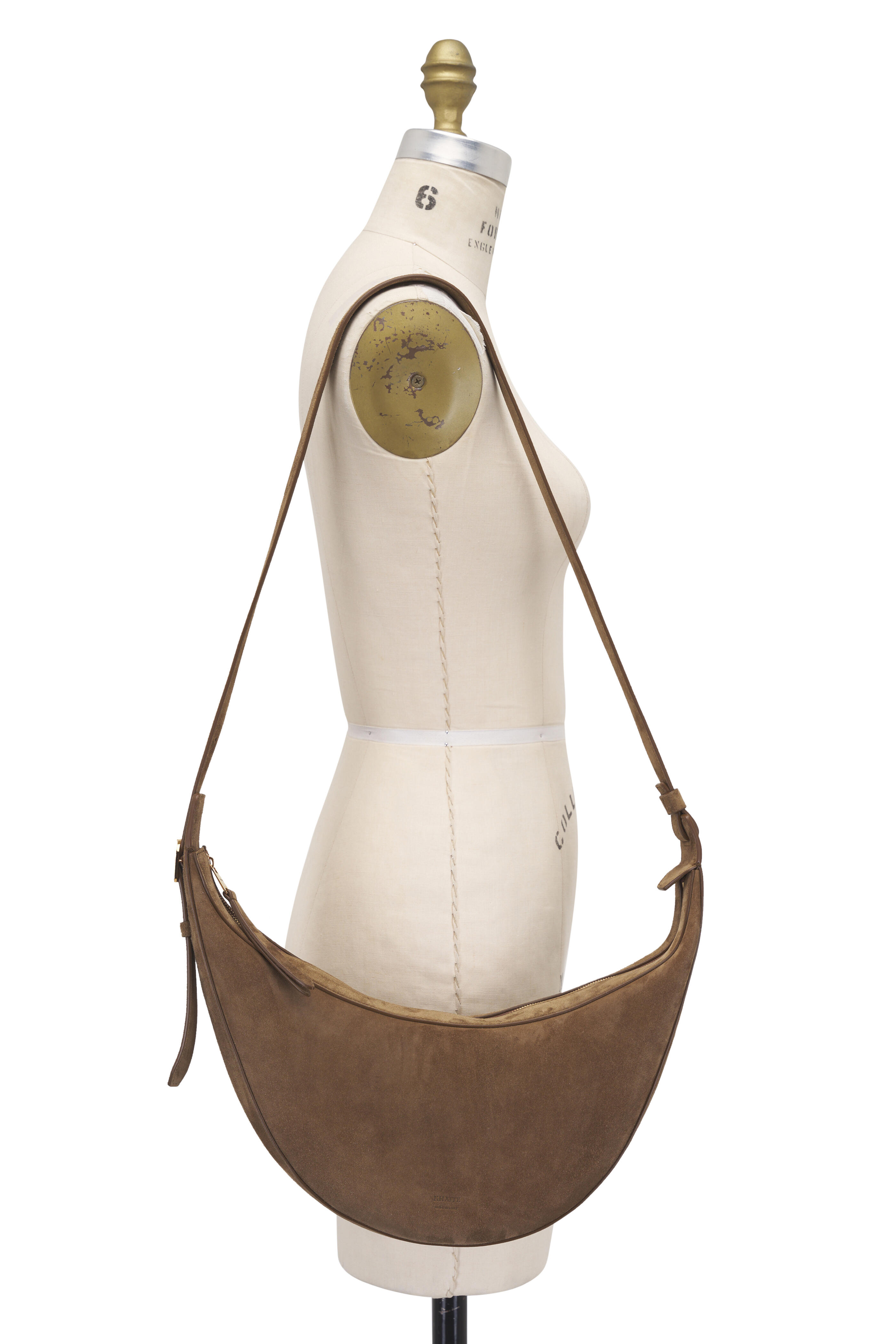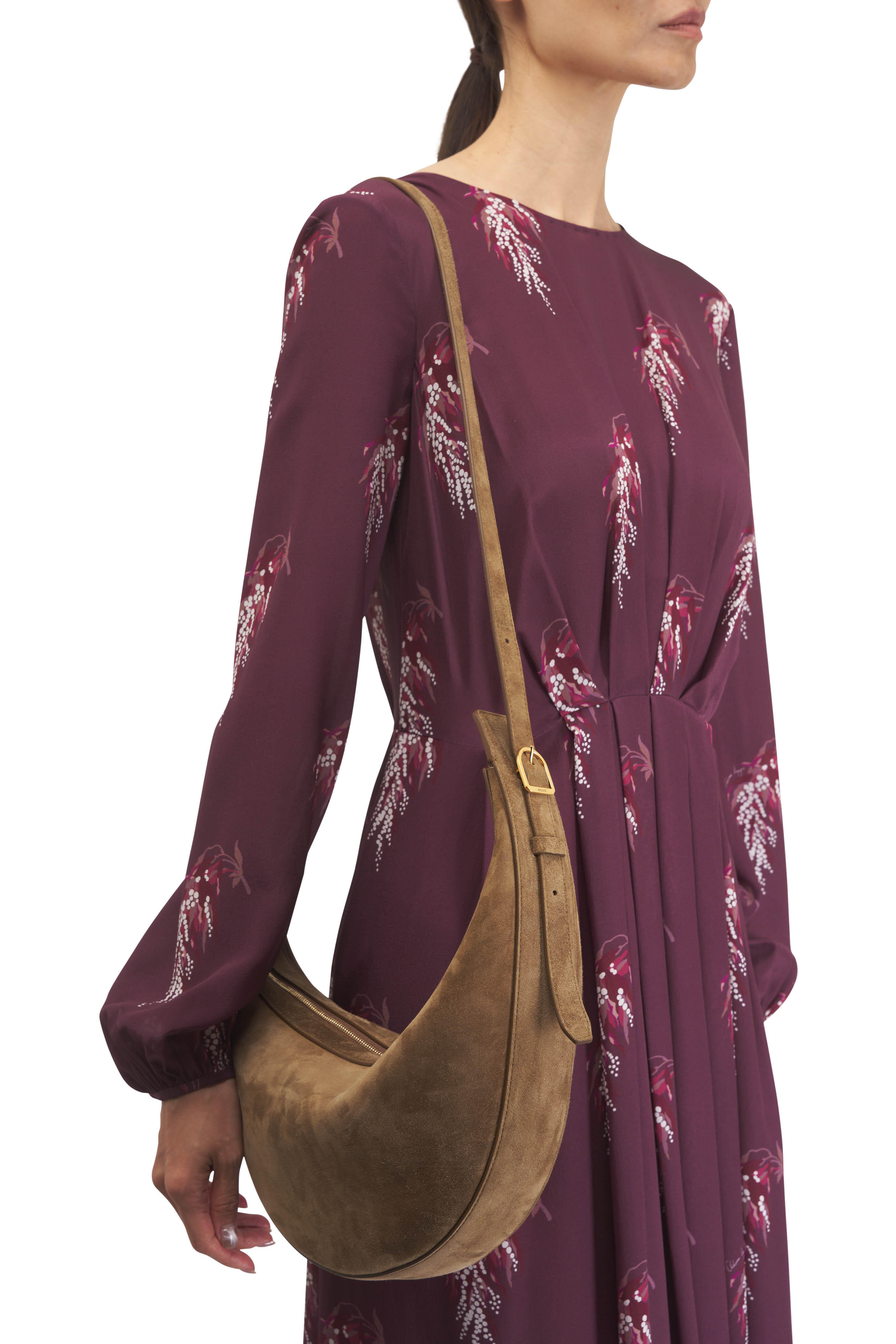 Suede. Adjustable shoulder strap. Top zip. Leather lined. Made in Italy. Length: 9.2 in/23.4 cm. Width: 2.2 in/5.6 cm. Height: 2.8 in/7 cm. Can be worn shoulder or crossbody.