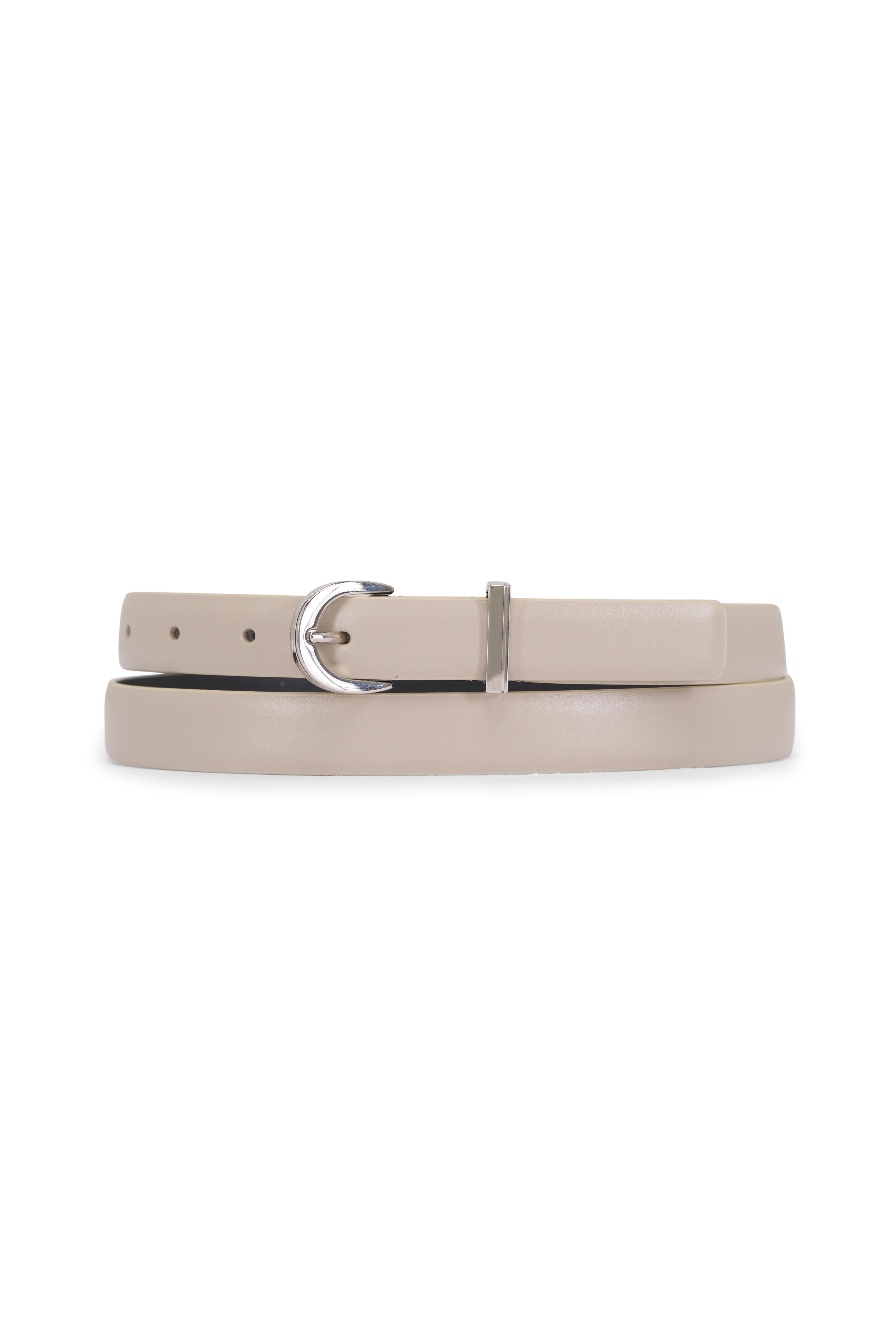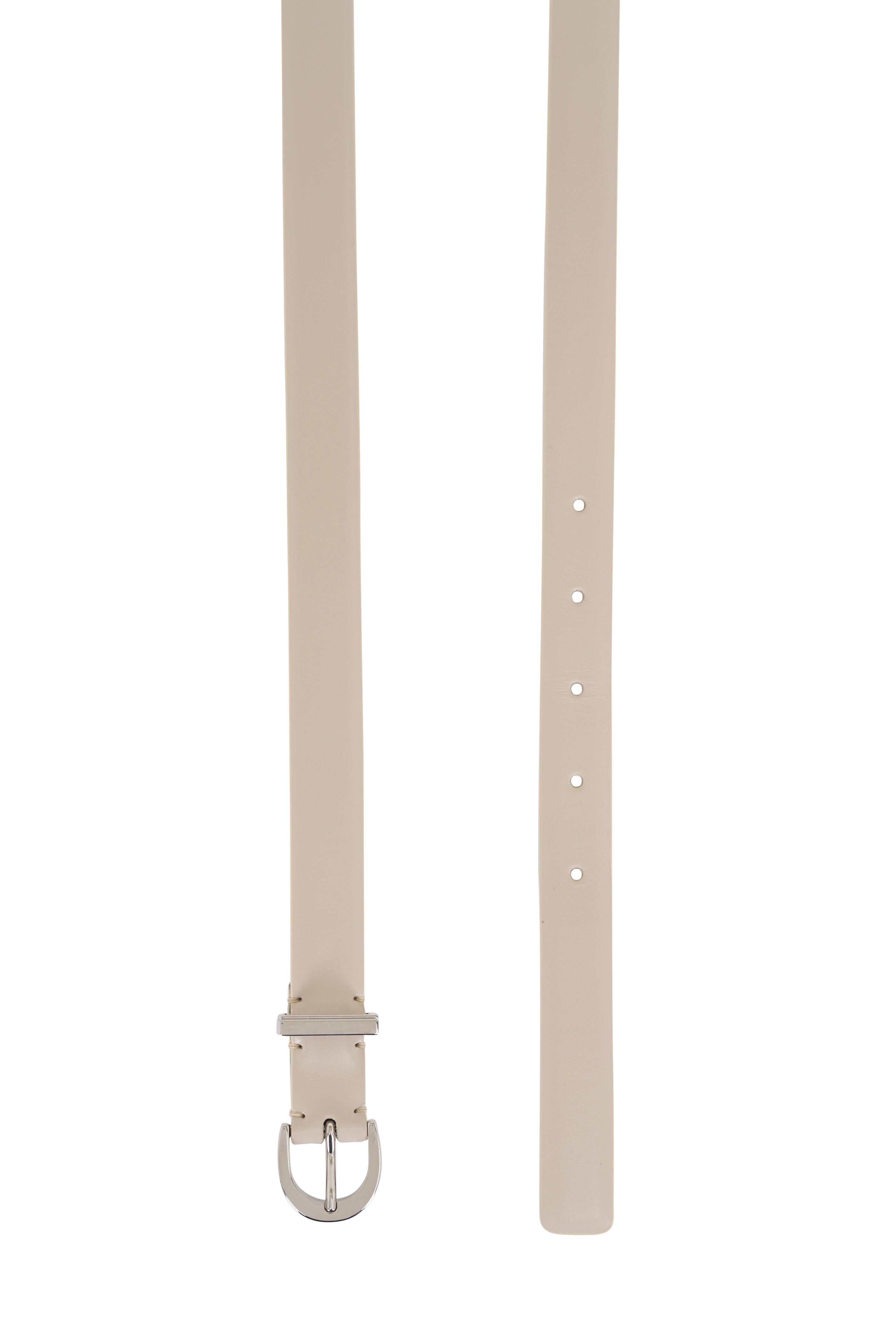 Calfskin. Square-rounded tip. Single loop keeper. Sculpted D-shaped buckle. Palladium plated brass hardware. Made in Italy. Approximately 20mm width.