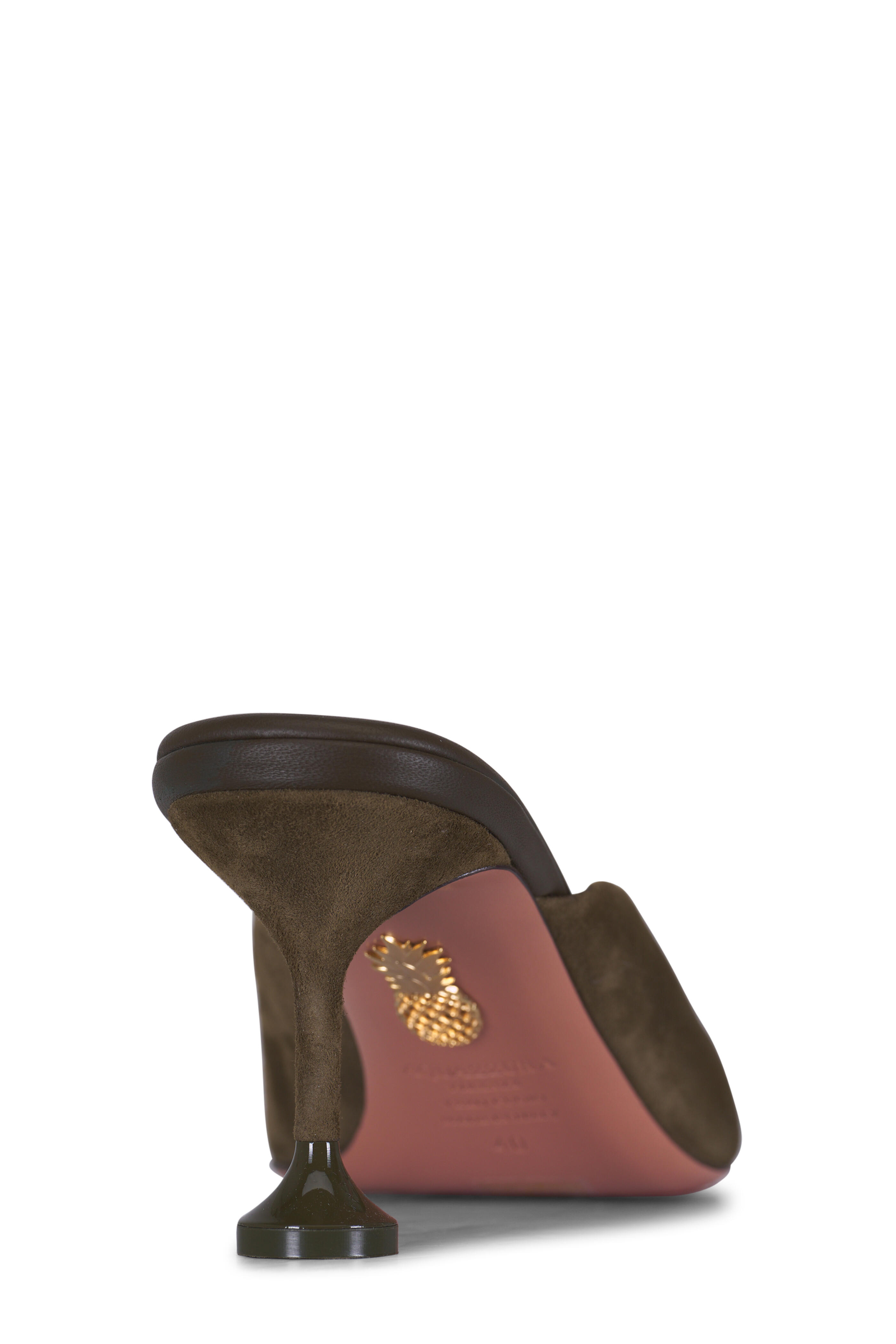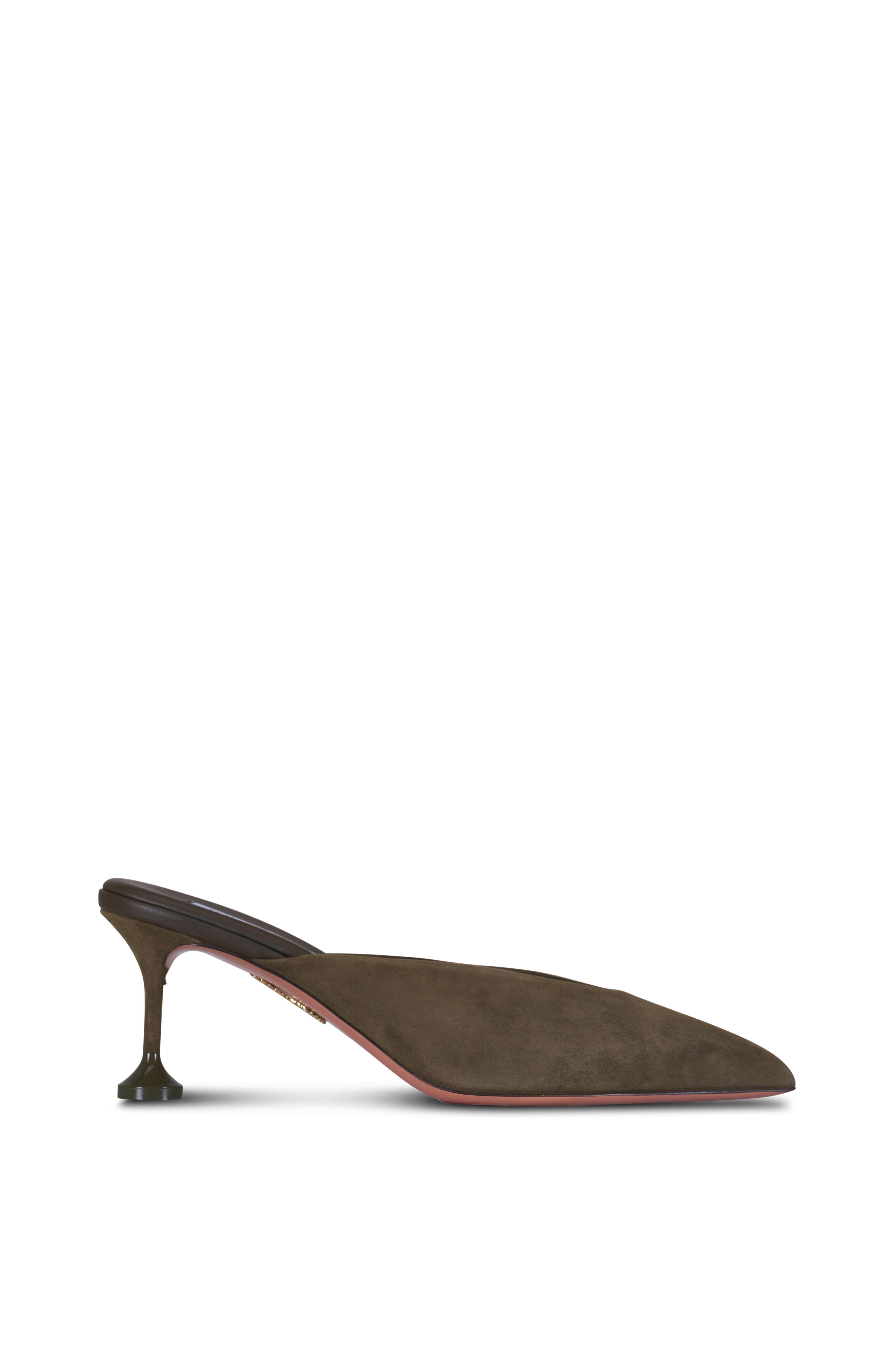 Suede upper. Pointed toe. Slip-on style; open back. Leather lining and insole. Leather sole. Flute heel. Made in Italy. Heel measurement: 65mm.