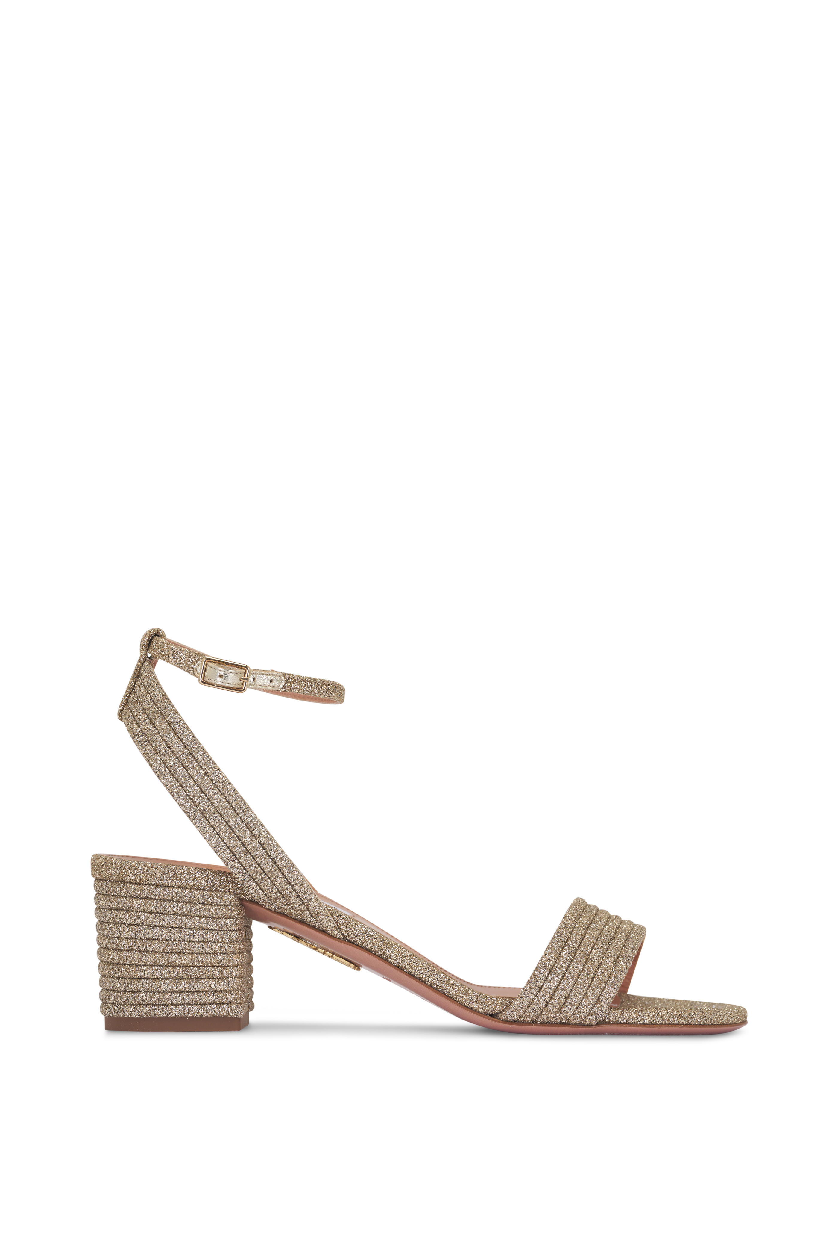 Metallic fabric upper. Round, open toe. Sculptural straps on vamp. Adjustable buckle ankle strap. Leather lining and insole. Self covered heel. Leather sole. Made in Italy. Heel measurement: 50mm.