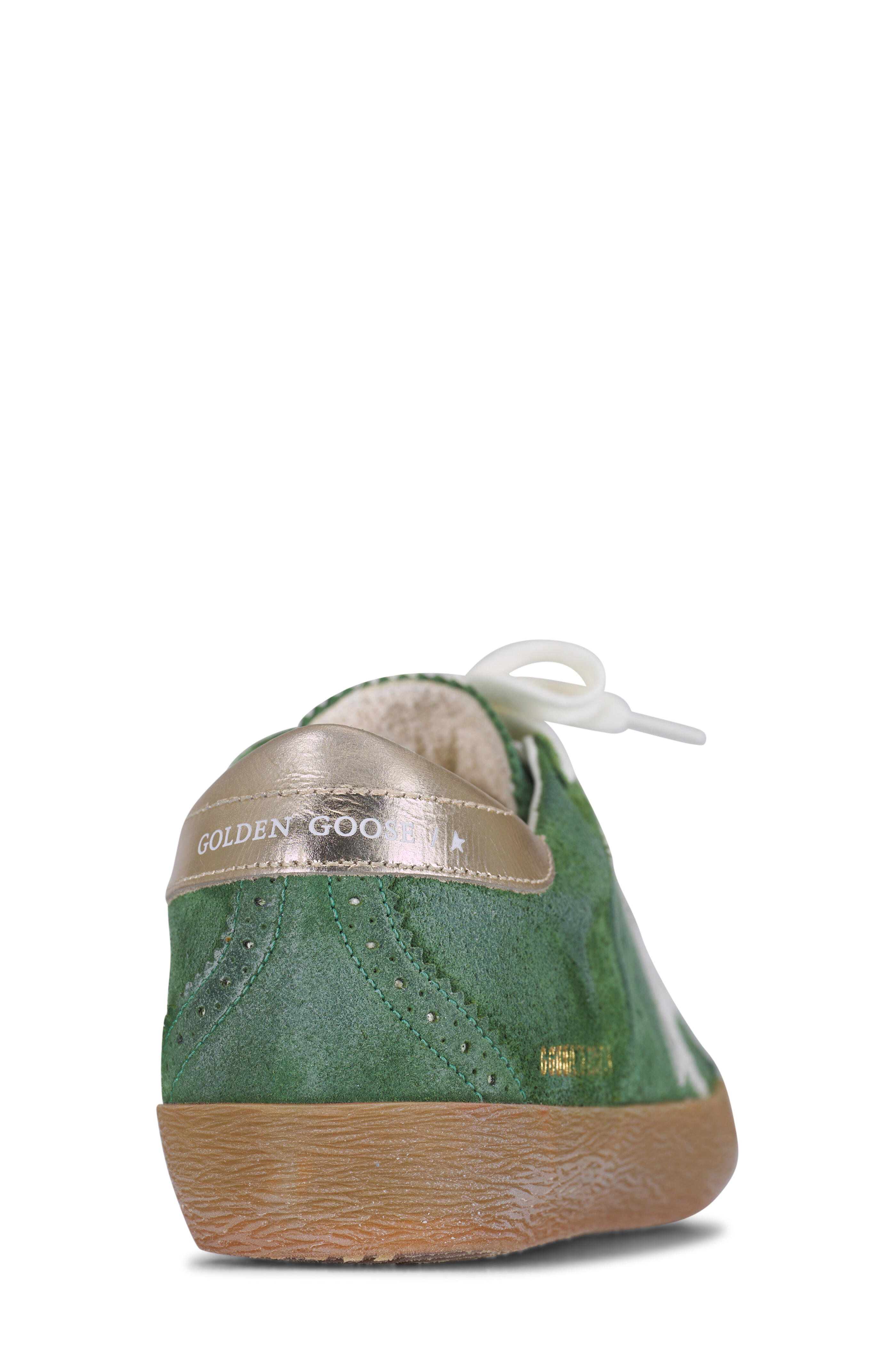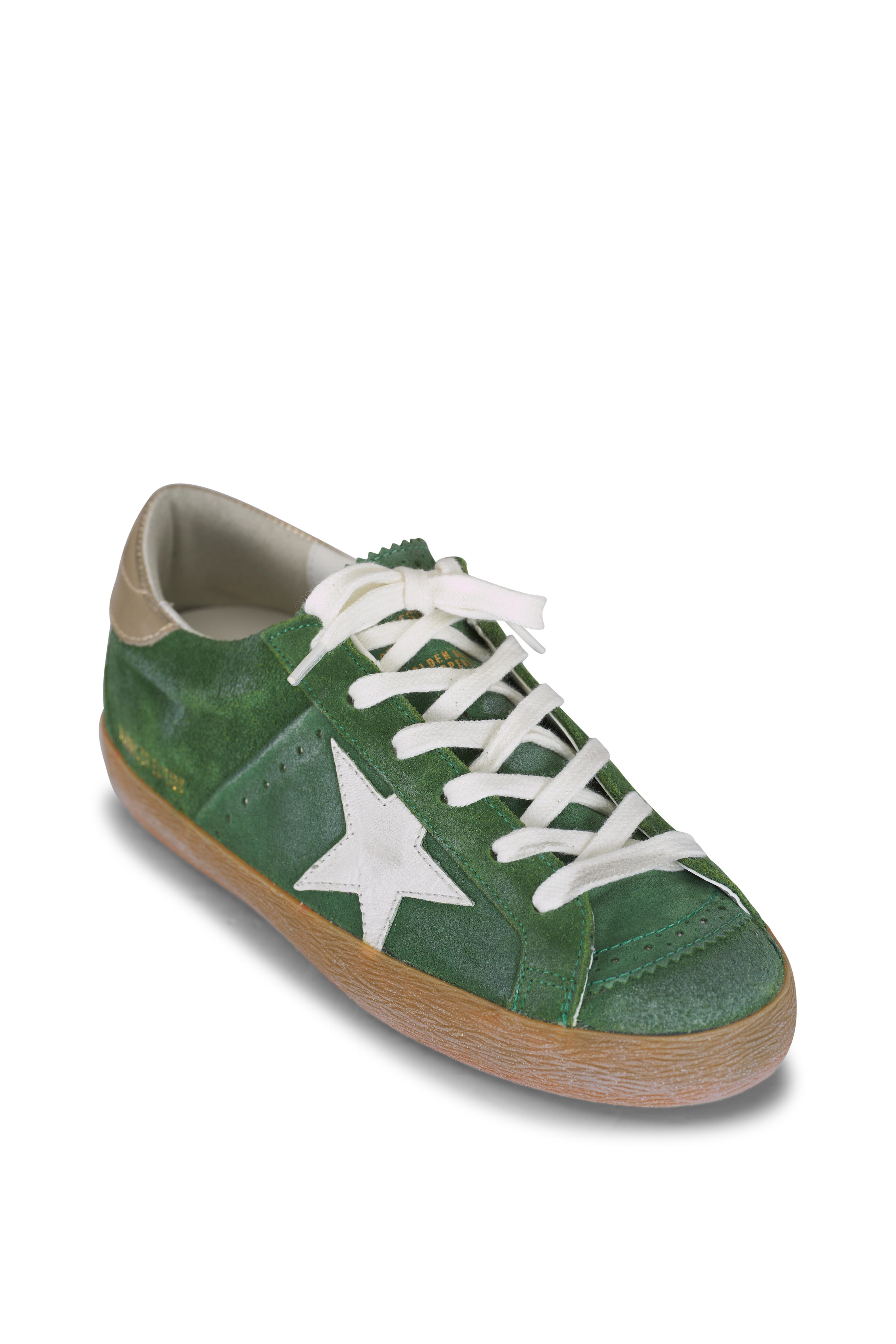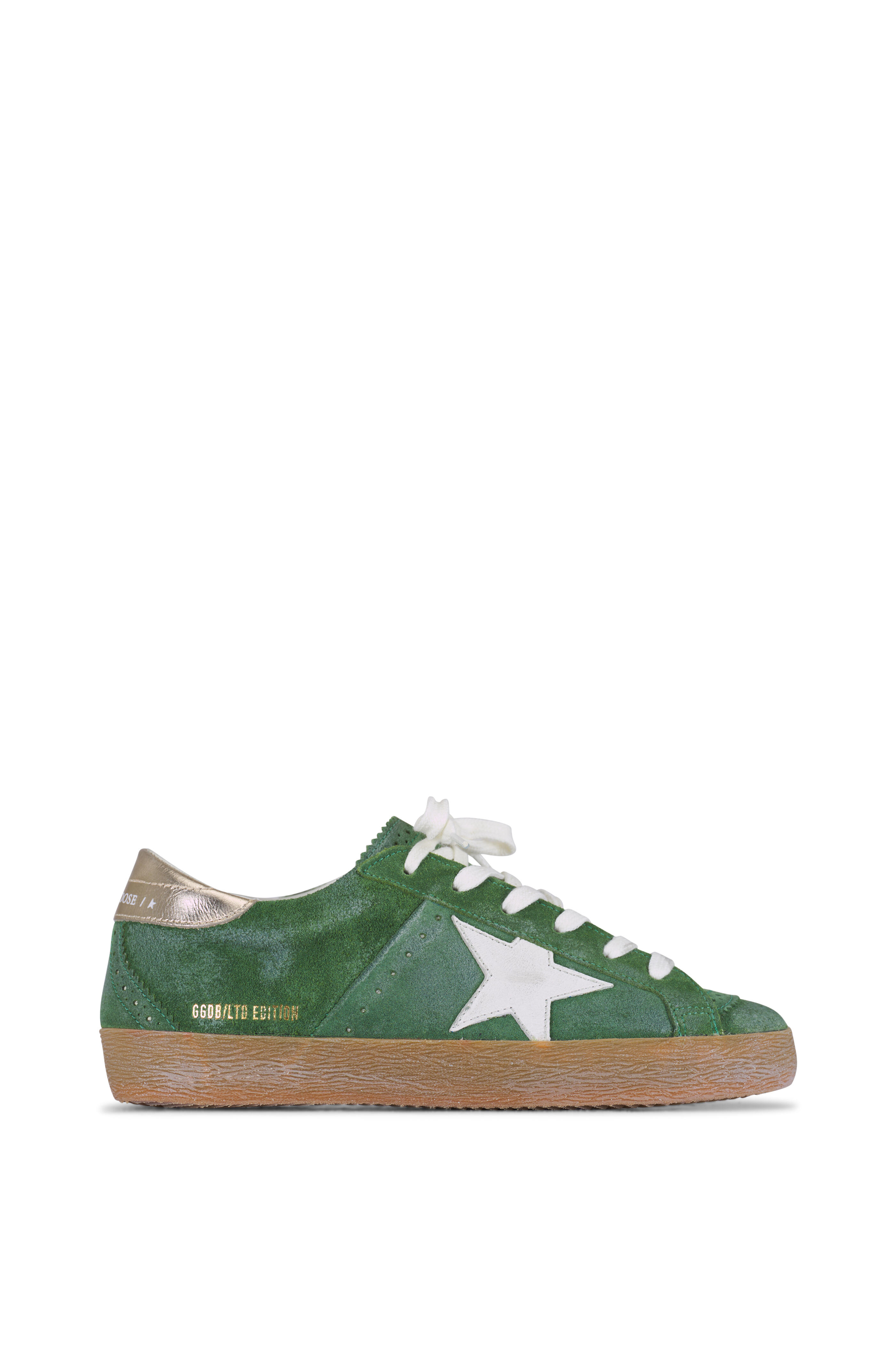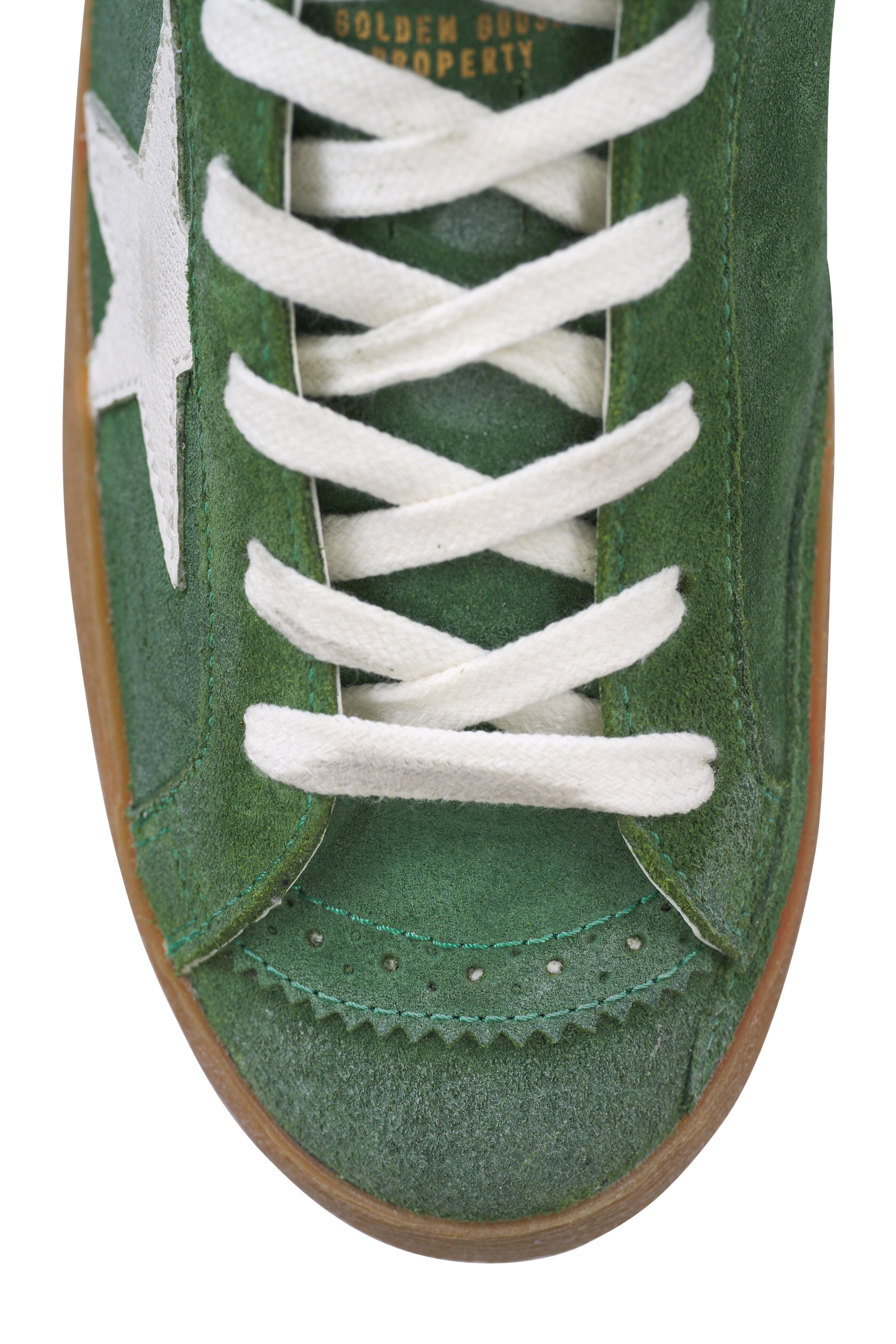 Suede upper. Round toe. Lace up closure. Leather star on side. Embossed logo detail. Gold metallic leather heel tab. Leather lining and insole. Rubber sole. Made in Italy.
