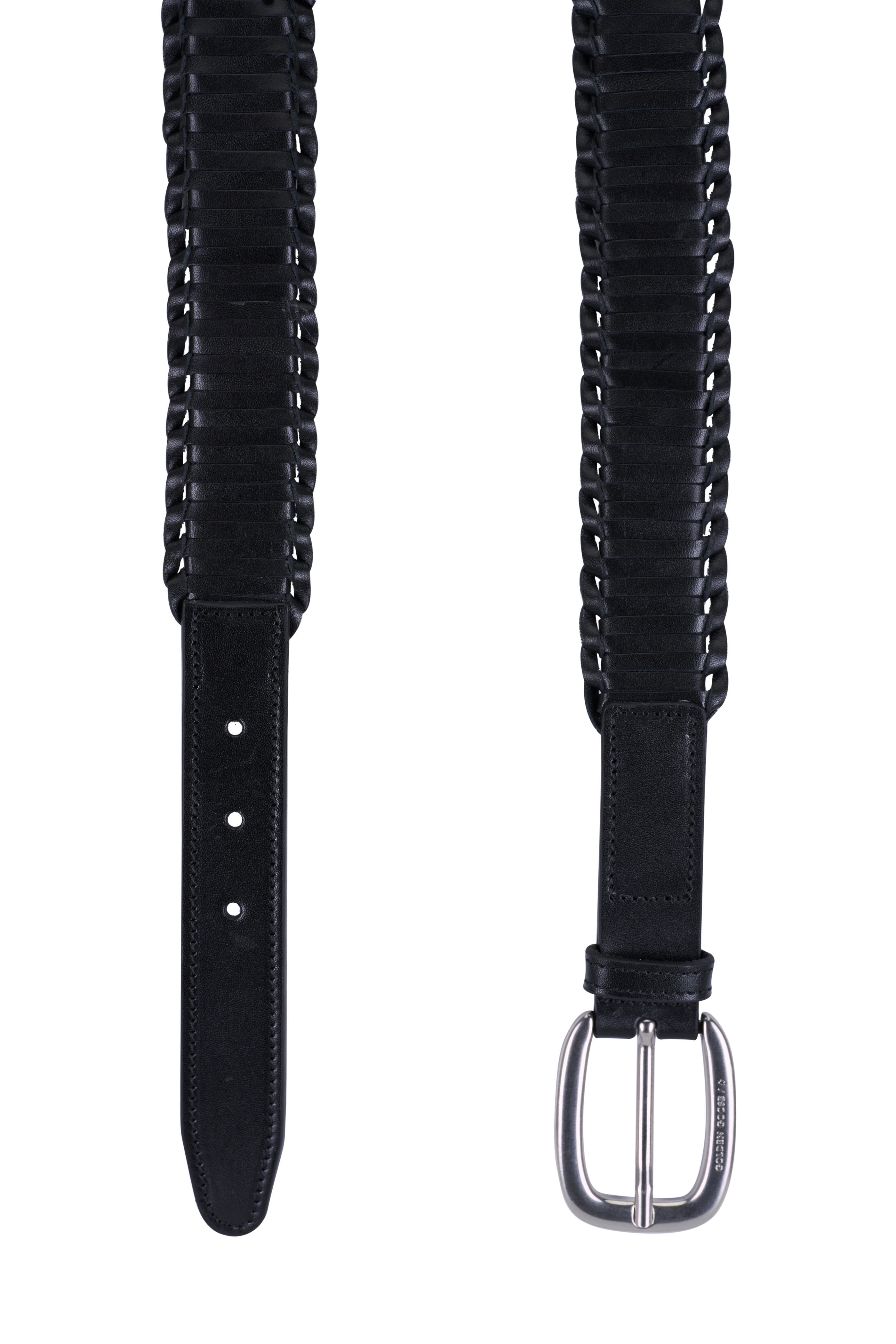 Woven leather. Square buckle. Tapered tip. Silver-tone hardware. Made in Italy. About 1.5" width.