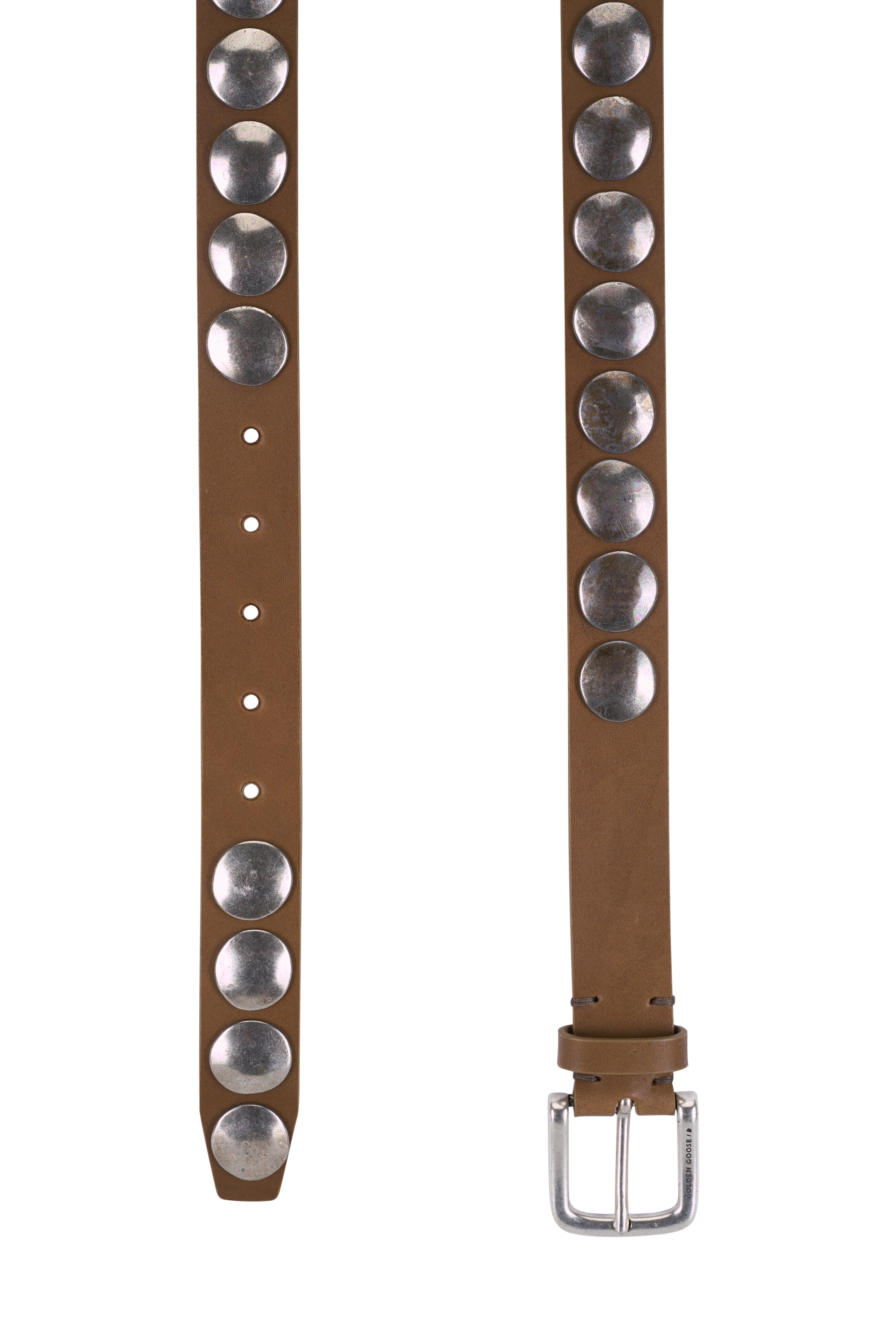 Leather. Square metal buckle. Single loop keepers. Silver-toned hardware. Pointed tip. Stud detailing. Made in Italy. About 1.25" width.