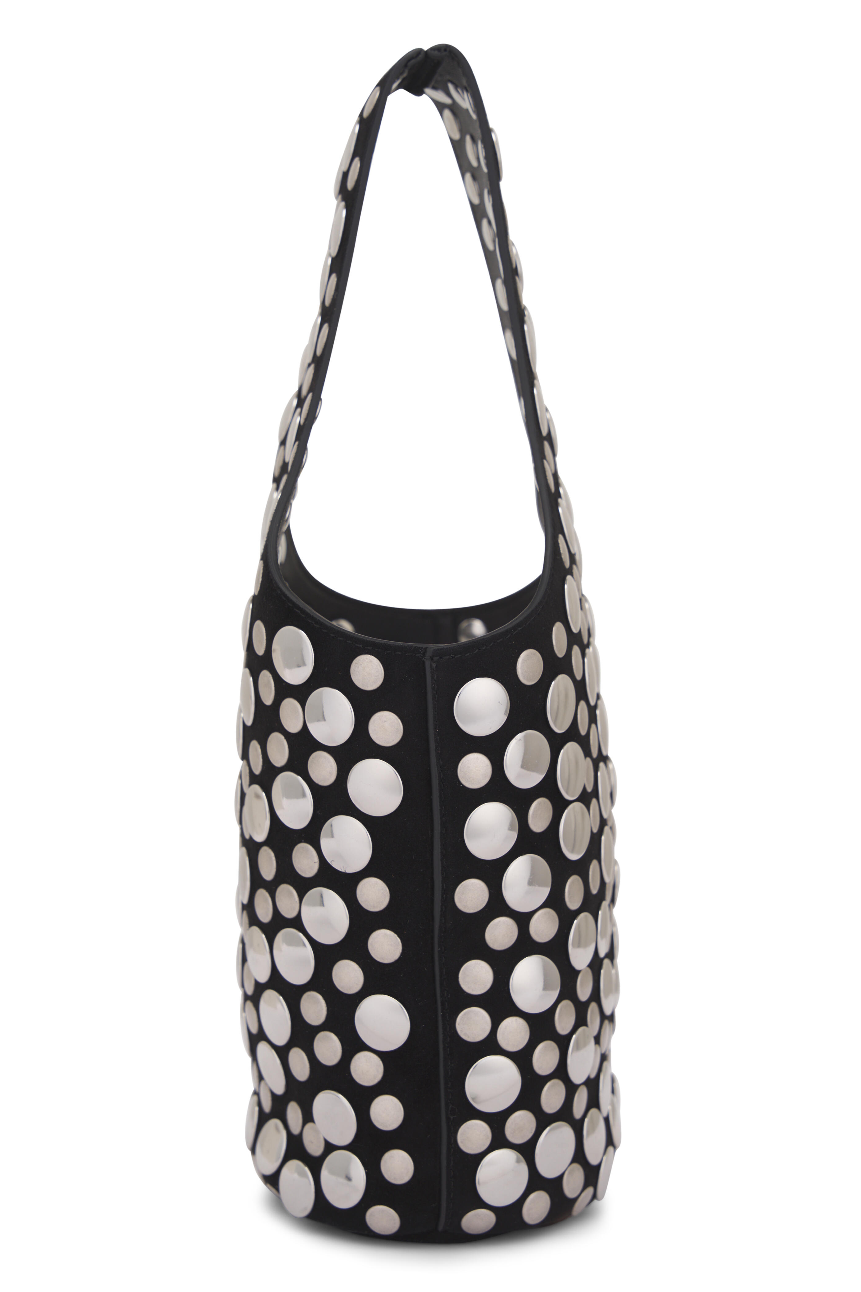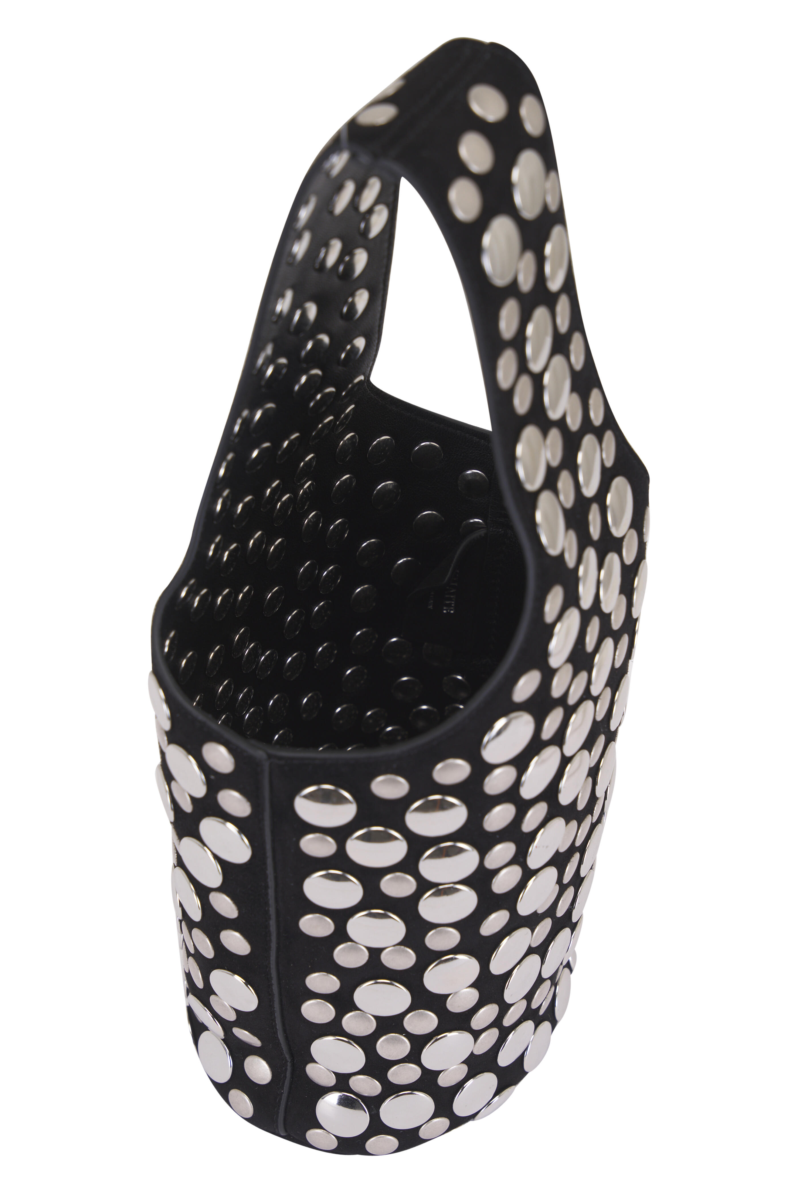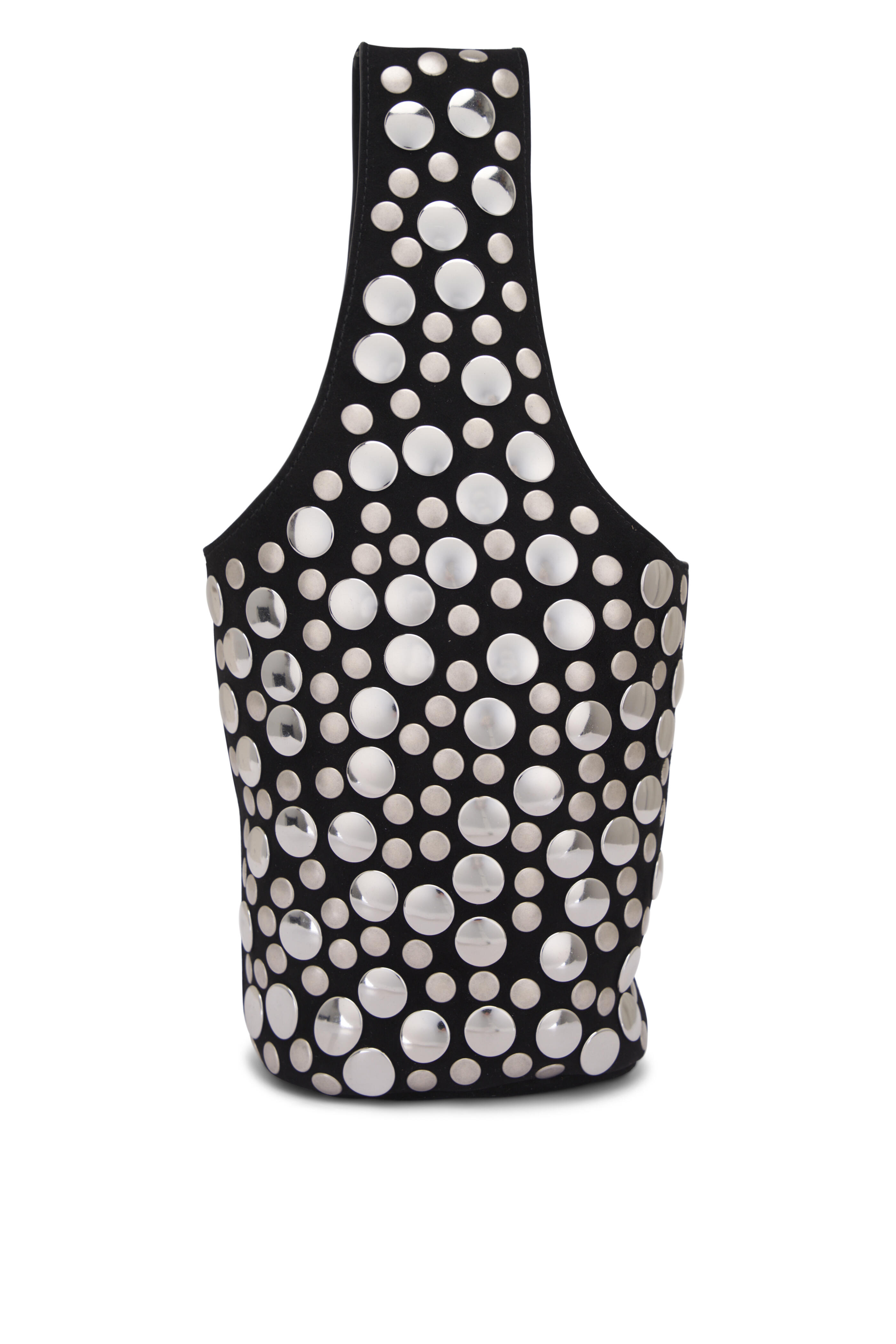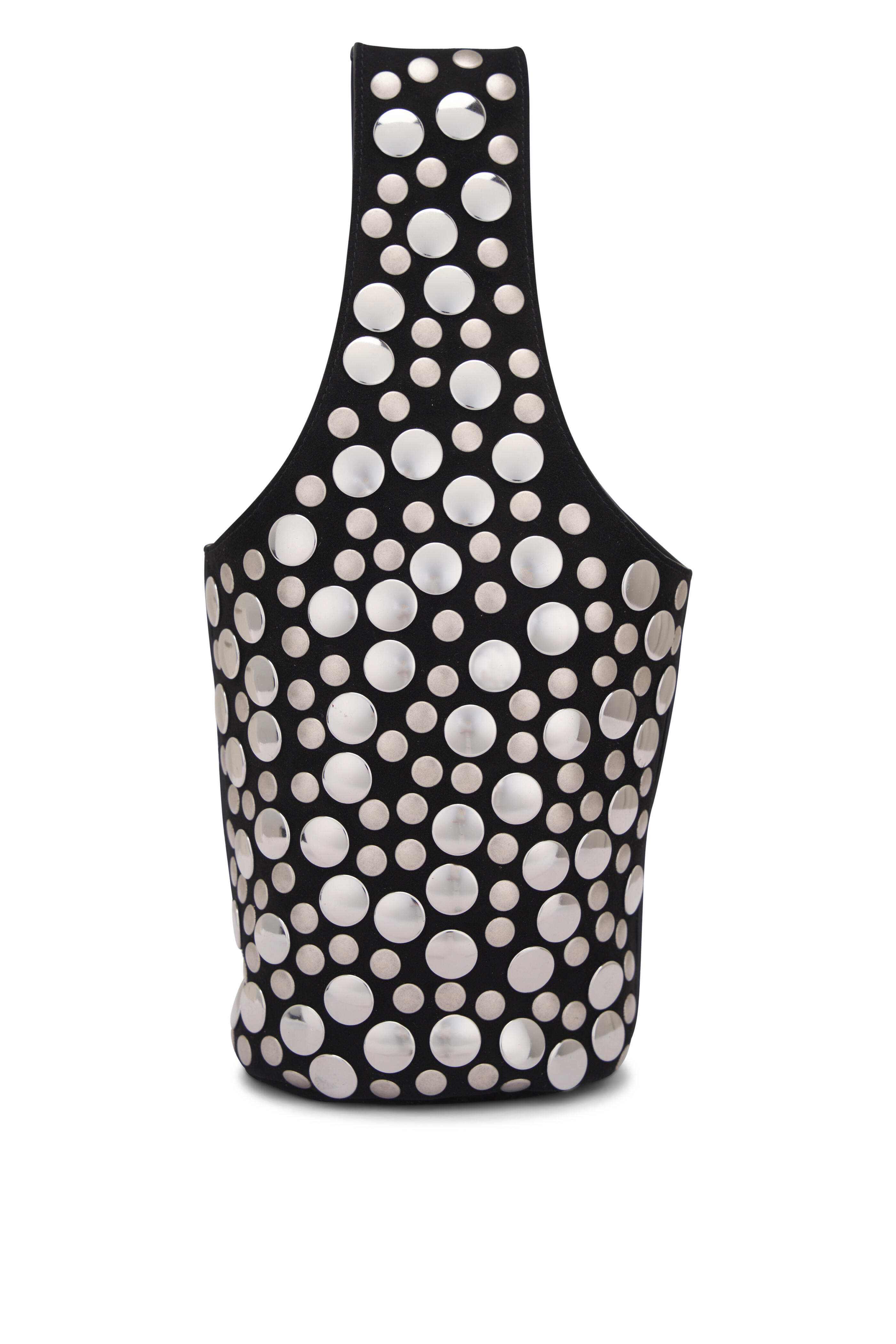 Suede. Single top handle. Open top. Single open compartment. Silver-tone stud detailing. Made in Italyl. Length: 7.5 in19 cm. Width: 5 in12.7 cm. Height: 12.5 in31.8 cm. Handle Drop: 7 in17.8 cm.