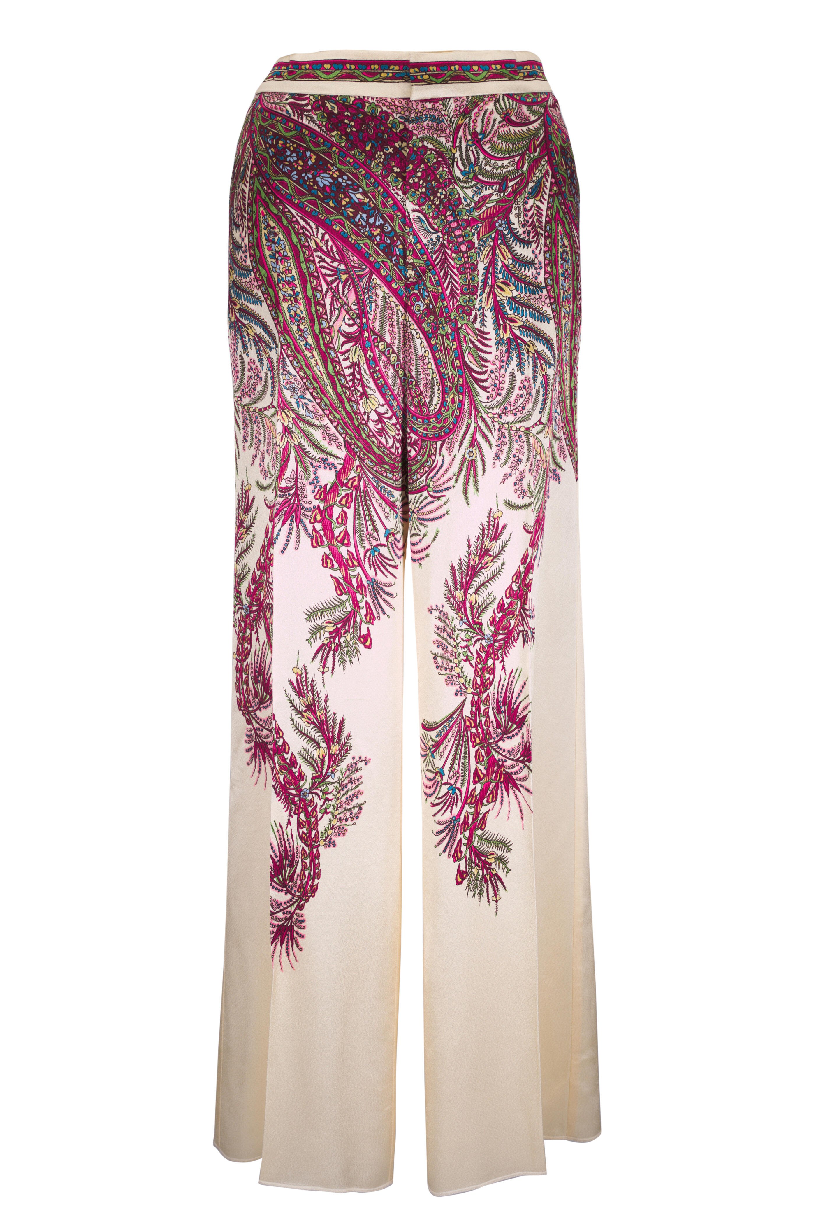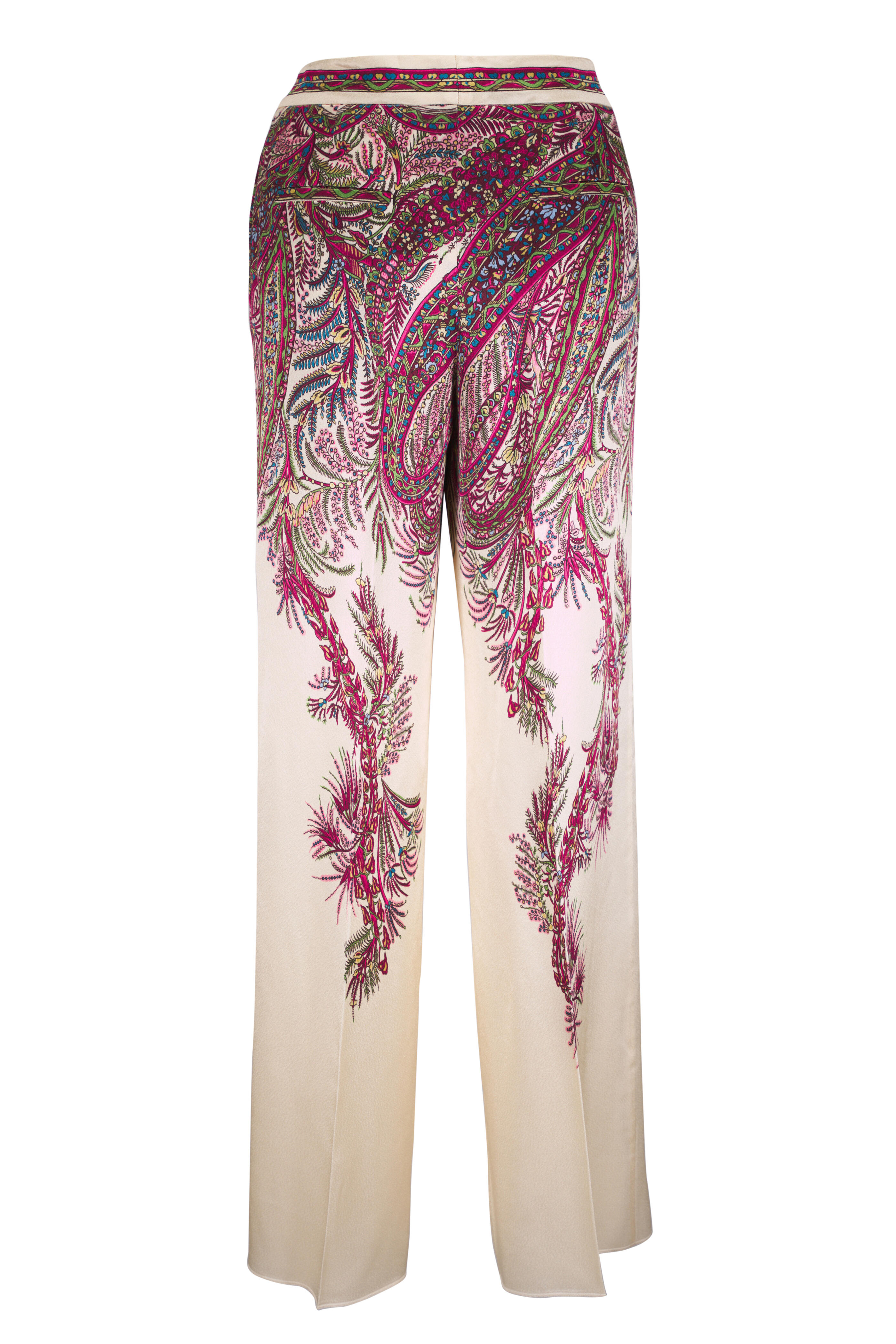 Zip fly; hook and button closure. Side slip pockets; rear welt pockets. Crease detail on front. Straight hem. Made in Italy. 36" Inseam (size 4). 100% viscose. Dry clean.