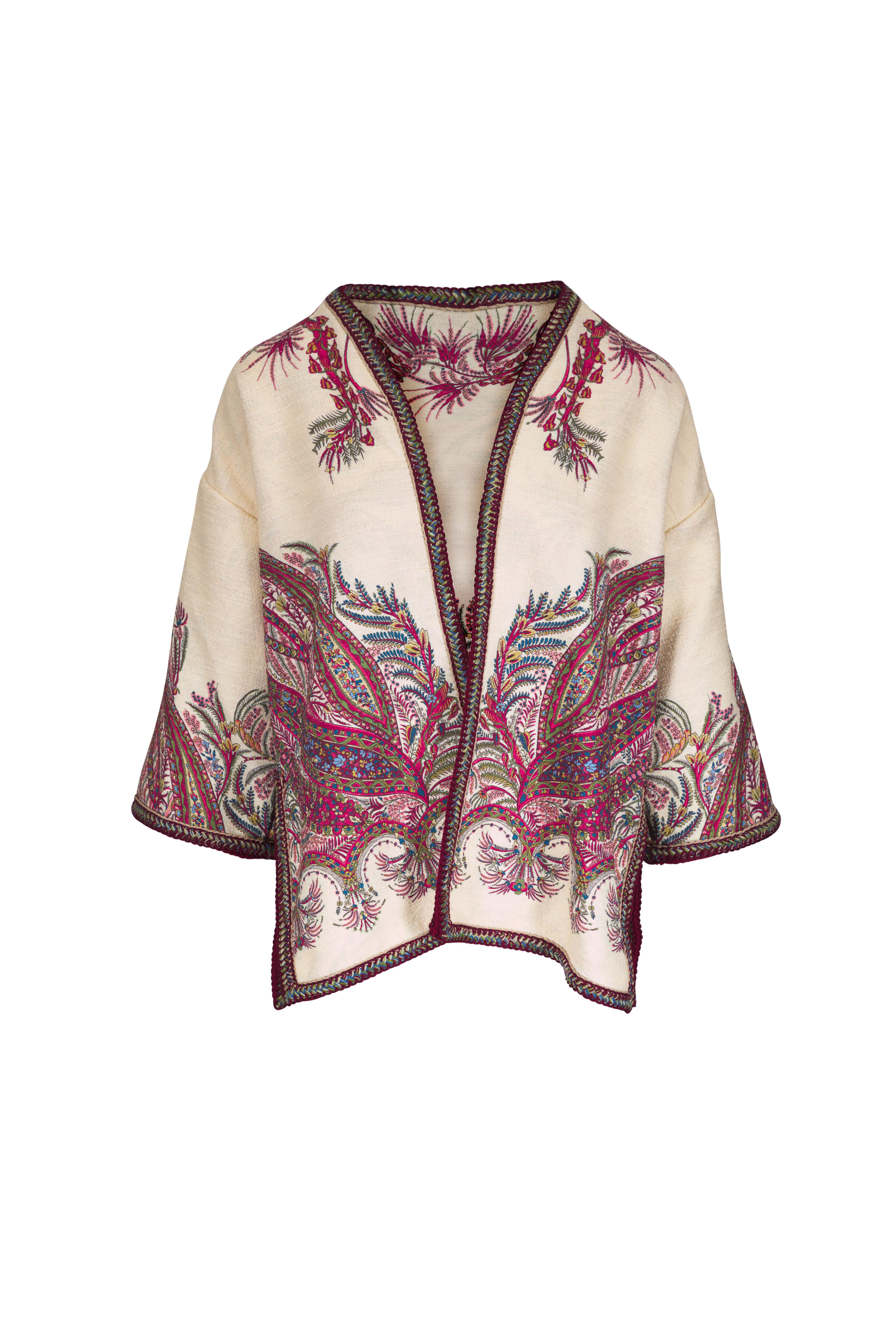 Open front. Kimono sleeves. Contrasting braided trim. Vented hem. Made in Italy. Approximately 30" shoulder to hem. 100% polyester. Dry clean.