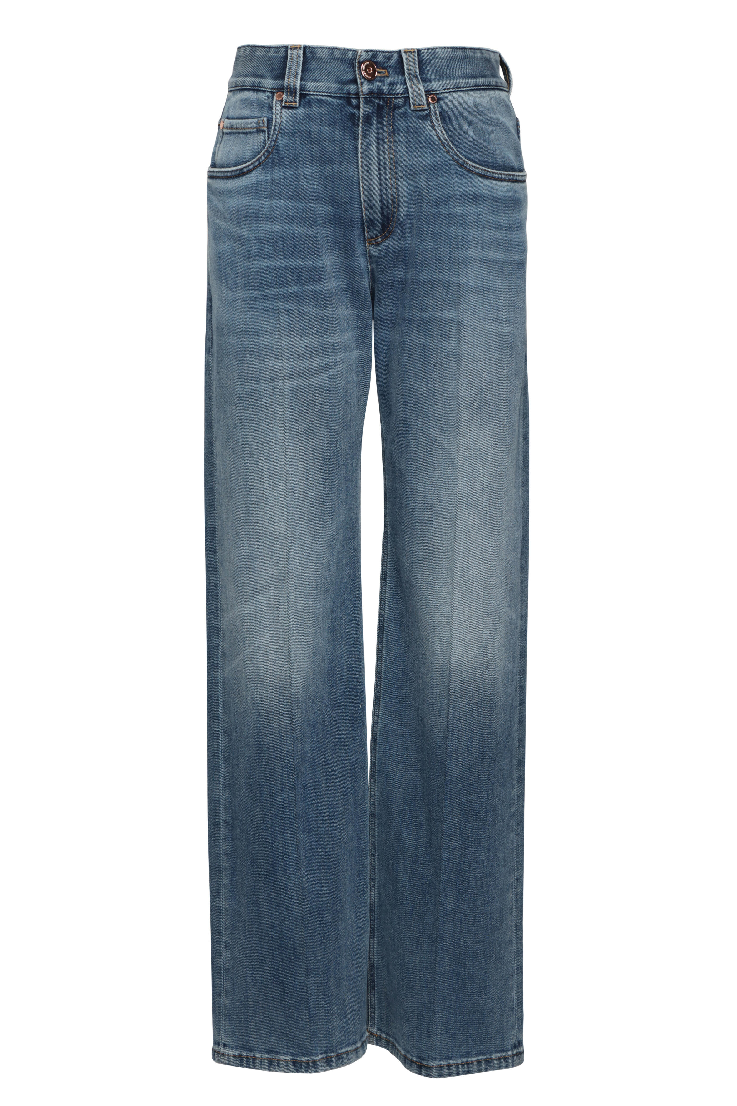 Mid rise. Button closure. Zip fly. Belt loops. Five pocket style. Straight silhouette. Loose fit. Denim fabrication. Made in Italy. Full length. 99% cotton, 1% elastane. Dry clean.
