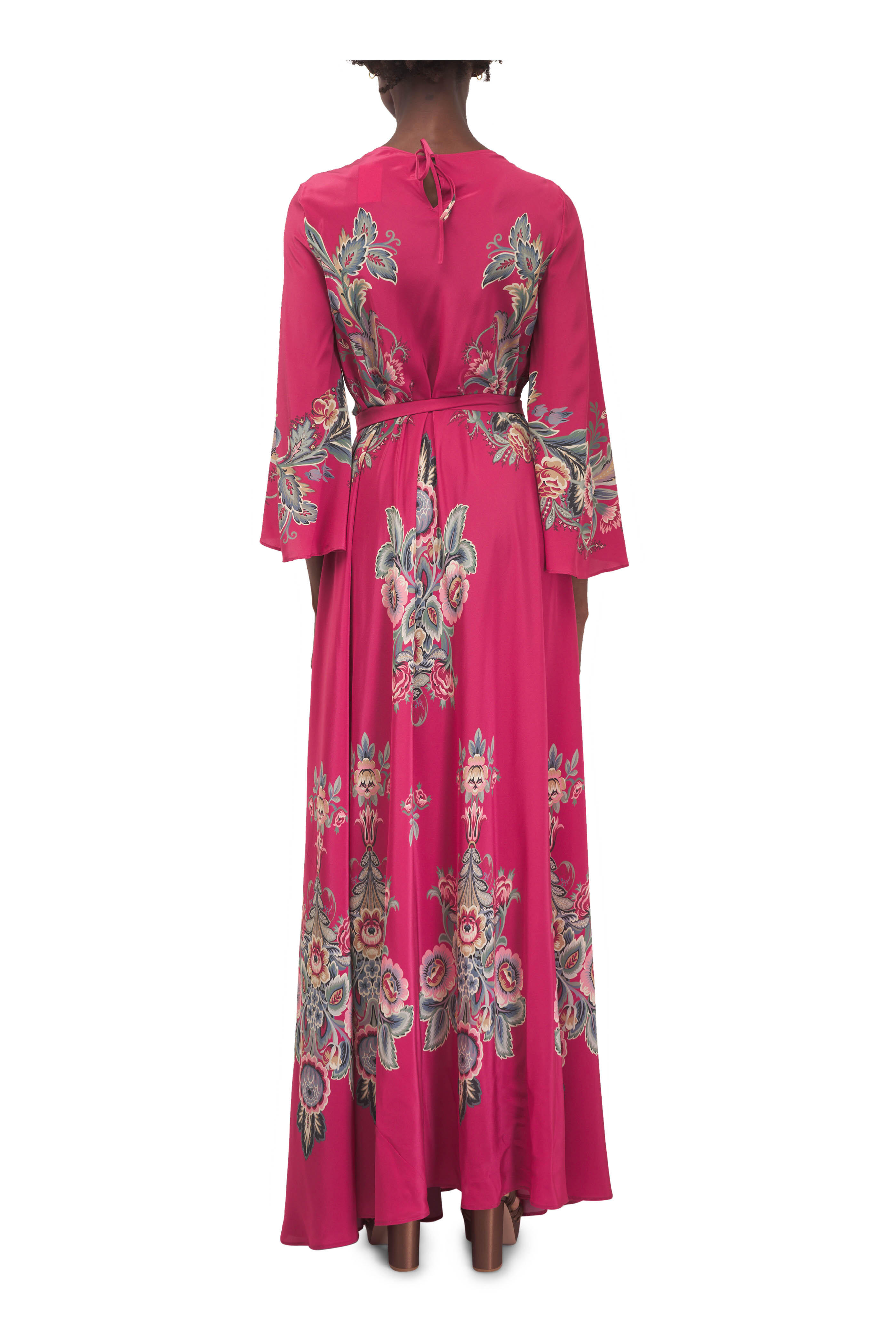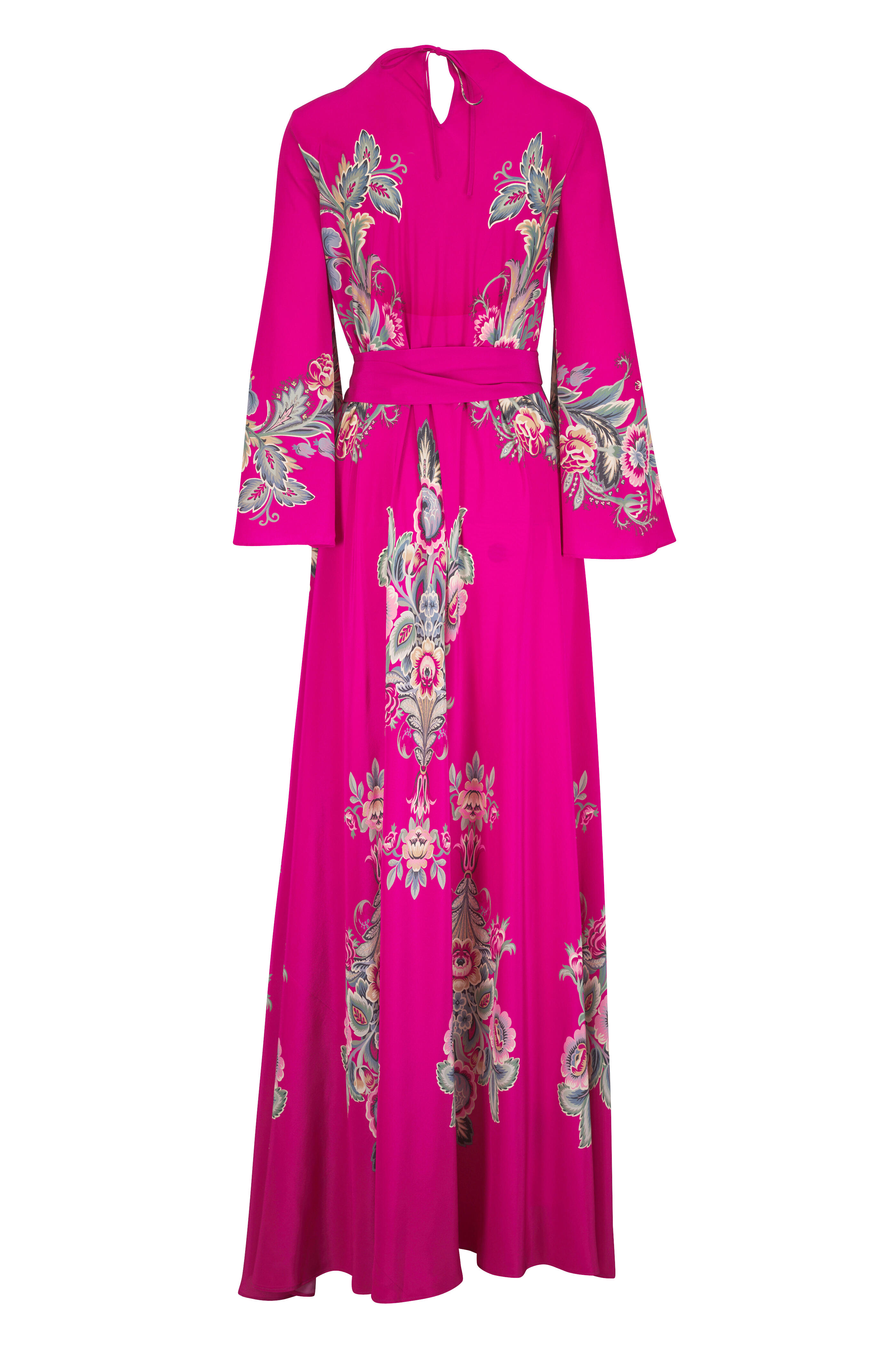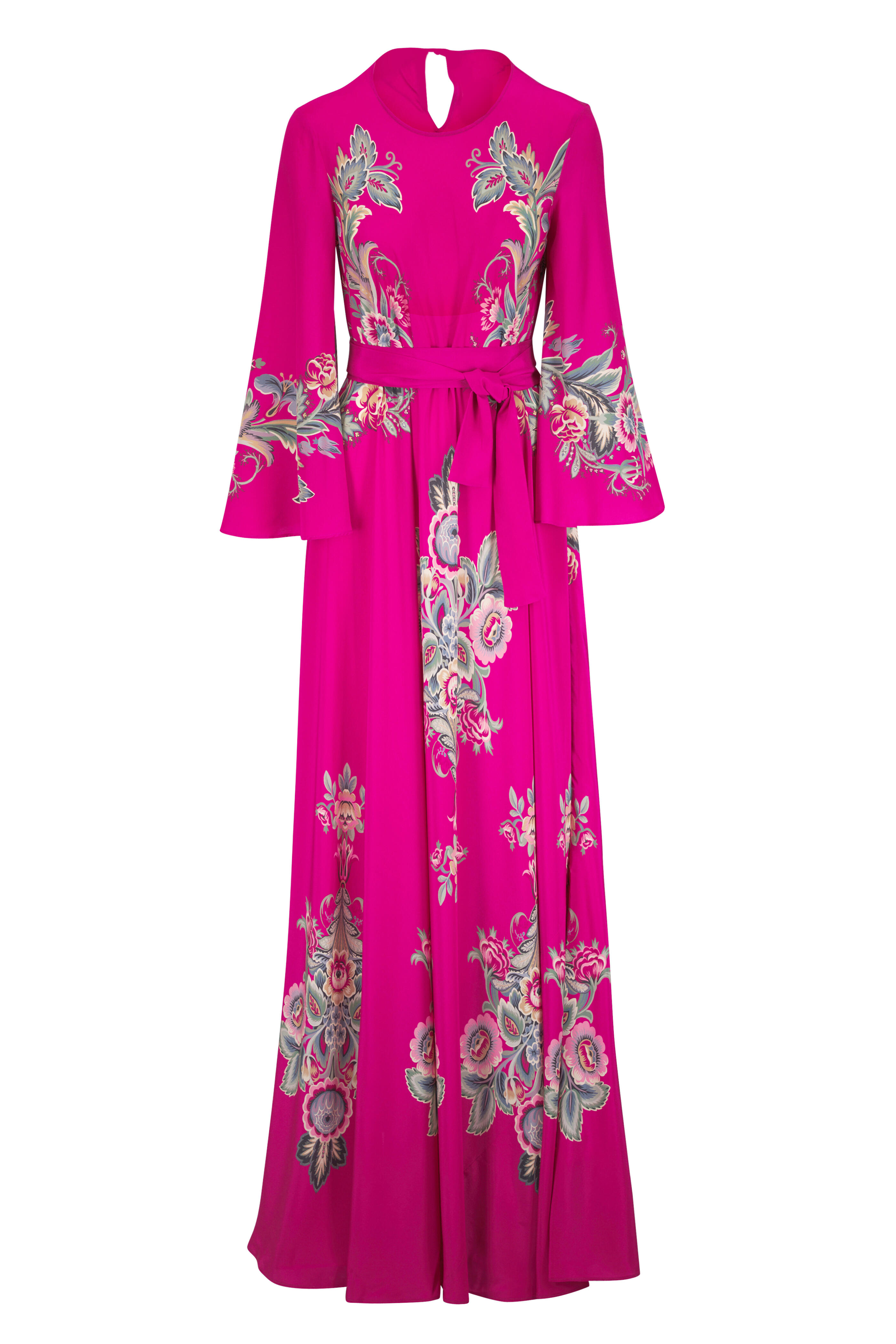 Crew neckline. Keyhole back closure. Self-tie removable belt. Bell sleeve. Made in Italy. About 64" shoulder to hem. 100% silk. Dry clean.