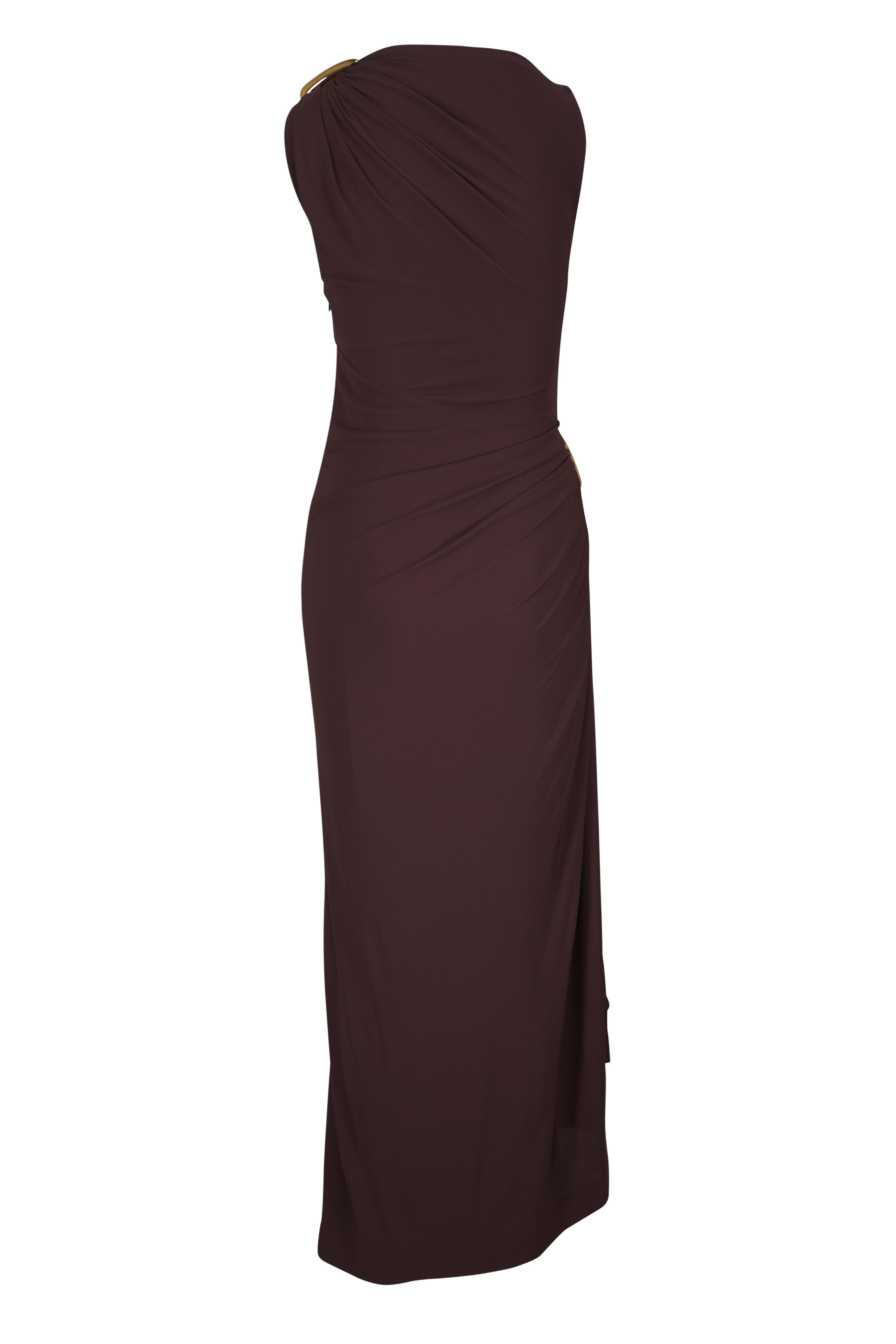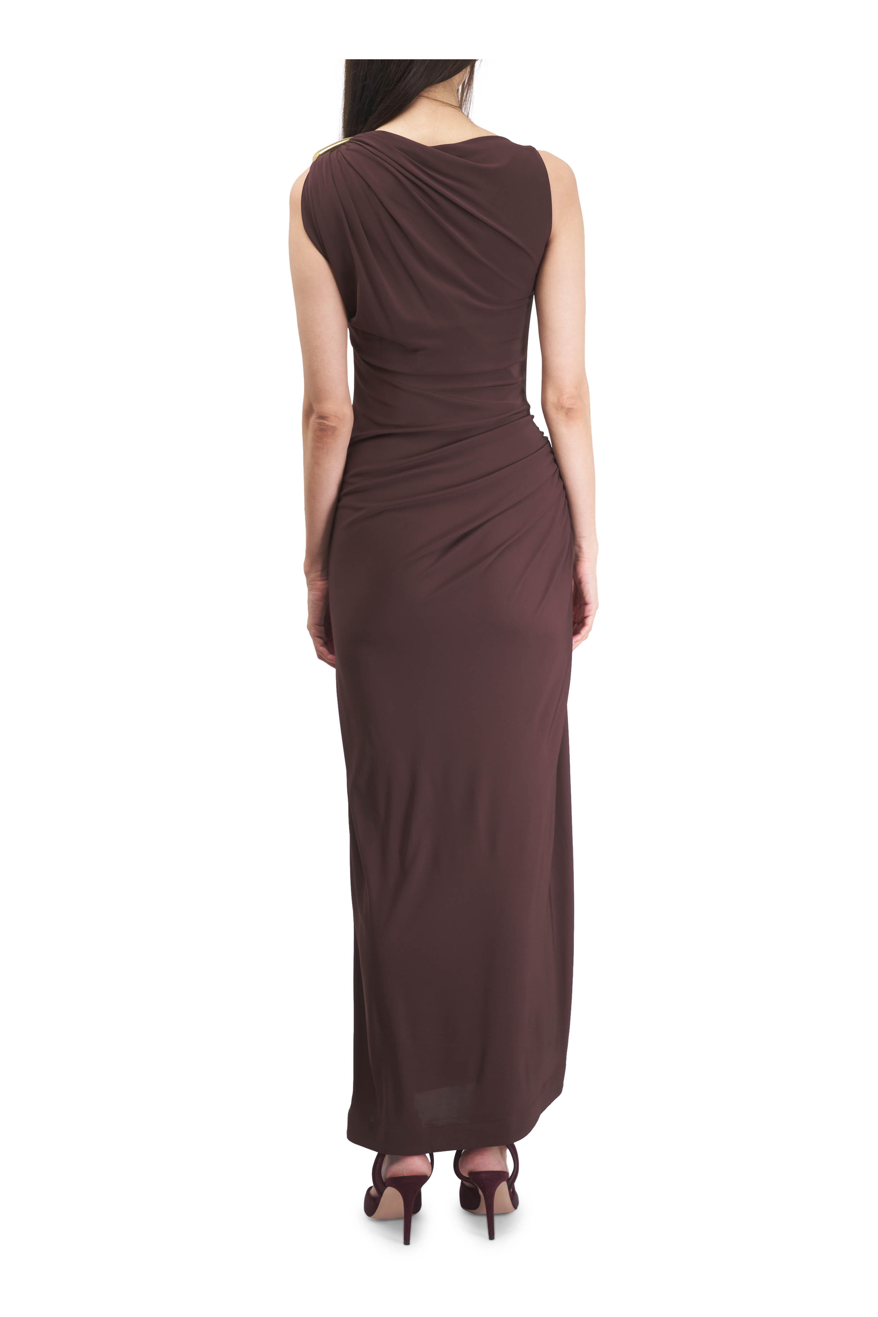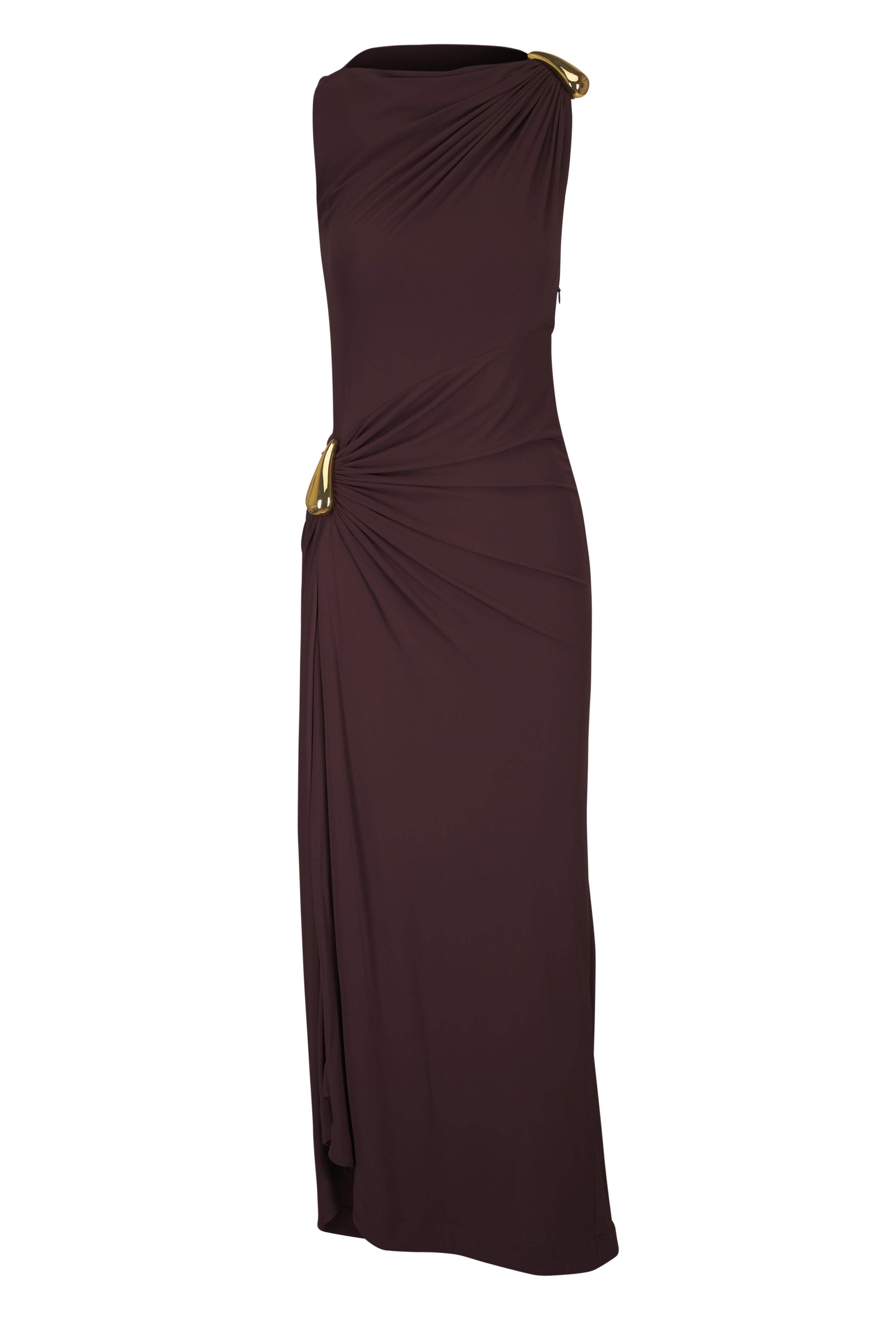 Bateau neckline. Side zip closure. Metal drop detailing. Made in Italy. Maxi. 100% viscose. Dry clean.