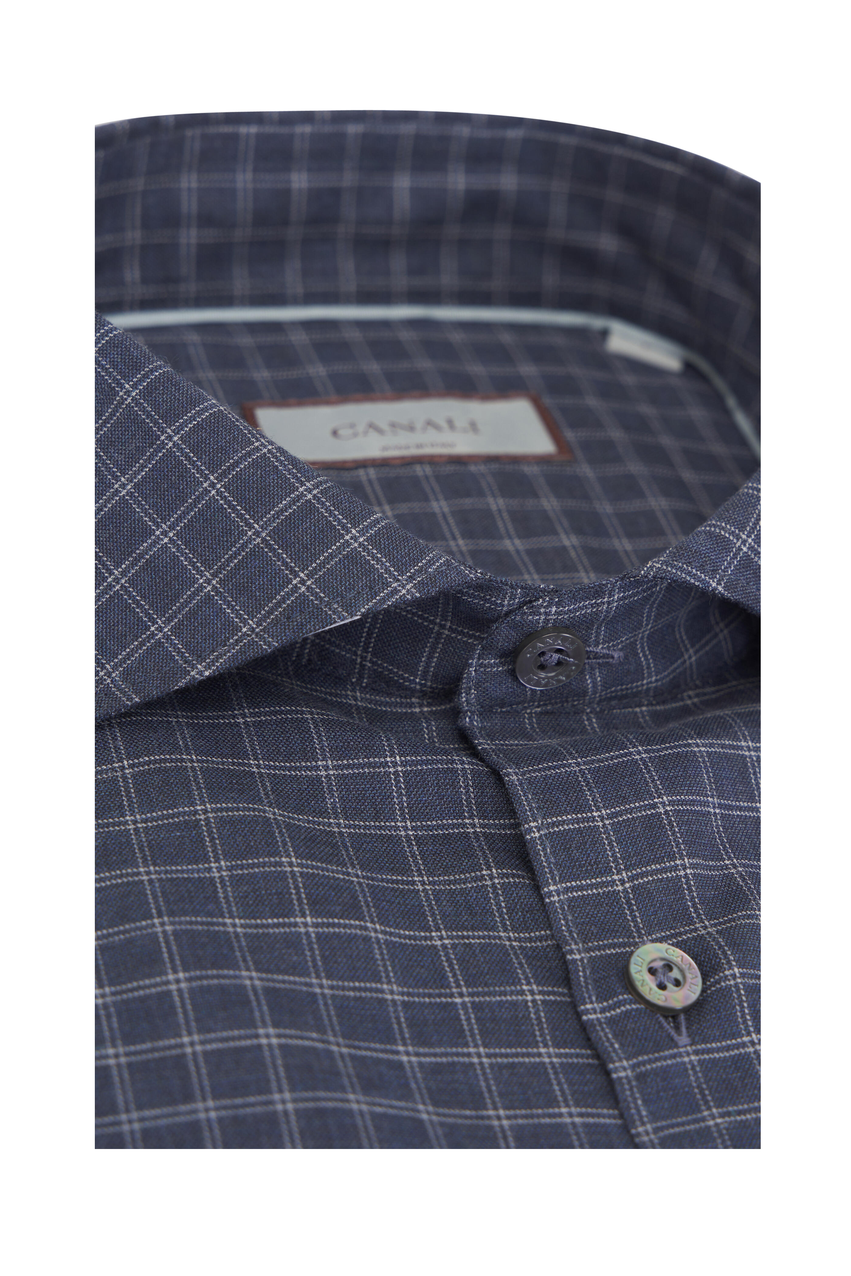 Spread collar. Front button placket. Single button barrel cuffs. Made in Italy. 100% cotton. Machine wash.