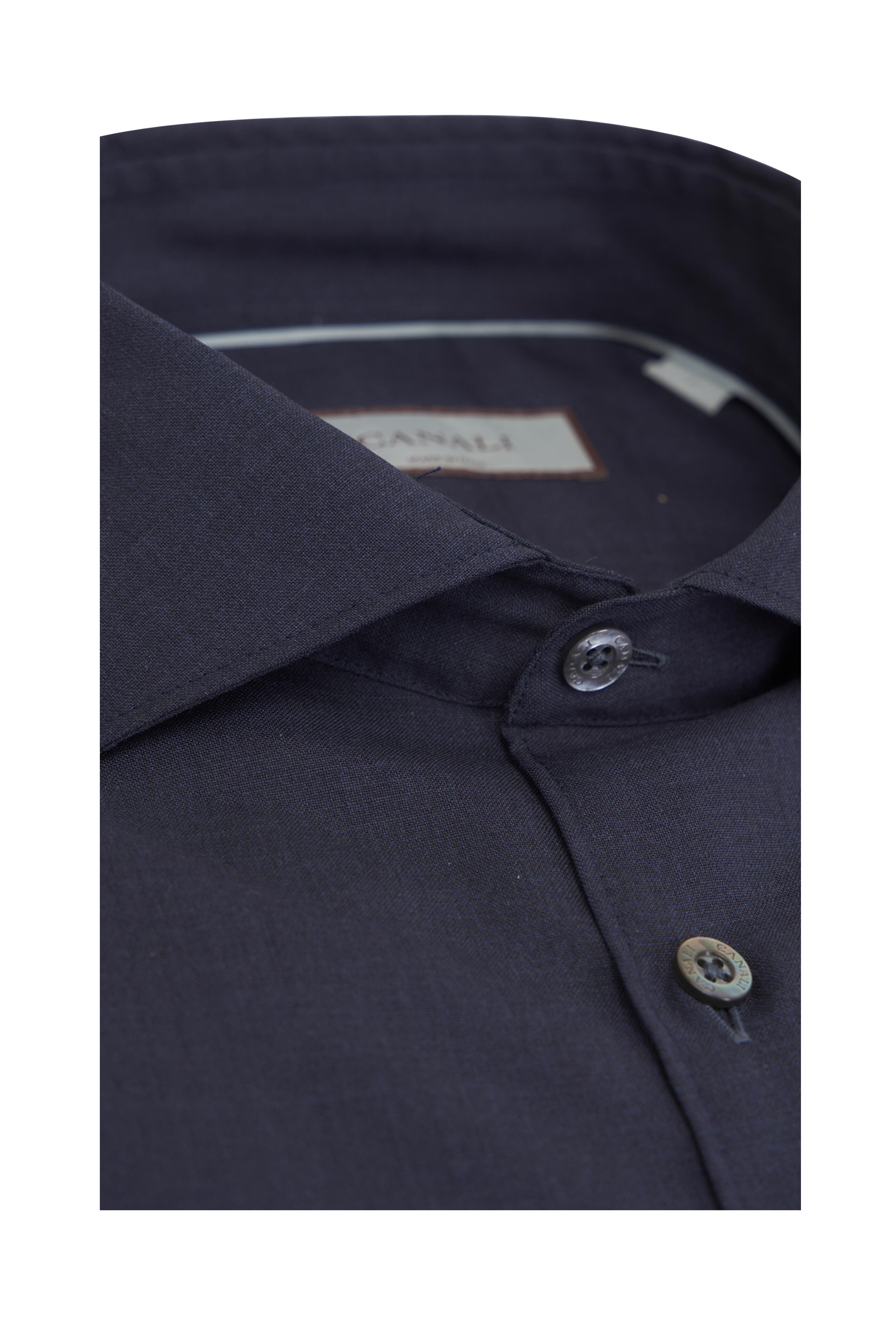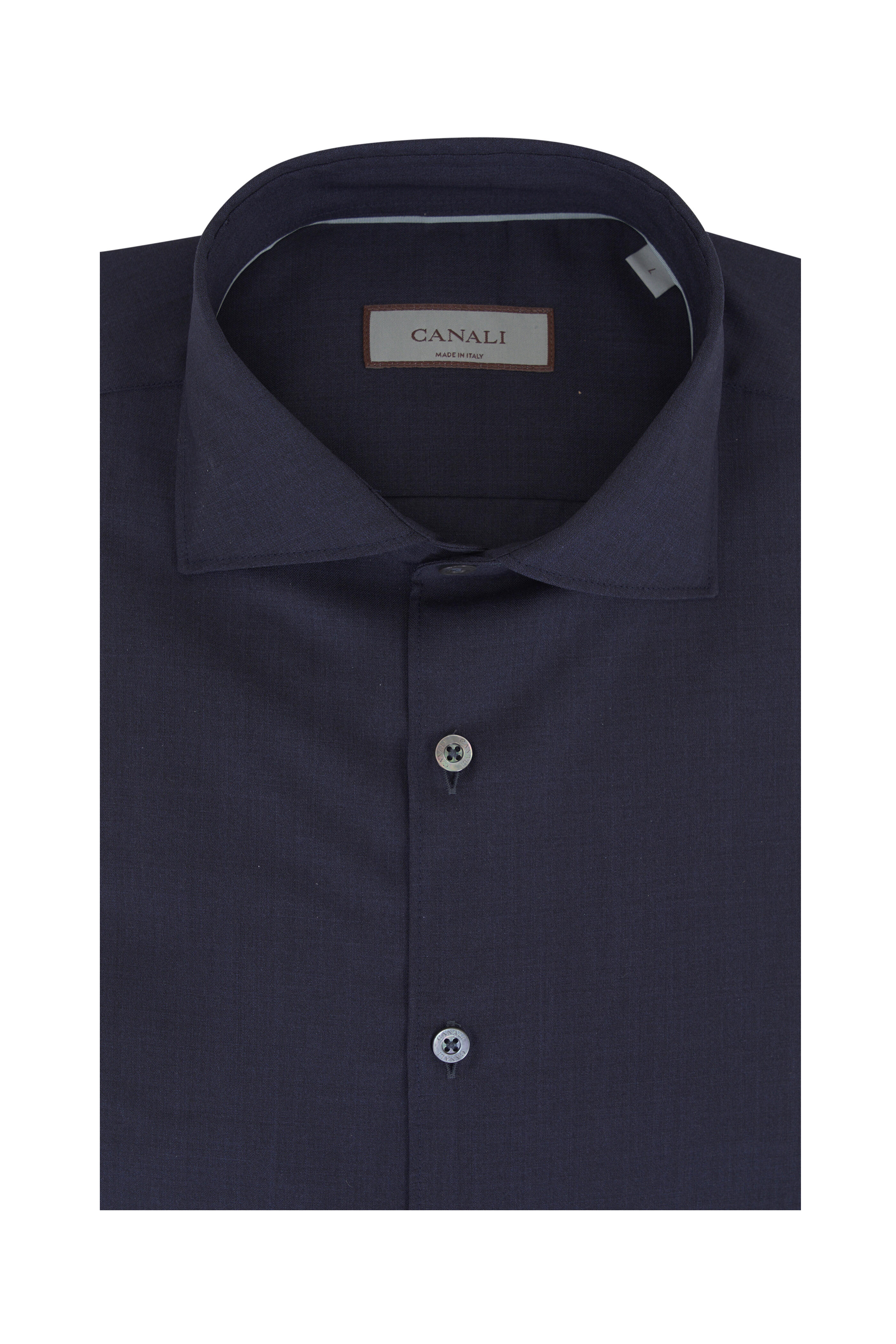 Spread collar. Front button placket. Single button barrel cuffs. Made in Italy. 100% wool. Machine wash.