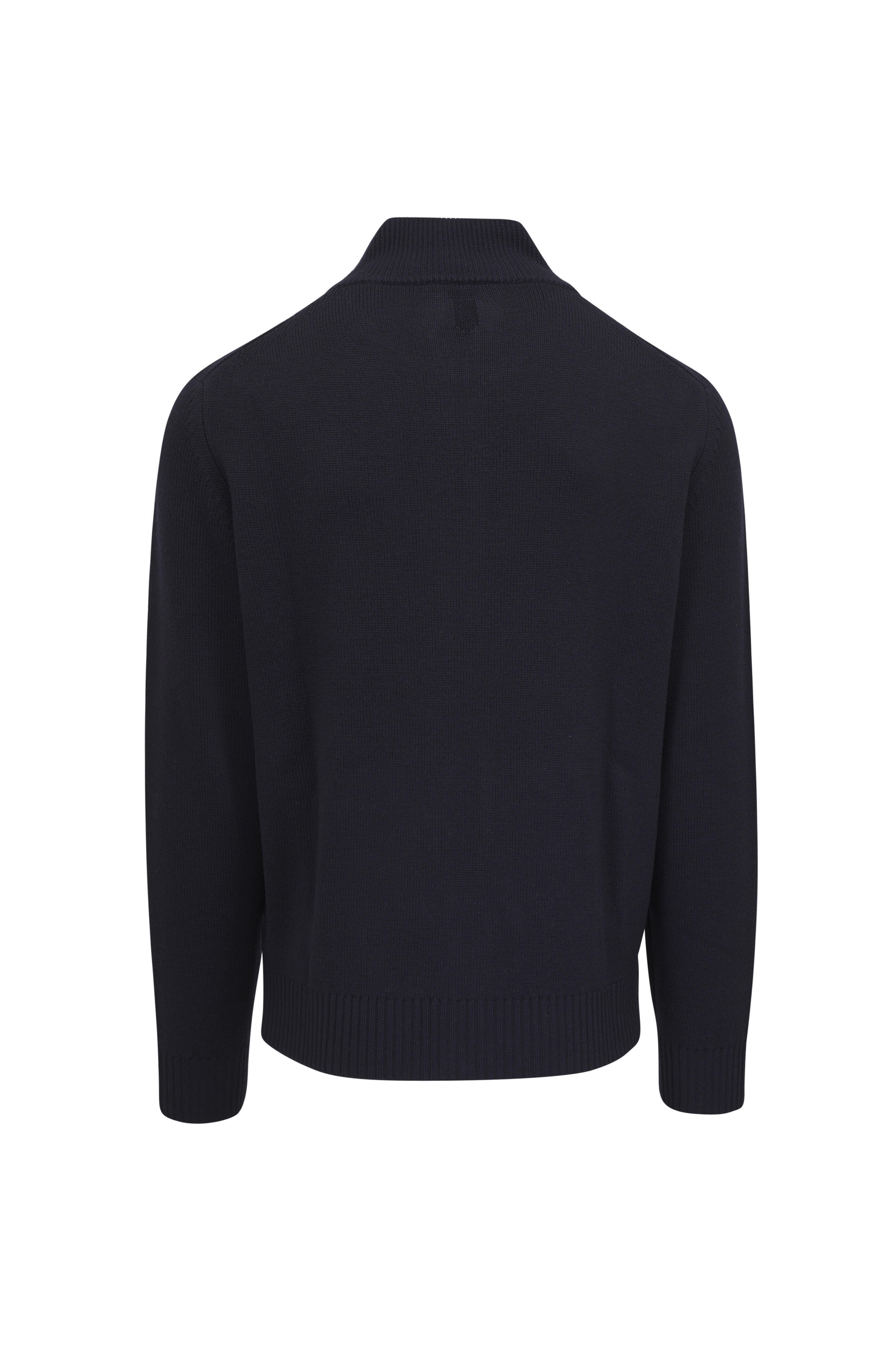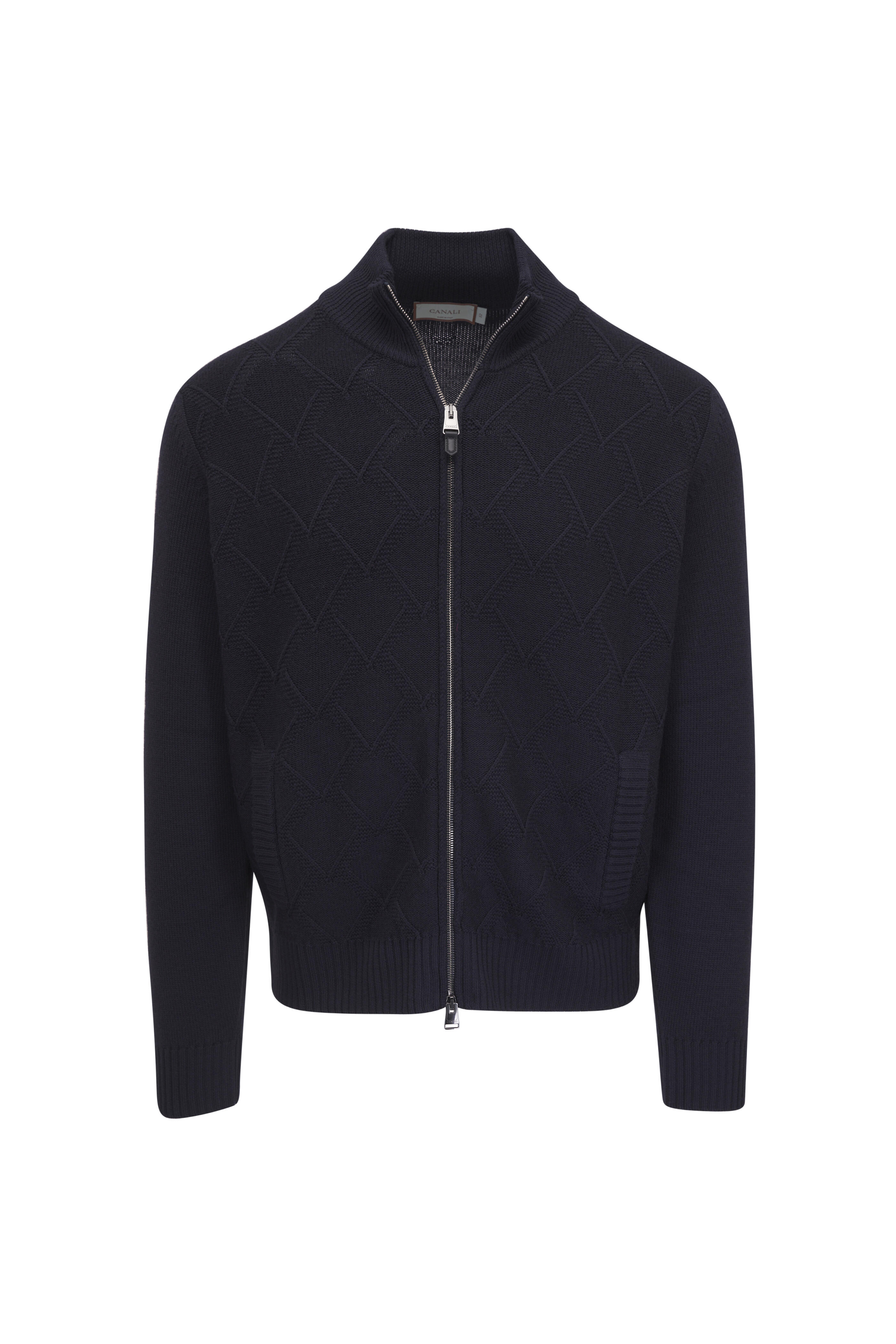 Stand collar. Two-way front zip. Ribbed trims. Made in Italy. 100% wool. Hand wash.