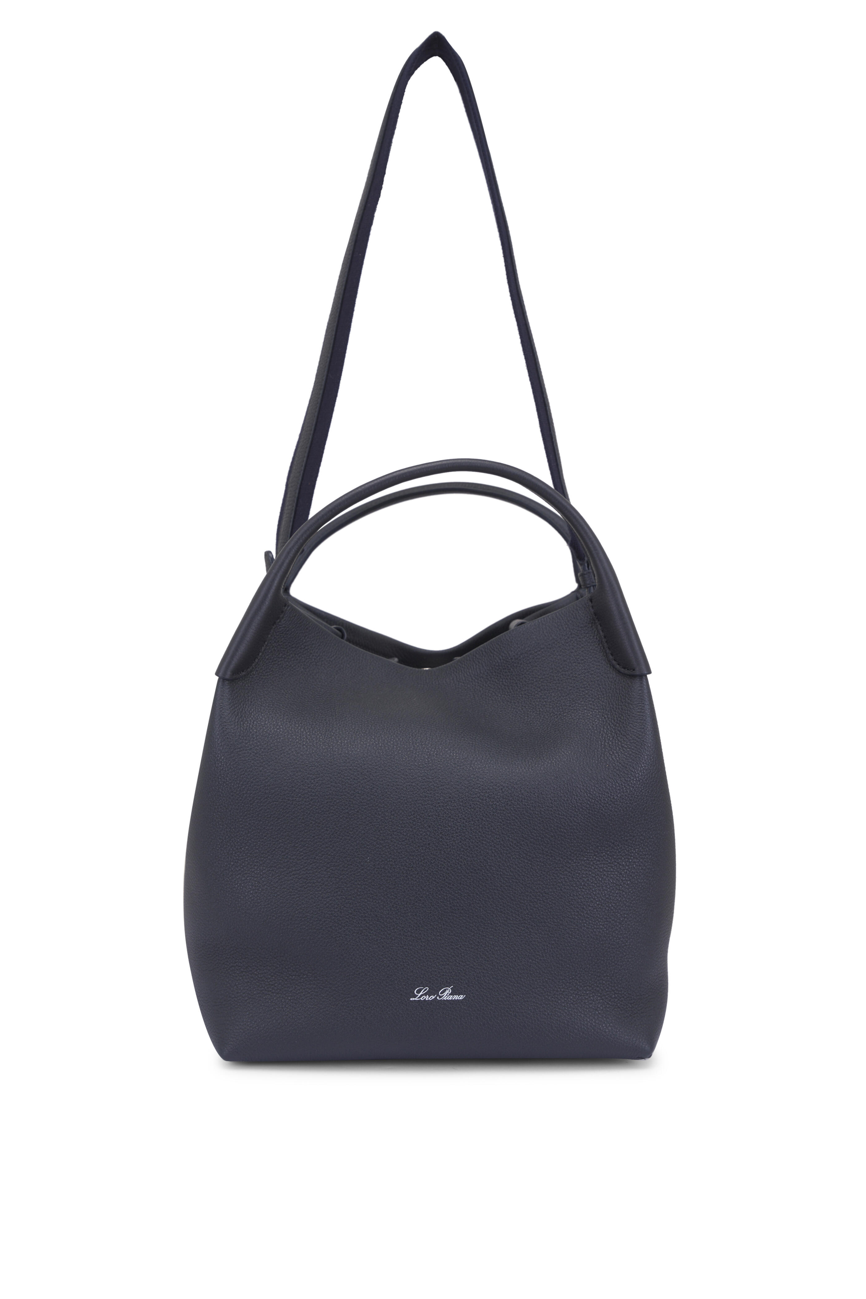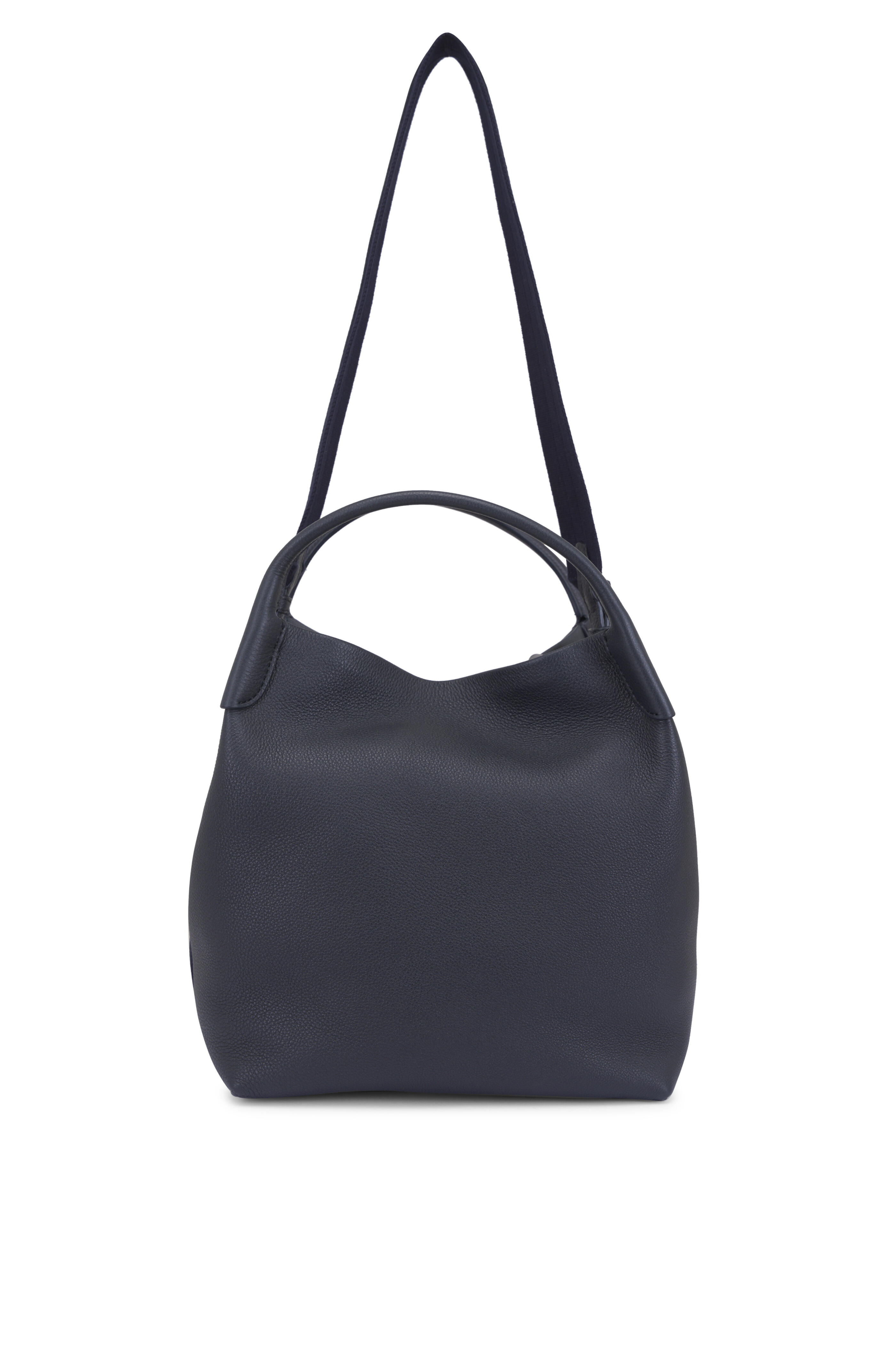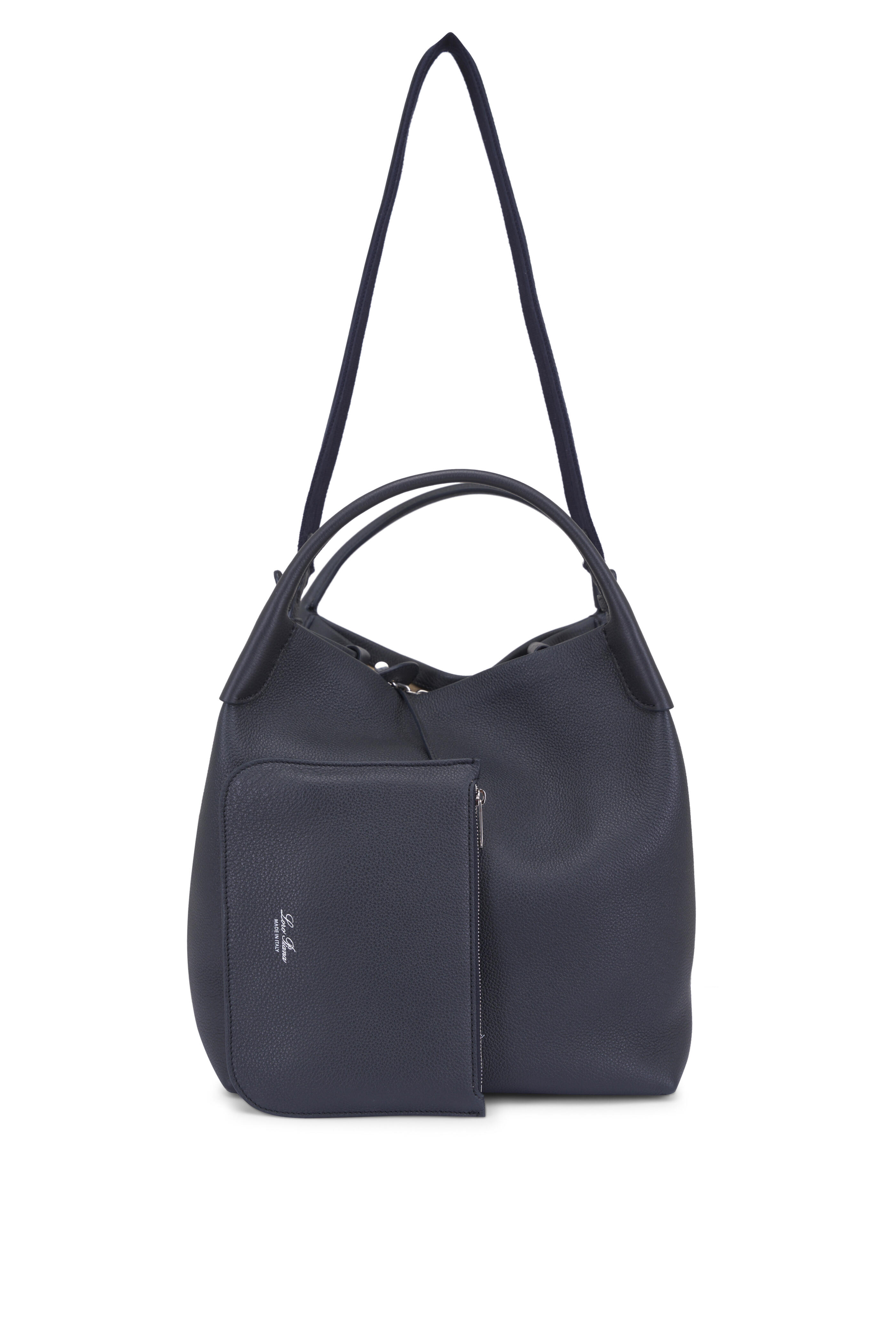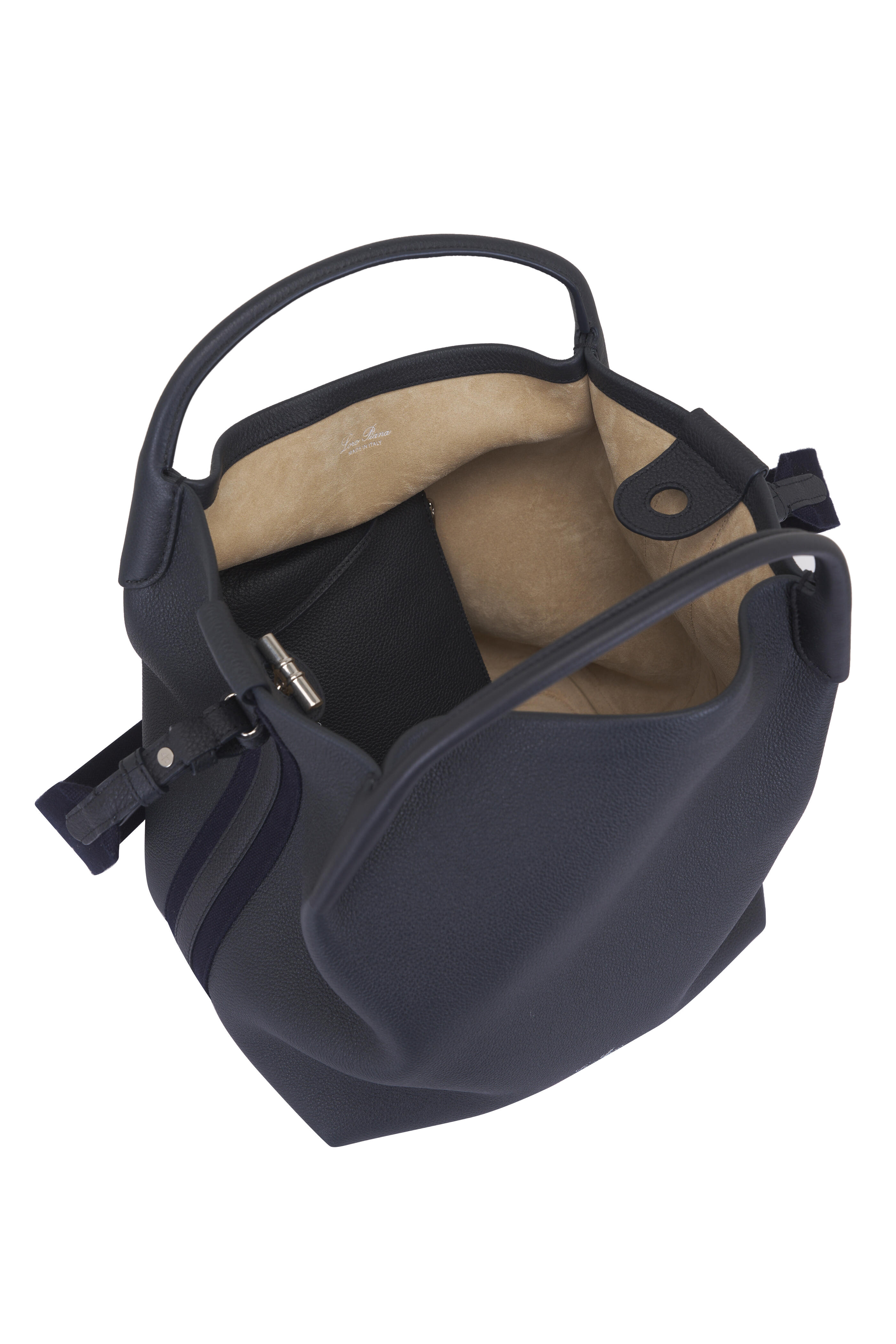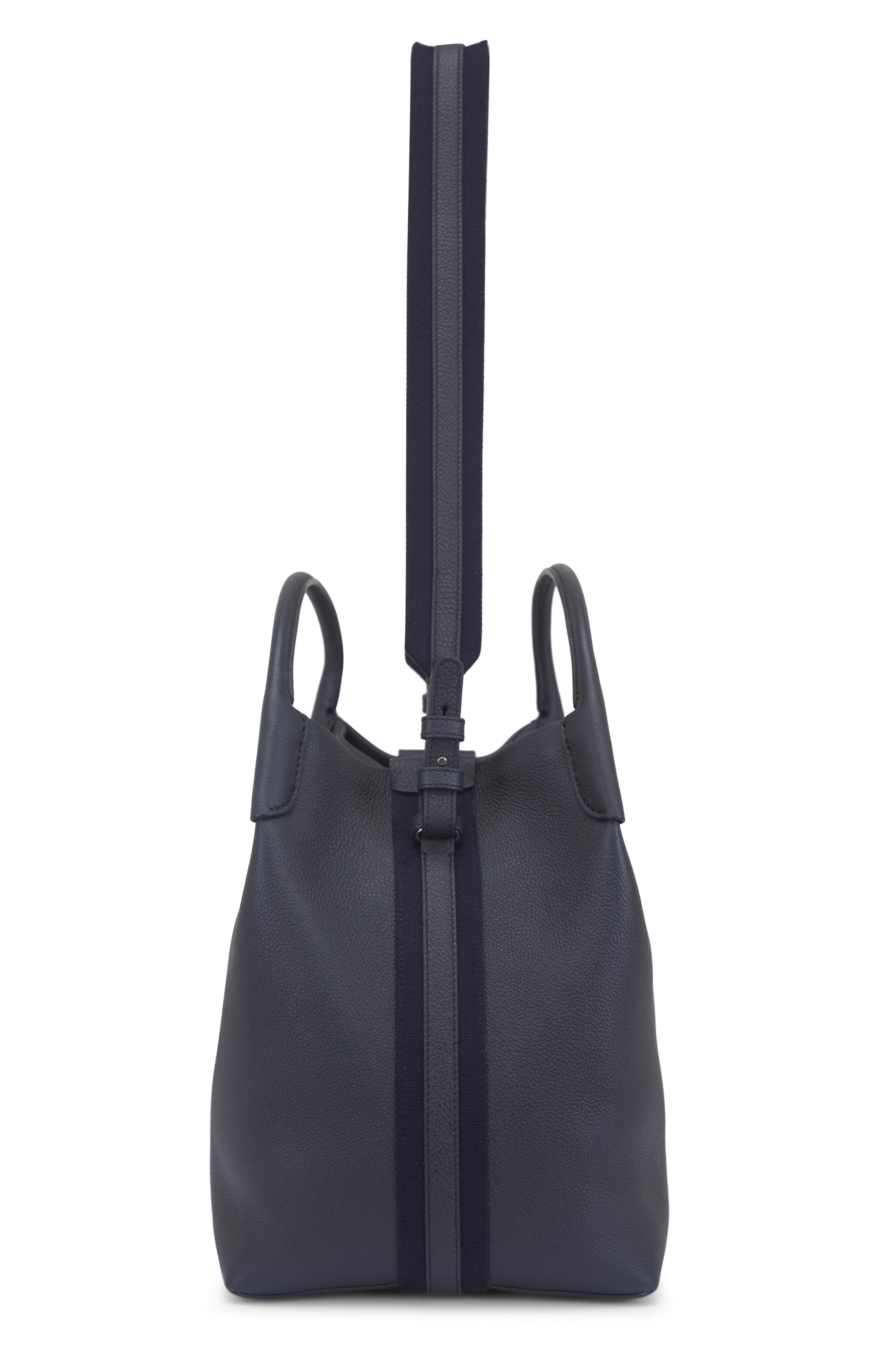 Fine grain calfskin leather. Adjustable removable shoulder strap. Single top handle. Top toggle closure. Removable inner leather pouch; attached to the bag with a toggle. Suede lining. Made in Italy. Size: Large 24 x 20 x 27 cm (9.5" x 7.9" x 10.6").
