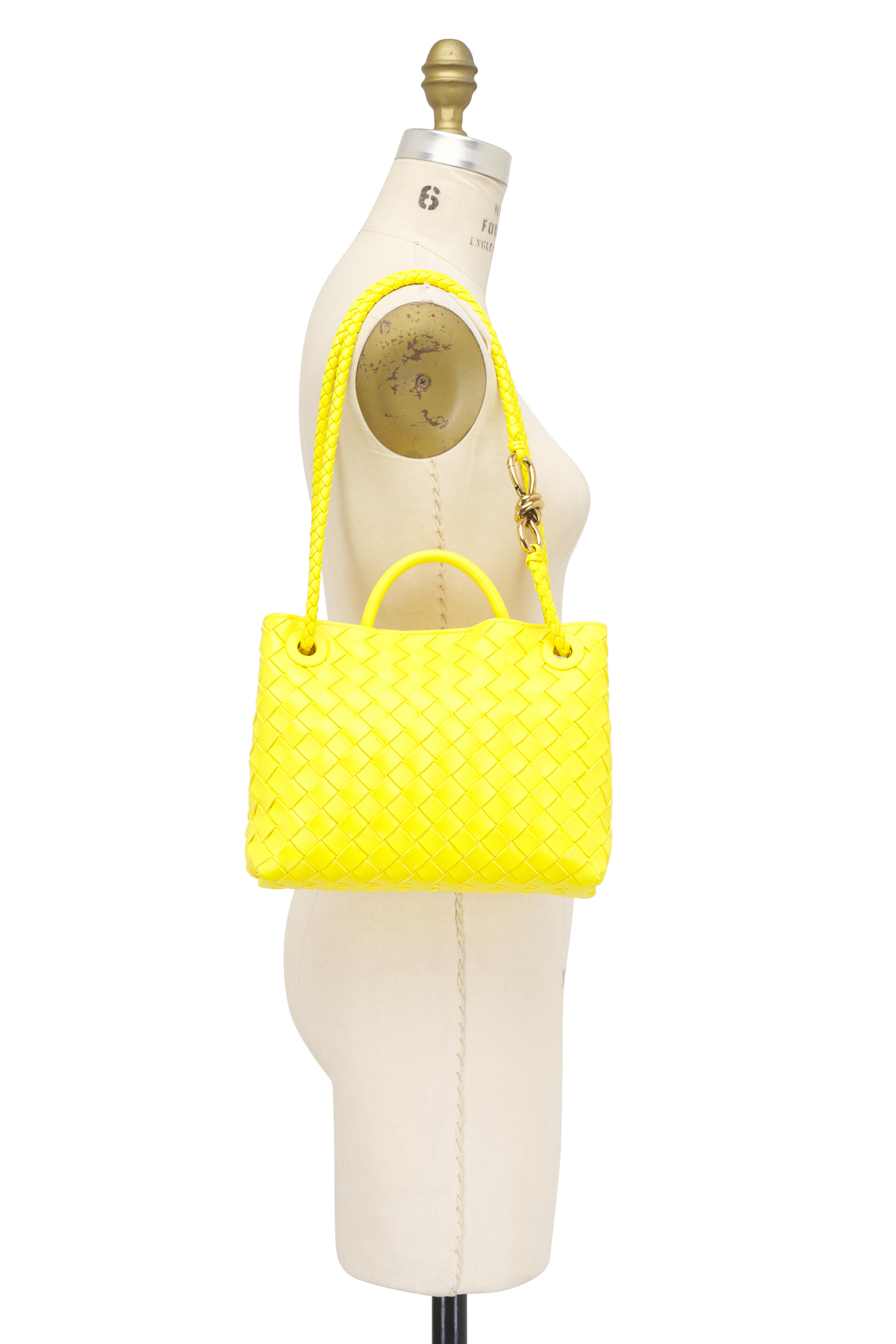 Intrecciato lambskin leather. Single top handle; sliding shoulder strap. Top magnetic closure. Interior zip pocket, two open pockets. Lambskin bonded Intrecciato lining. Signature knot detail. Brass finish hardware. Made in Italy. Height: 20 cm | 7.9". Width: 25 cm | 9.8". Depth: 10 cm | 2.6". Handle drop: 6 cm | 2.4". Strap drop: 50 cm | 19.7".