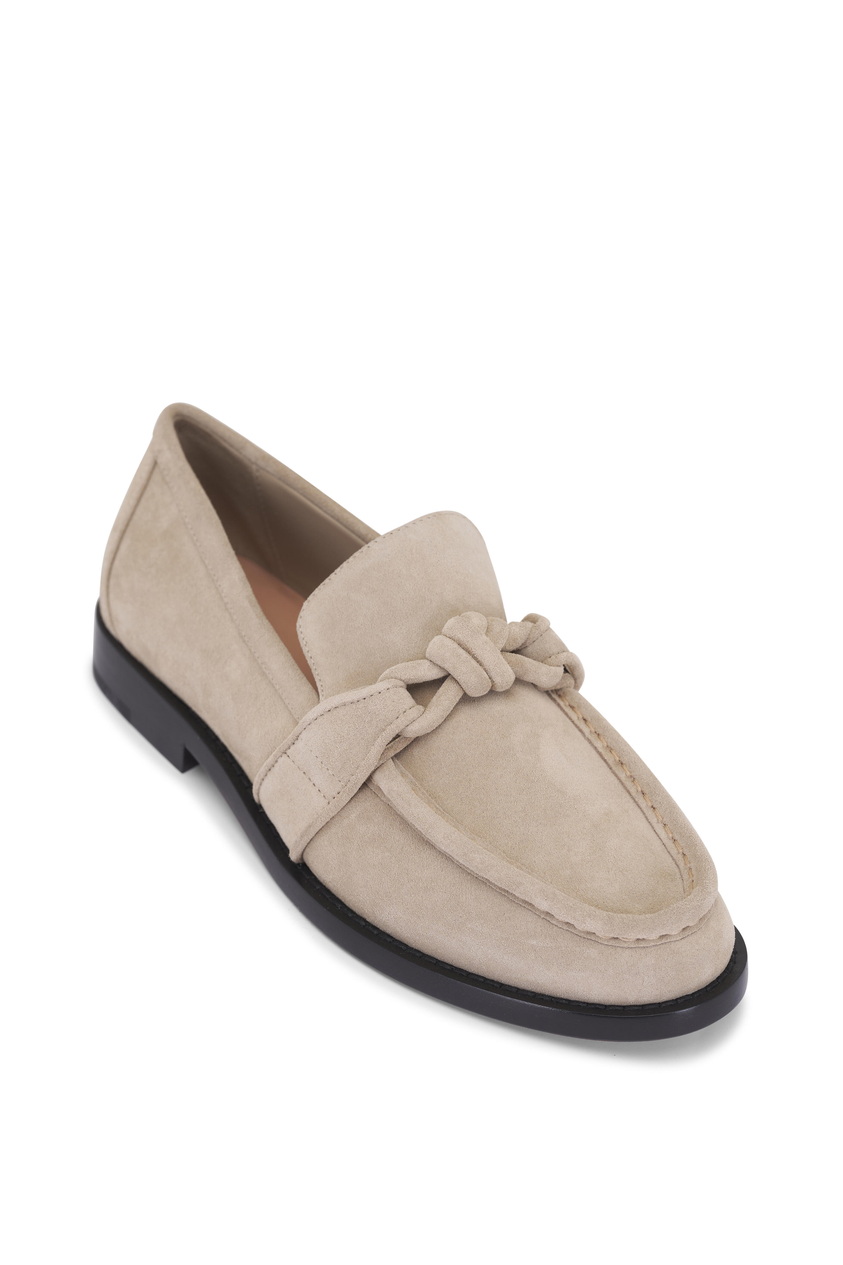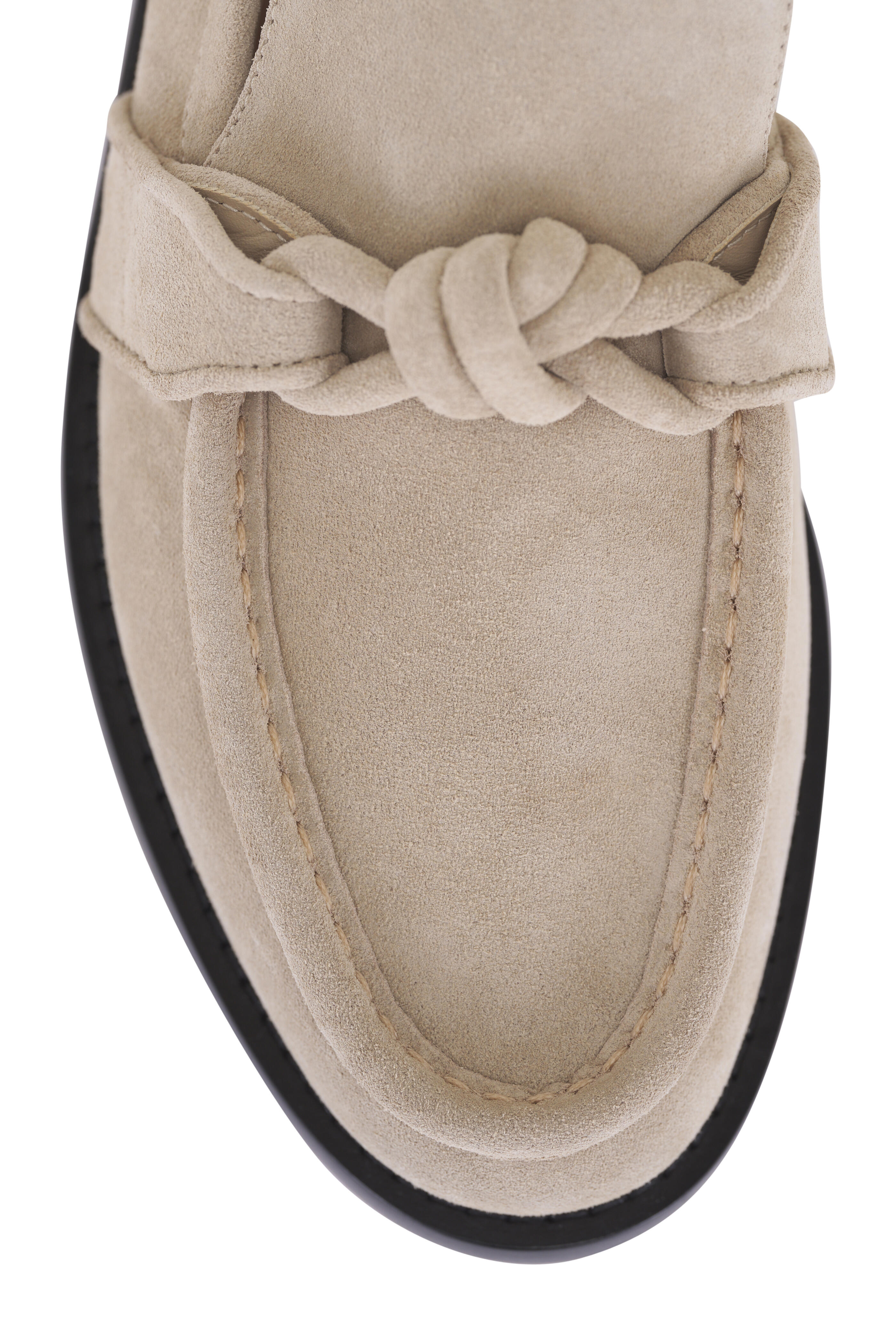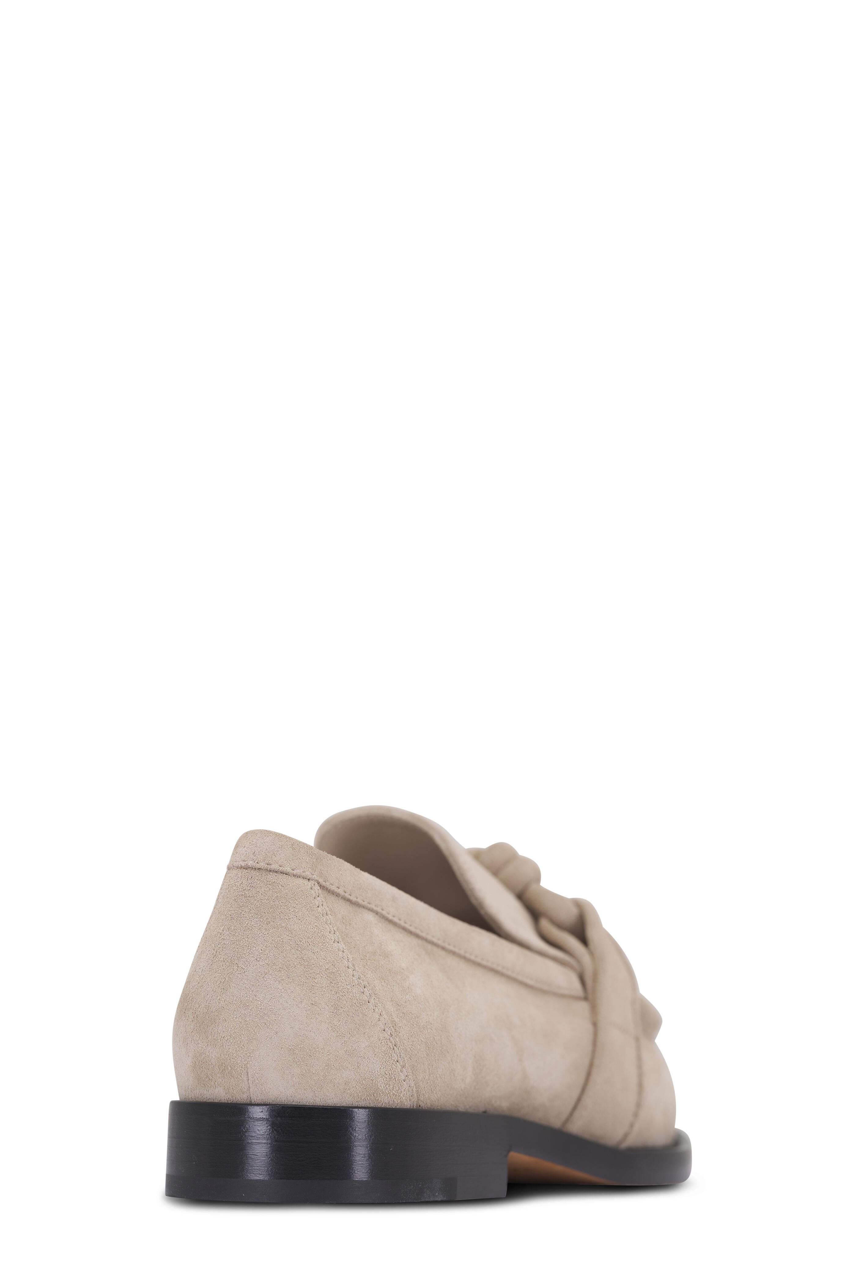 Suede upper. Closed round toe. Notched vamp. Slip-on style. Leather lining and insole. Leather/ rubber sole. Made in Italy.