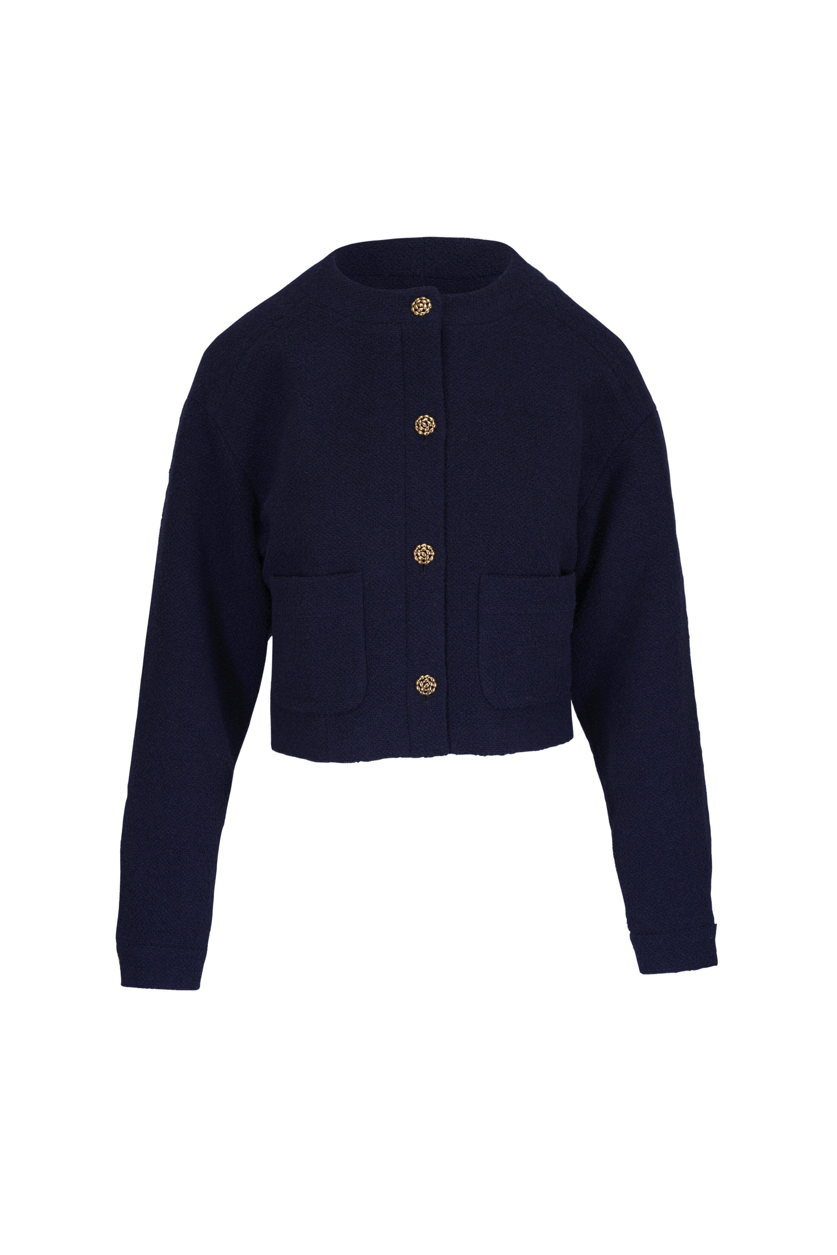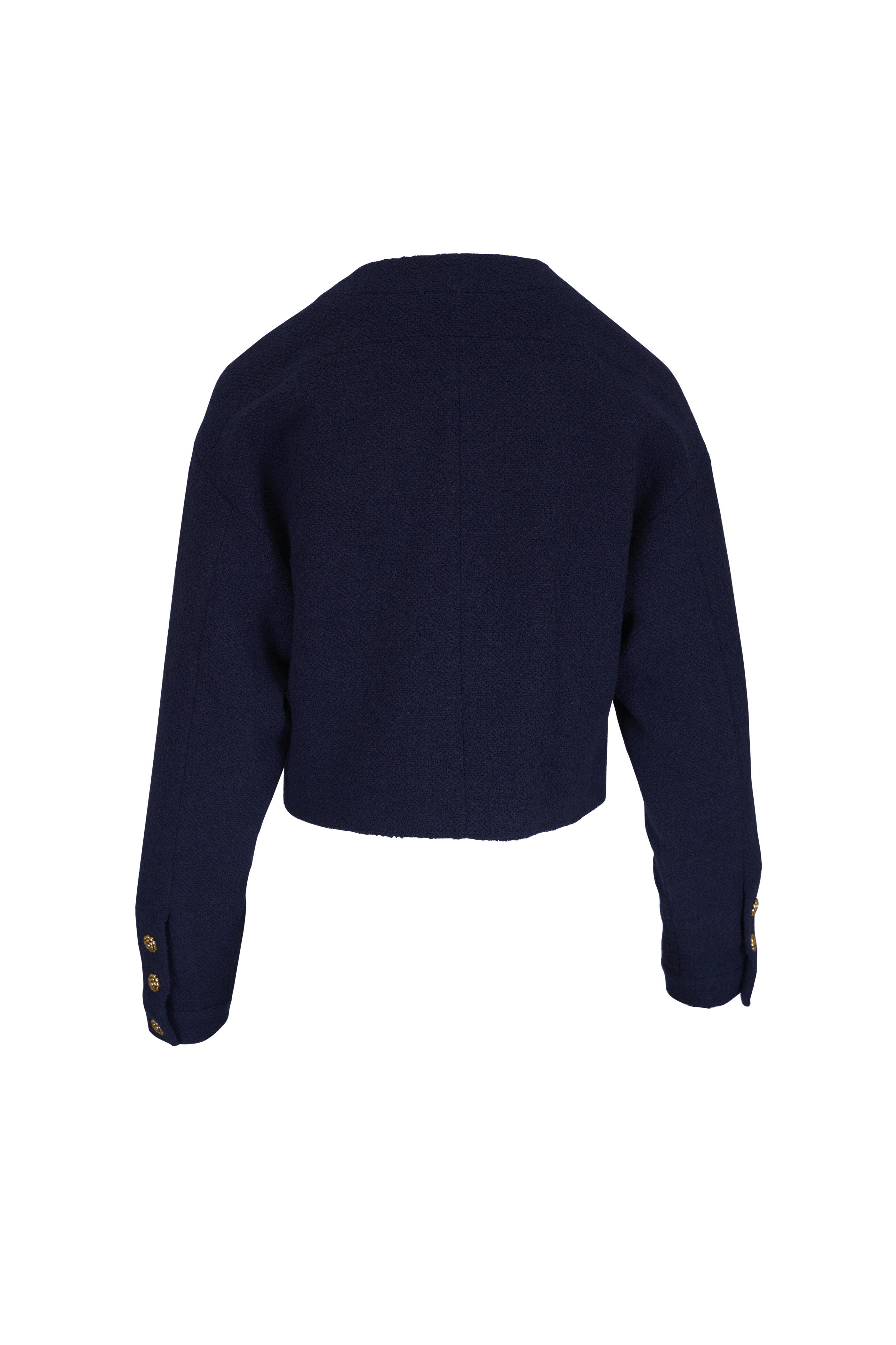Jewel neckline. Single breasted button closure. Three button cuffs. Bouclé effect. Made in Italy. Color: Lough Reflection (W1G1). 46% cashmere, 41% virgin wool, , 13% microfiber; fully lined: 100% silk. Dry clean.