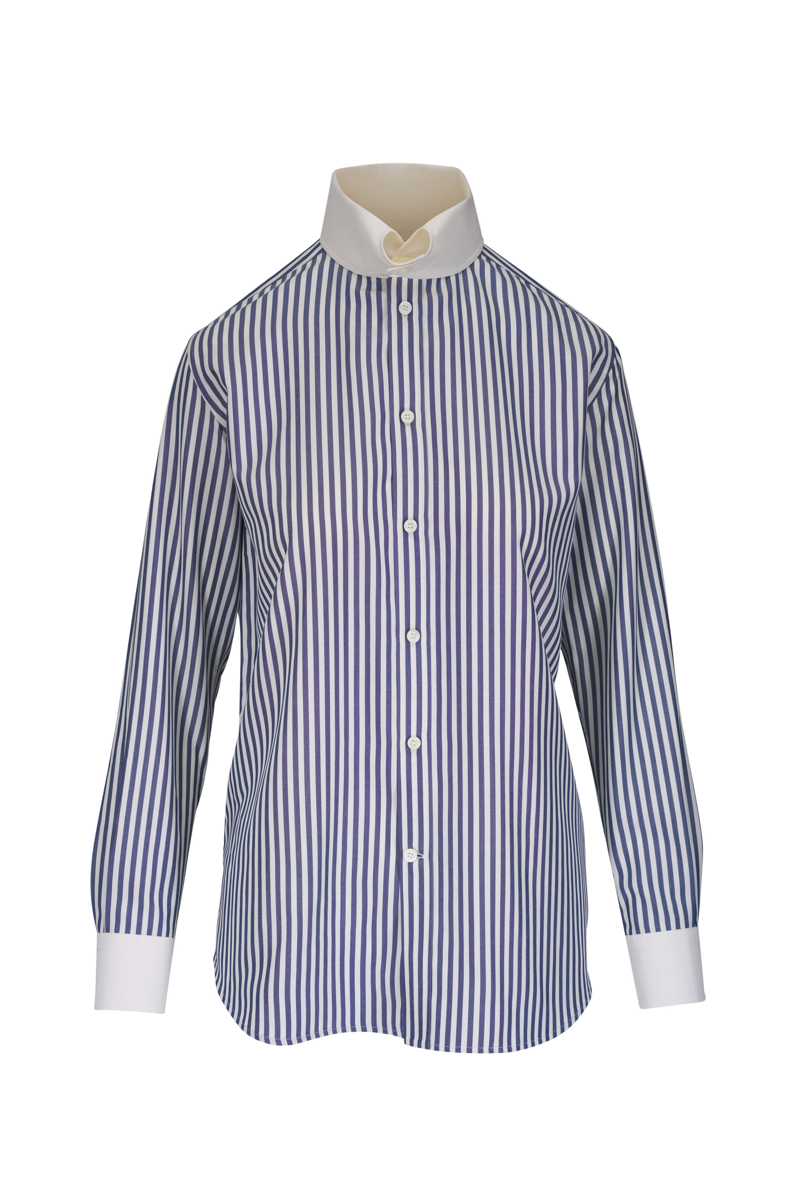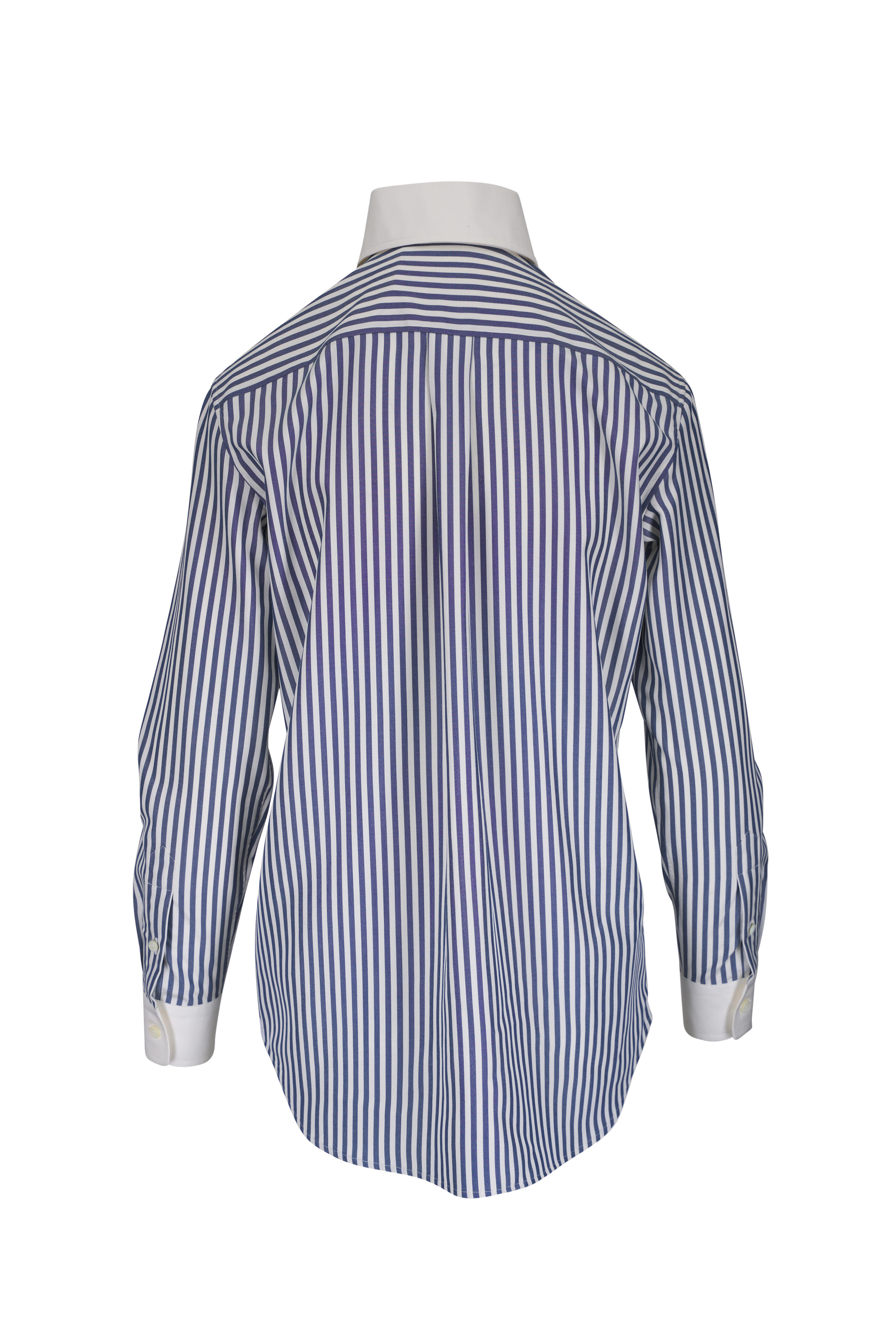 Spread collar; button closure. Front button placket. Contrast single button squared cuffs. Made in Italy. Color: Pale White/Prussian Blue (F7ET). 100% silk. Dry clean.