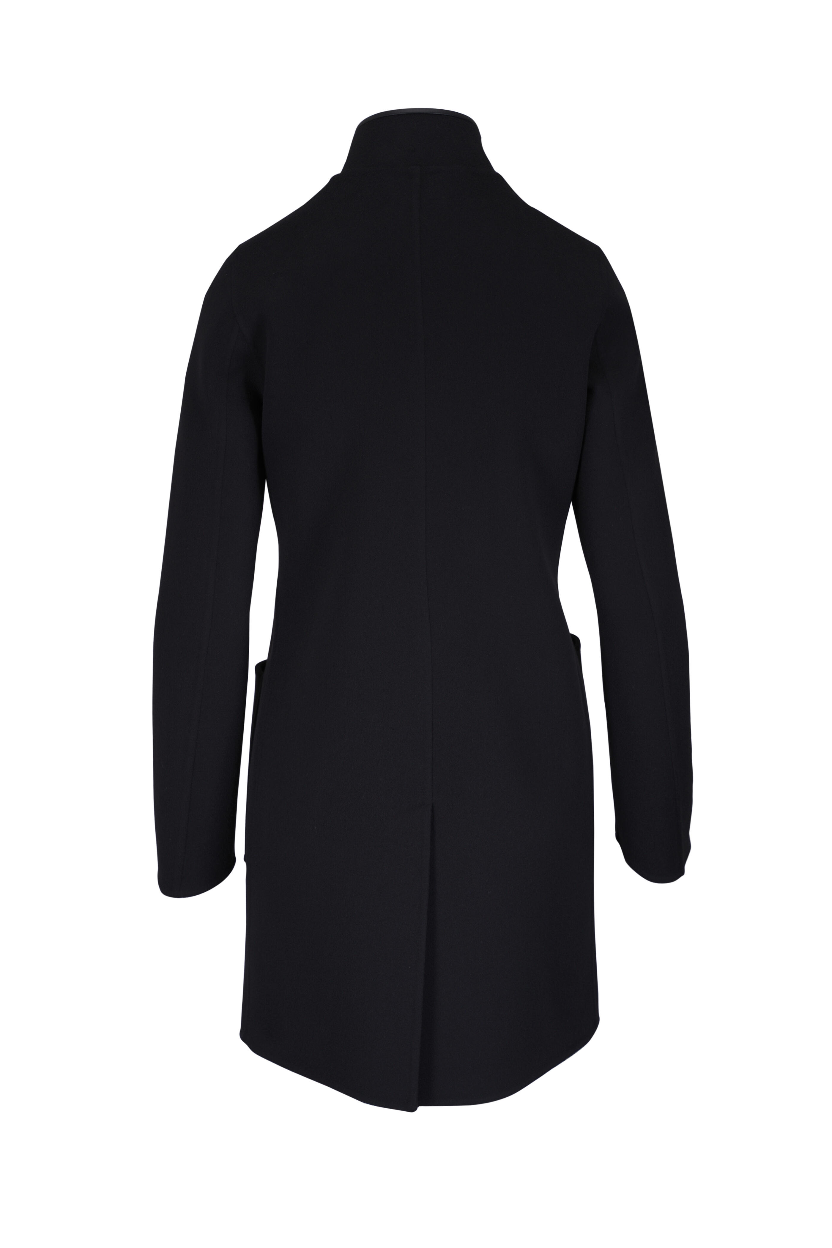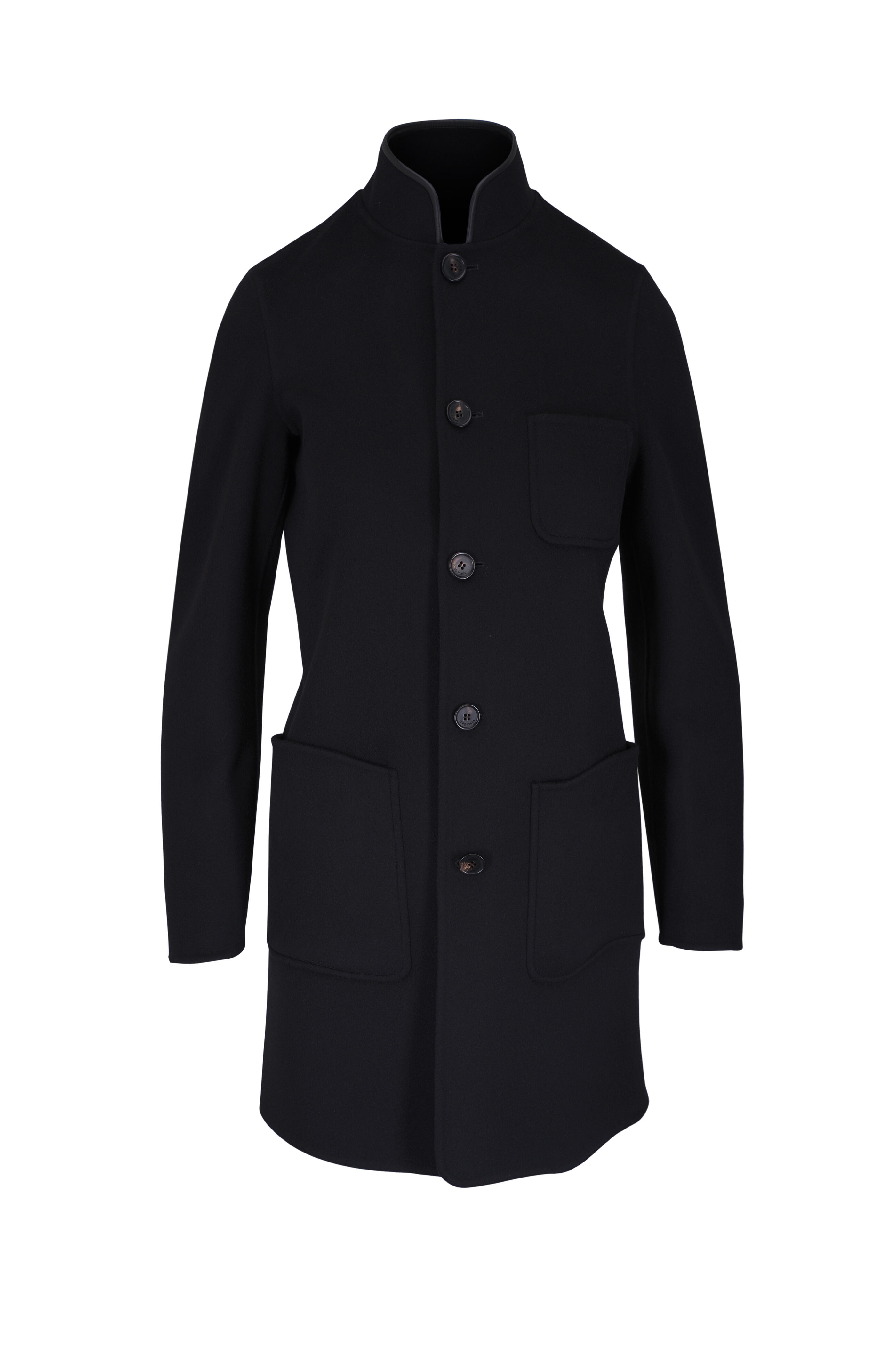 Specialist clean. Stand collar. Front button placket. Chest patch pocket; lower patch pockets. Back vent. Straight hem. Made in Italy. Shoulder to hem 33" (size 4). 100% baby cashmere; unlined.