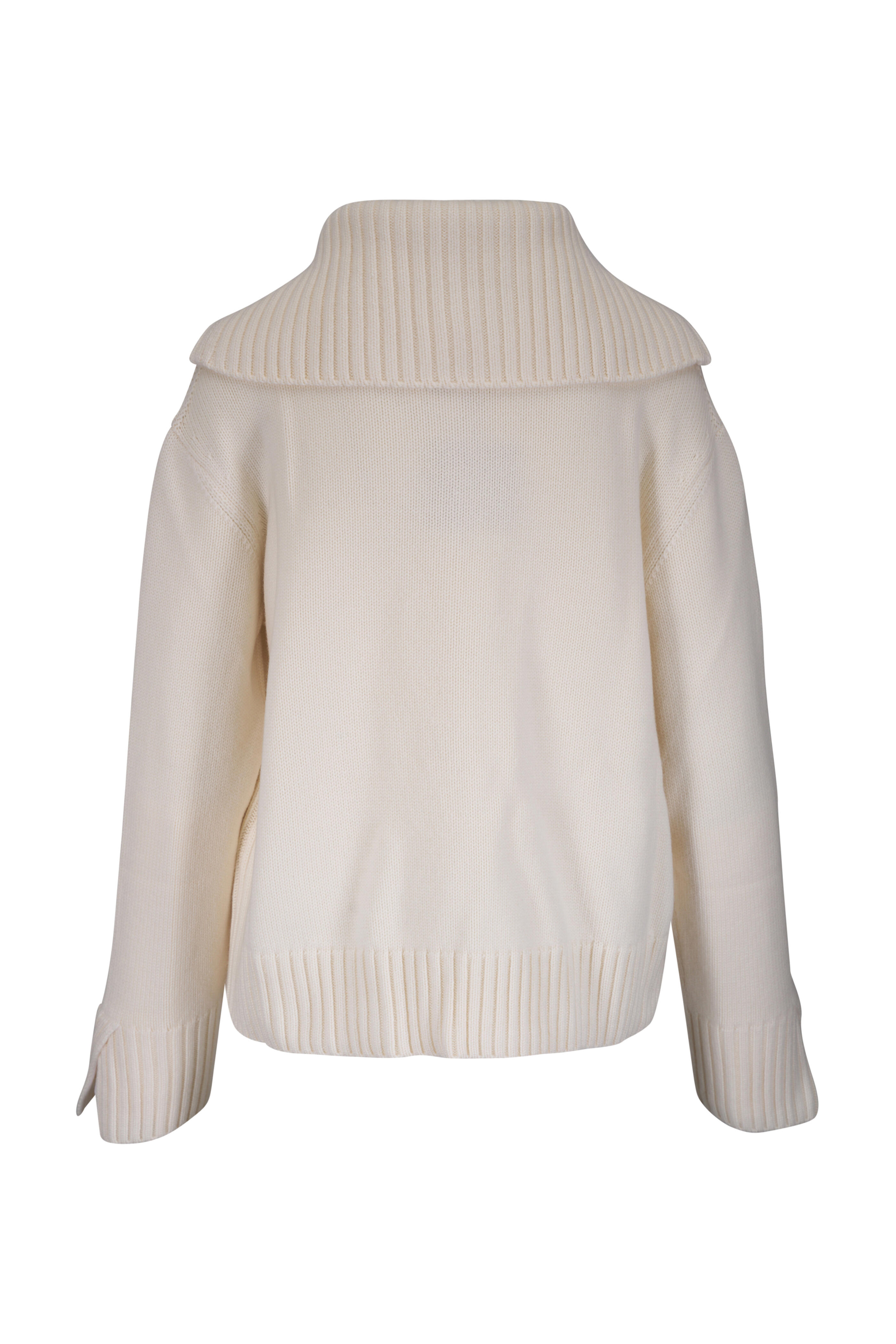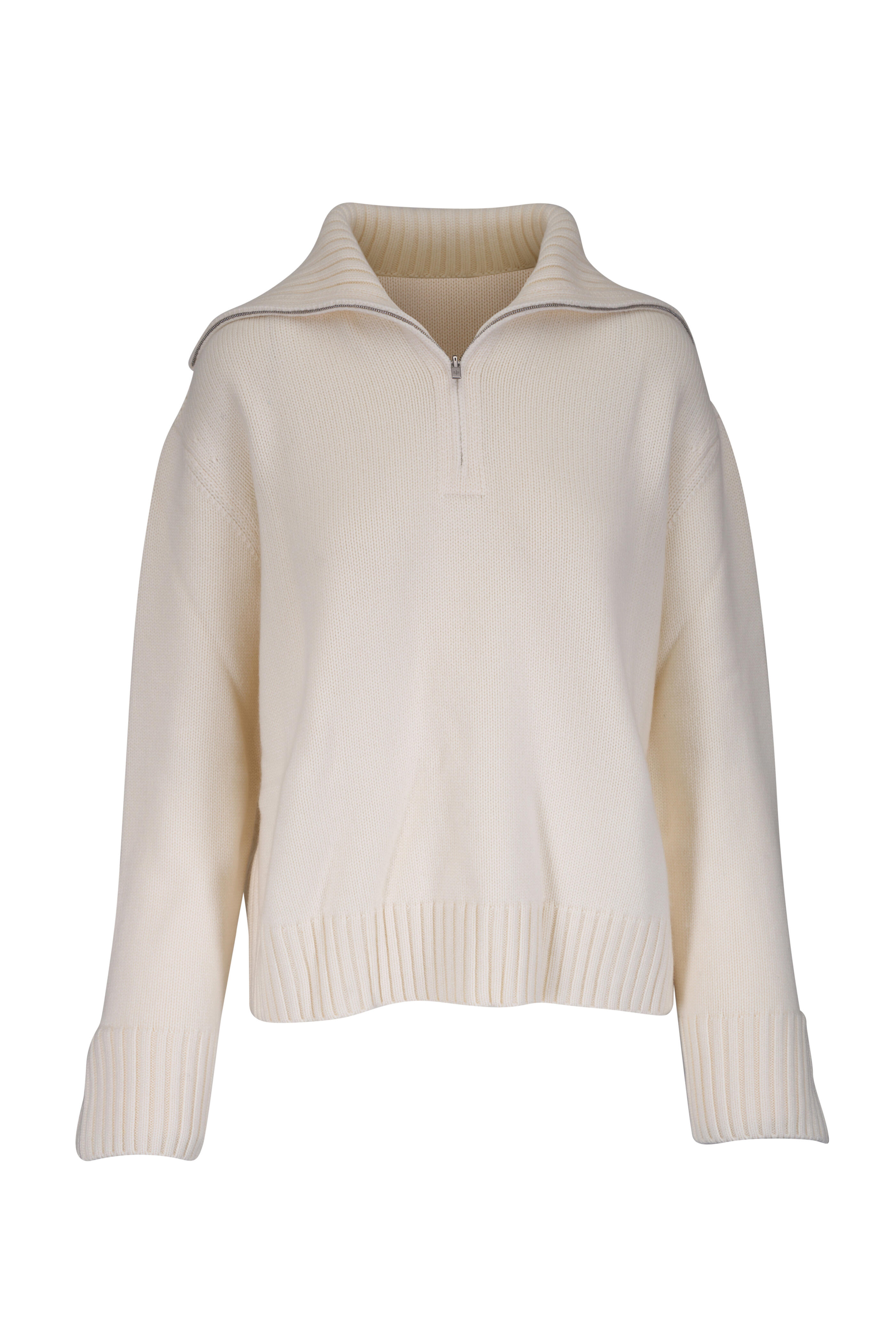 Quarter-zip. Vented cuffs. Ribbed trims. Made in Italy. 100% cashmere. Hand wash.
