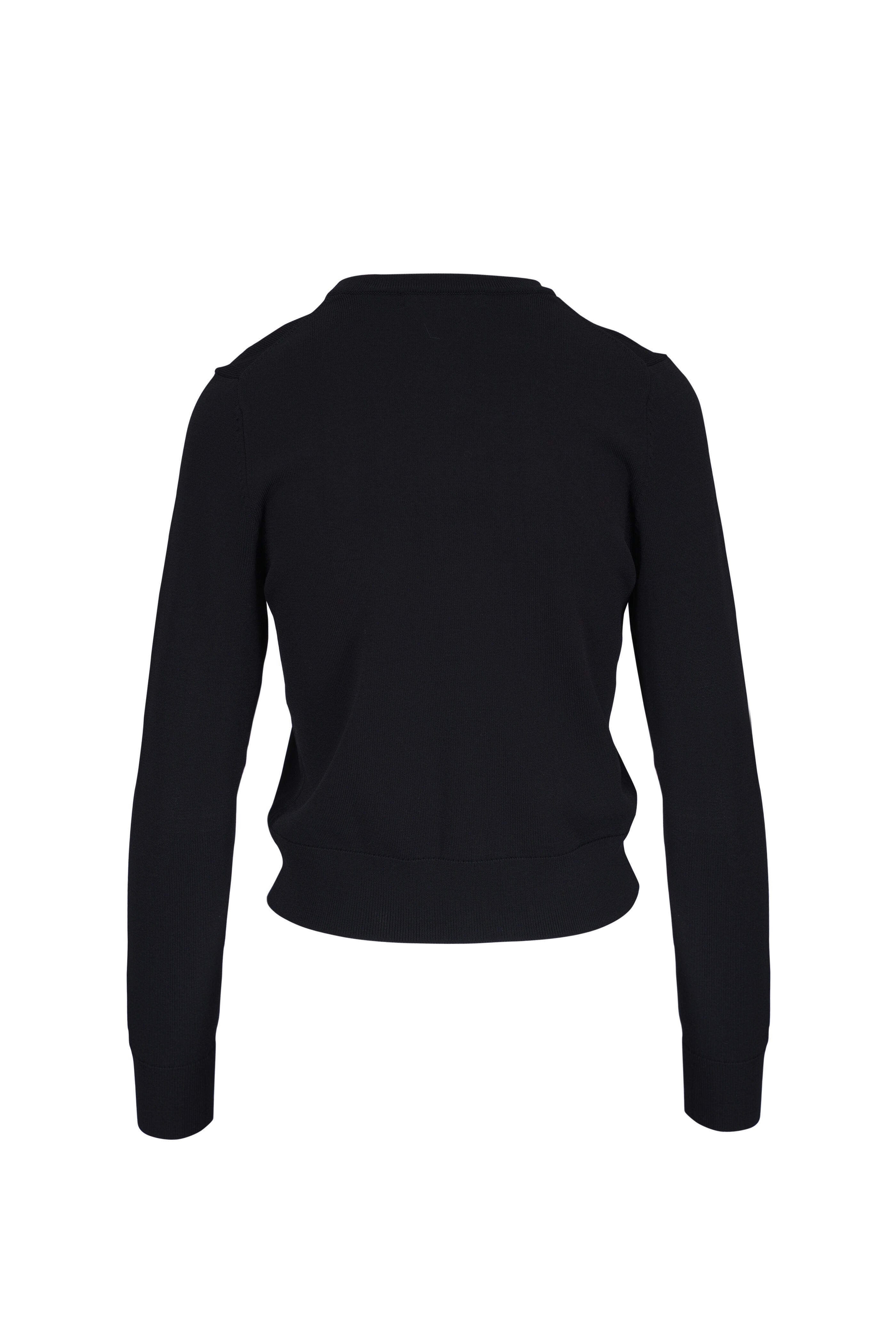Crew neckline. Front button closure. Floral embroidery at chest. Ribbed trims. Imported. Approximately 19" shoulder to hem. 61% viscose, 33% nylon, 6% polyester. Hand wash.
