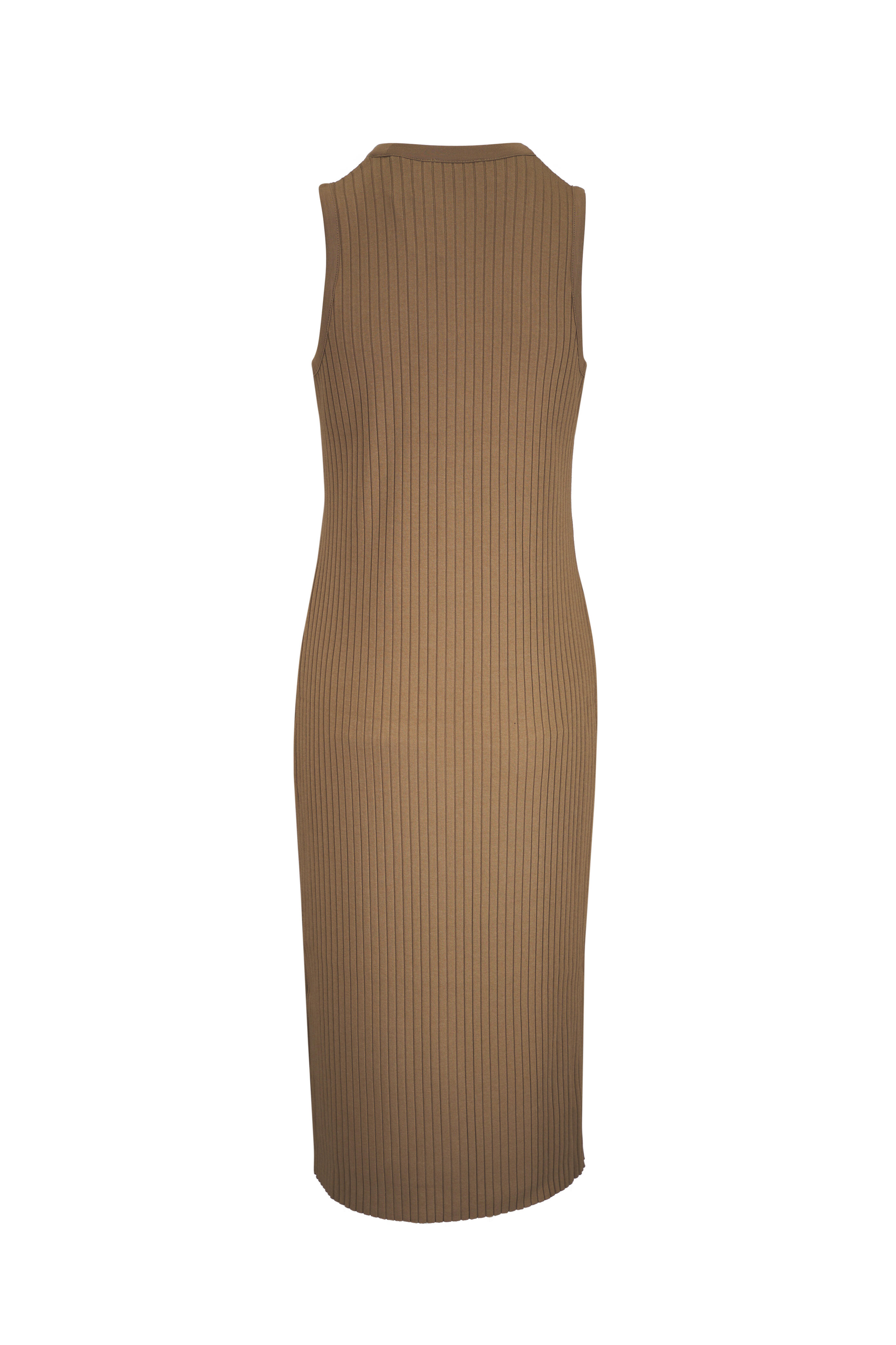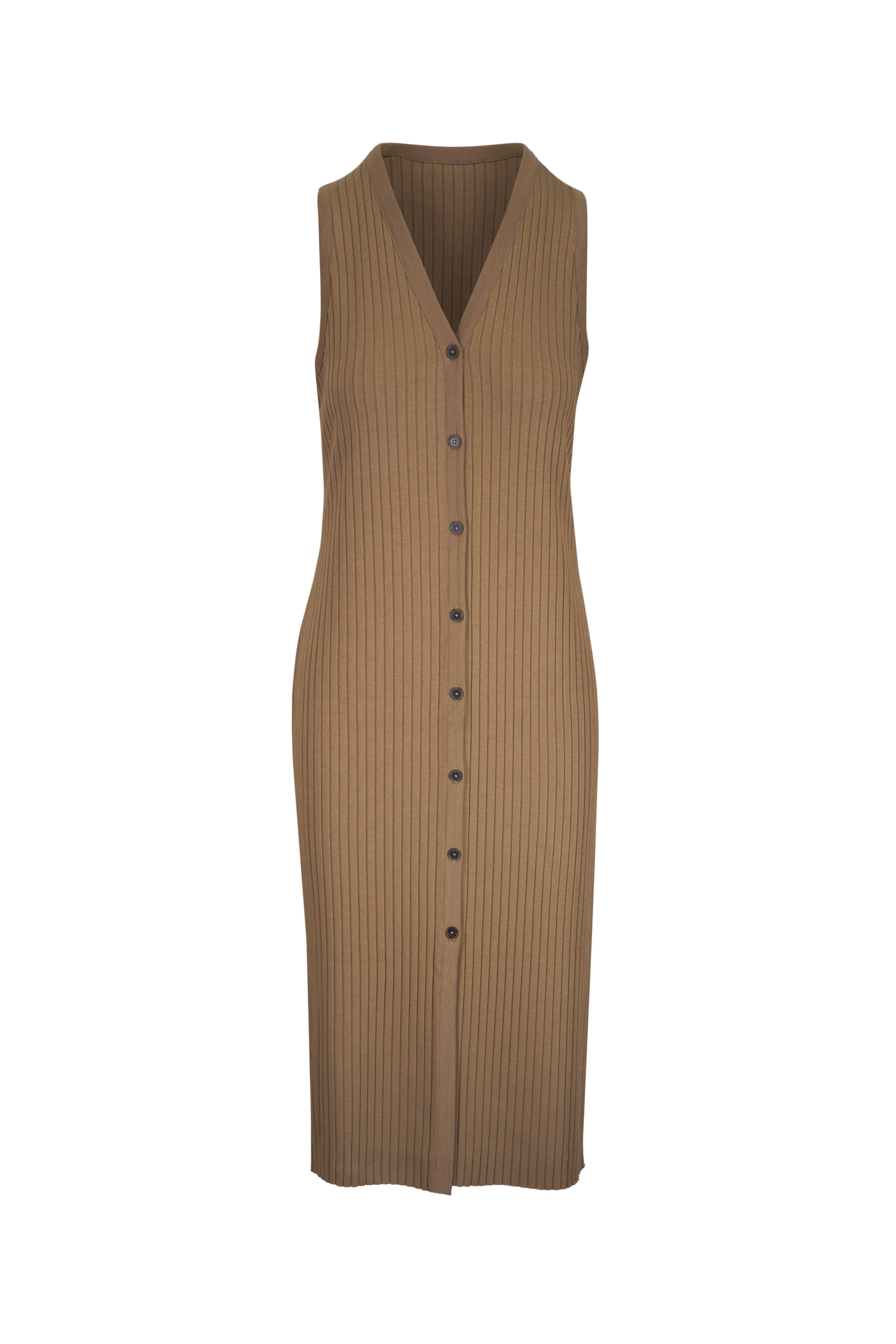 V-neckline. Front button placket. Ribbed throughout. Sleeveless. Straight hem. Imported. Shoulder to hem 47" (size xs). 46% cotton, 30% viscose, 22% polyester, 2% spandex. Machine wash.