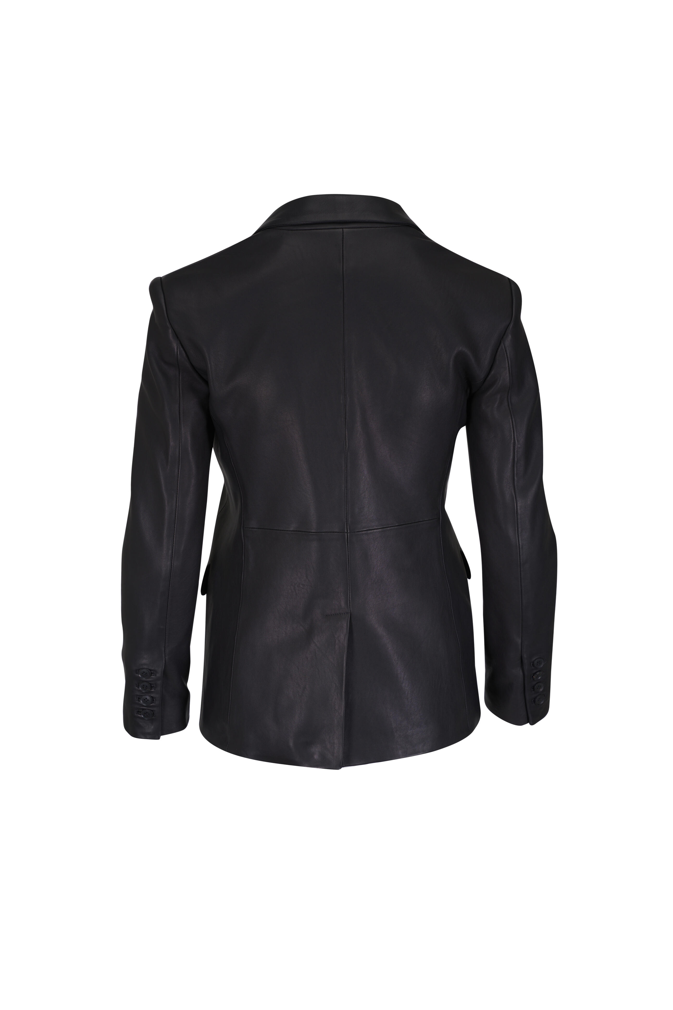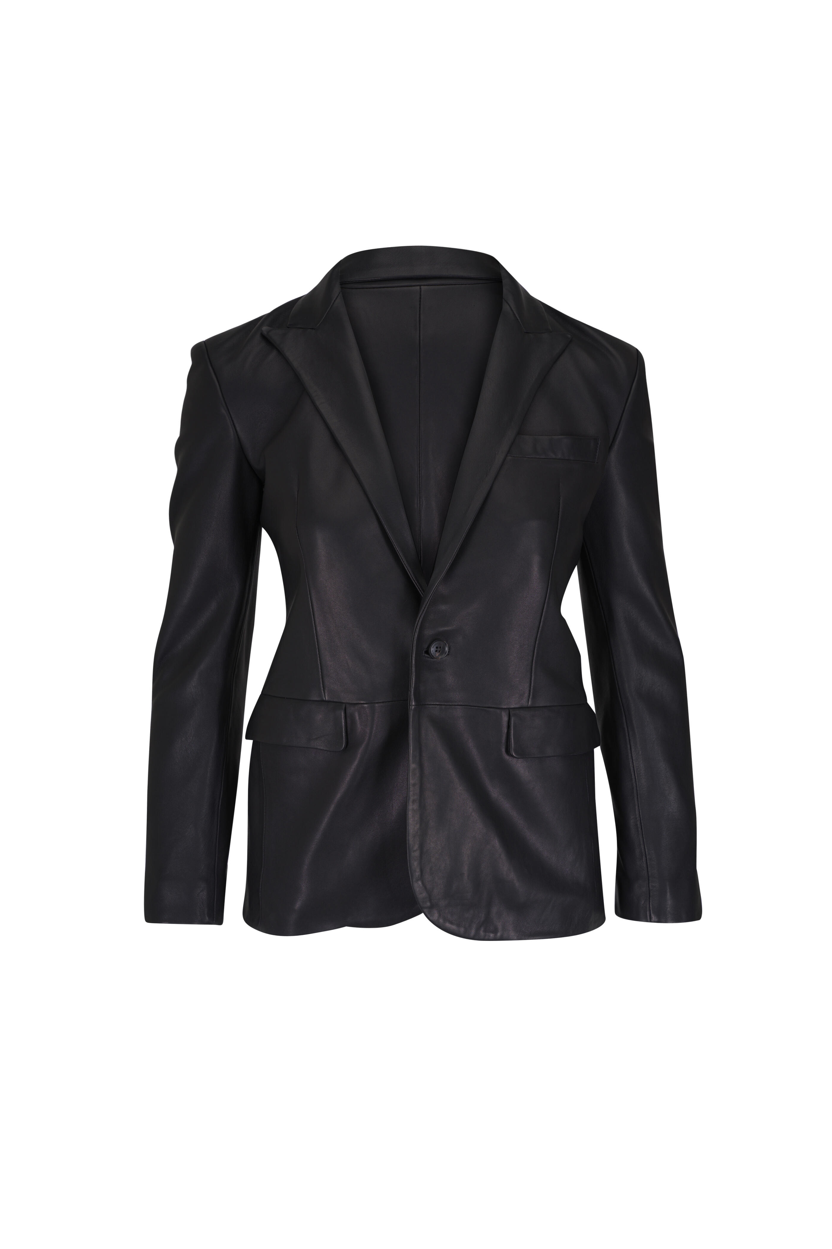 Specialist clean. Peak lapel. Single button front closure. Lower flap welt pockets; chest welt pocket. Four buttoned cuffs. Back vent. Imported. Approximately 27" shoulder to hem (measurements taken from size 0). 100% lamb leather; lined.