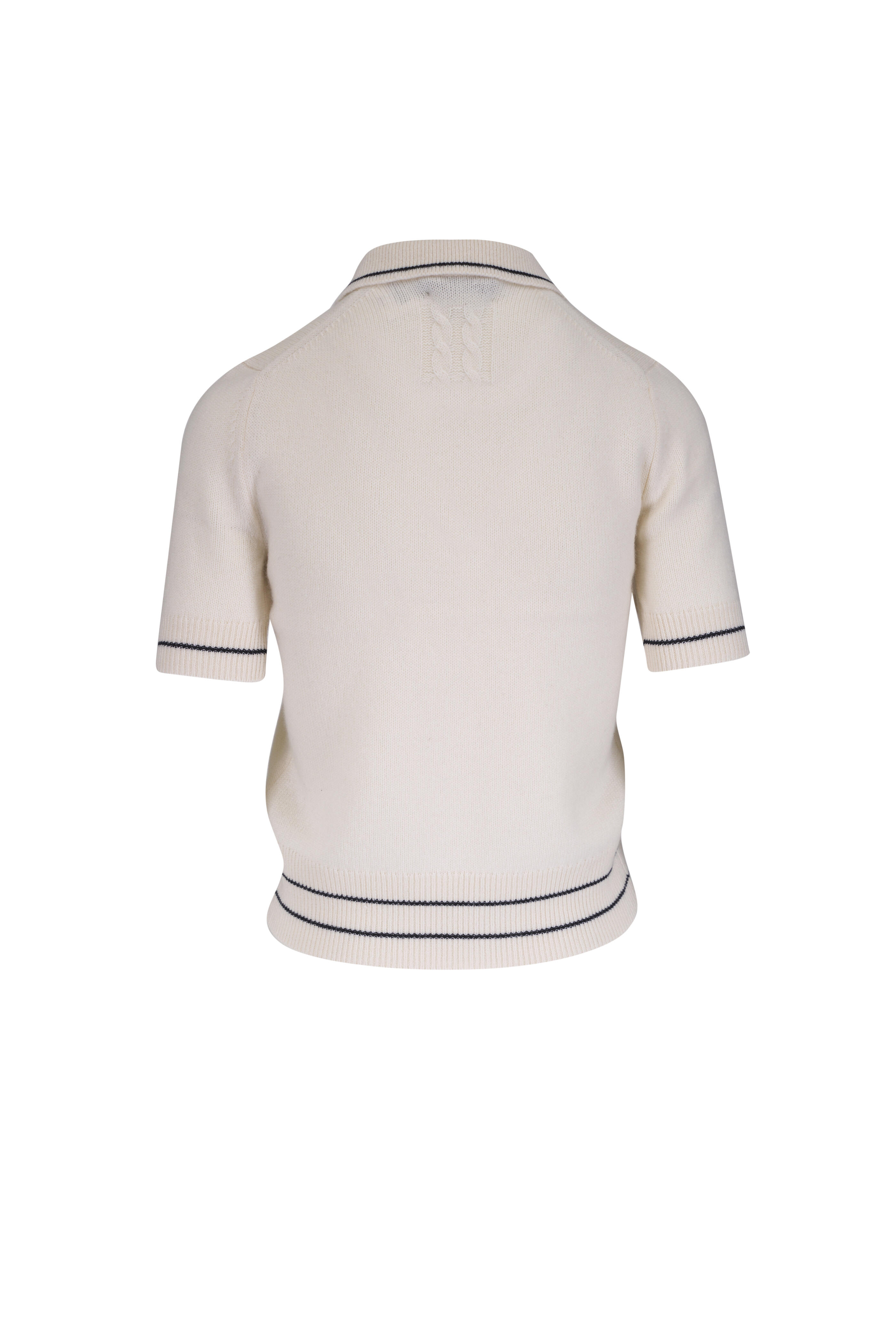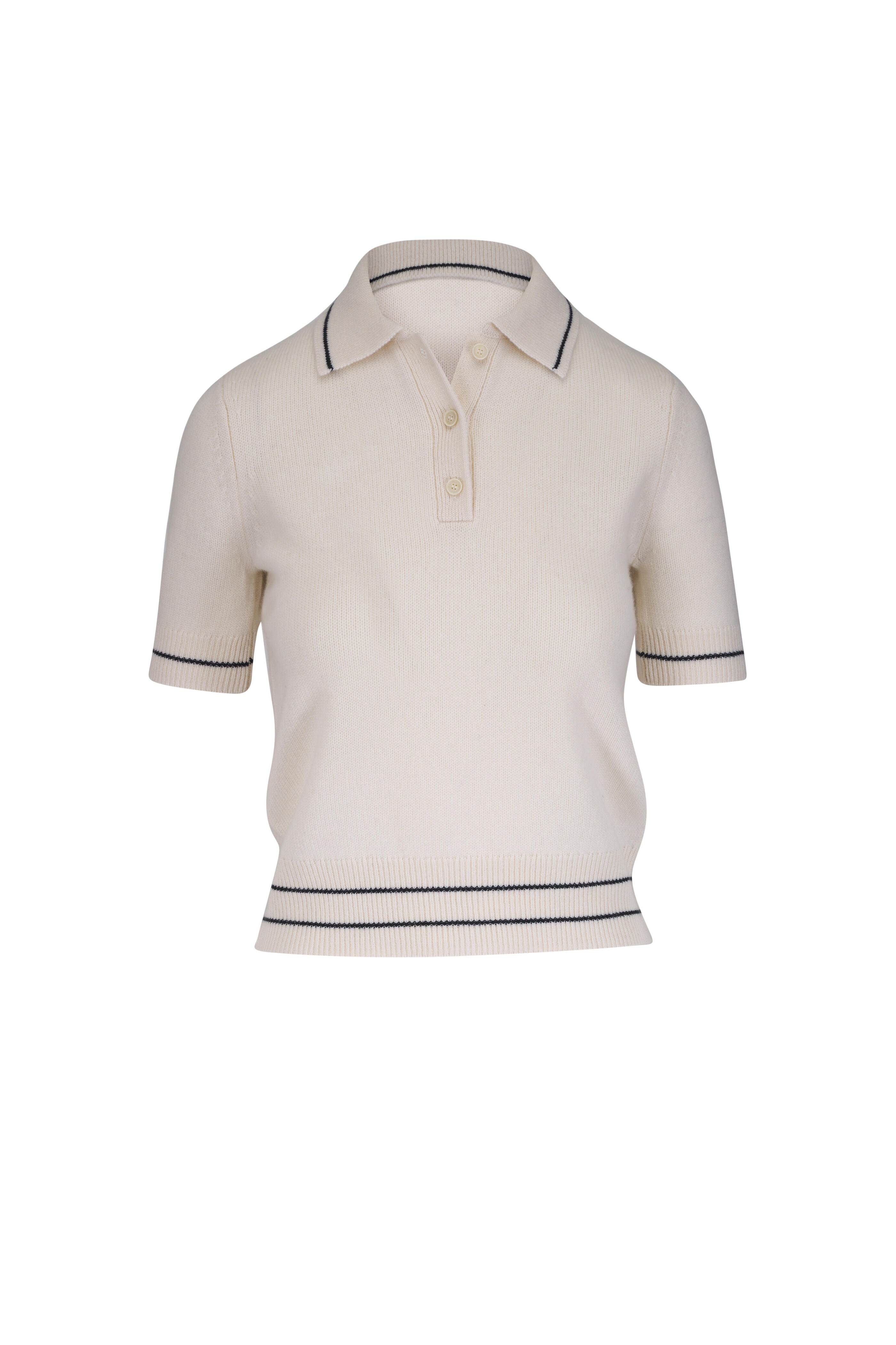 Spread collar. Three button placket. Ribbed knit trim at collar, cuff and hem. Tipping detail at collar and sleeve cuffs. Double stripe detail at hem. Imported. 100% cashmere. Dry clean.