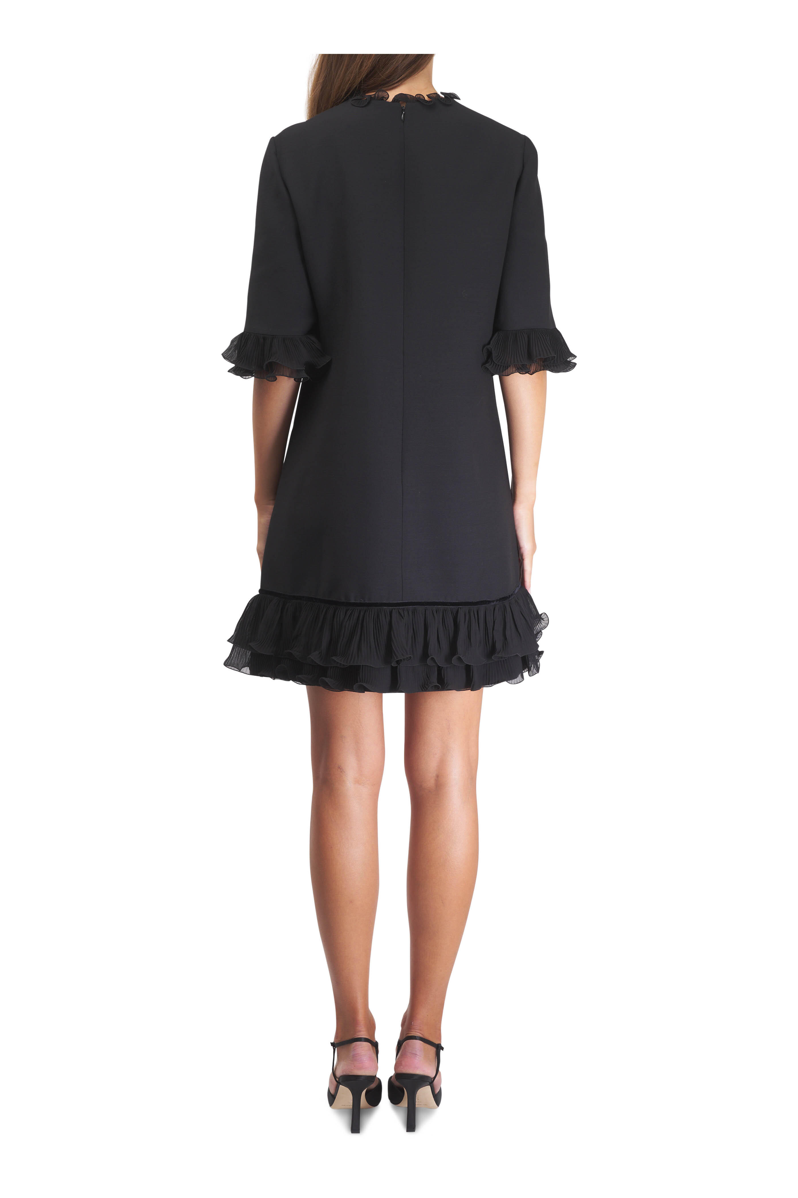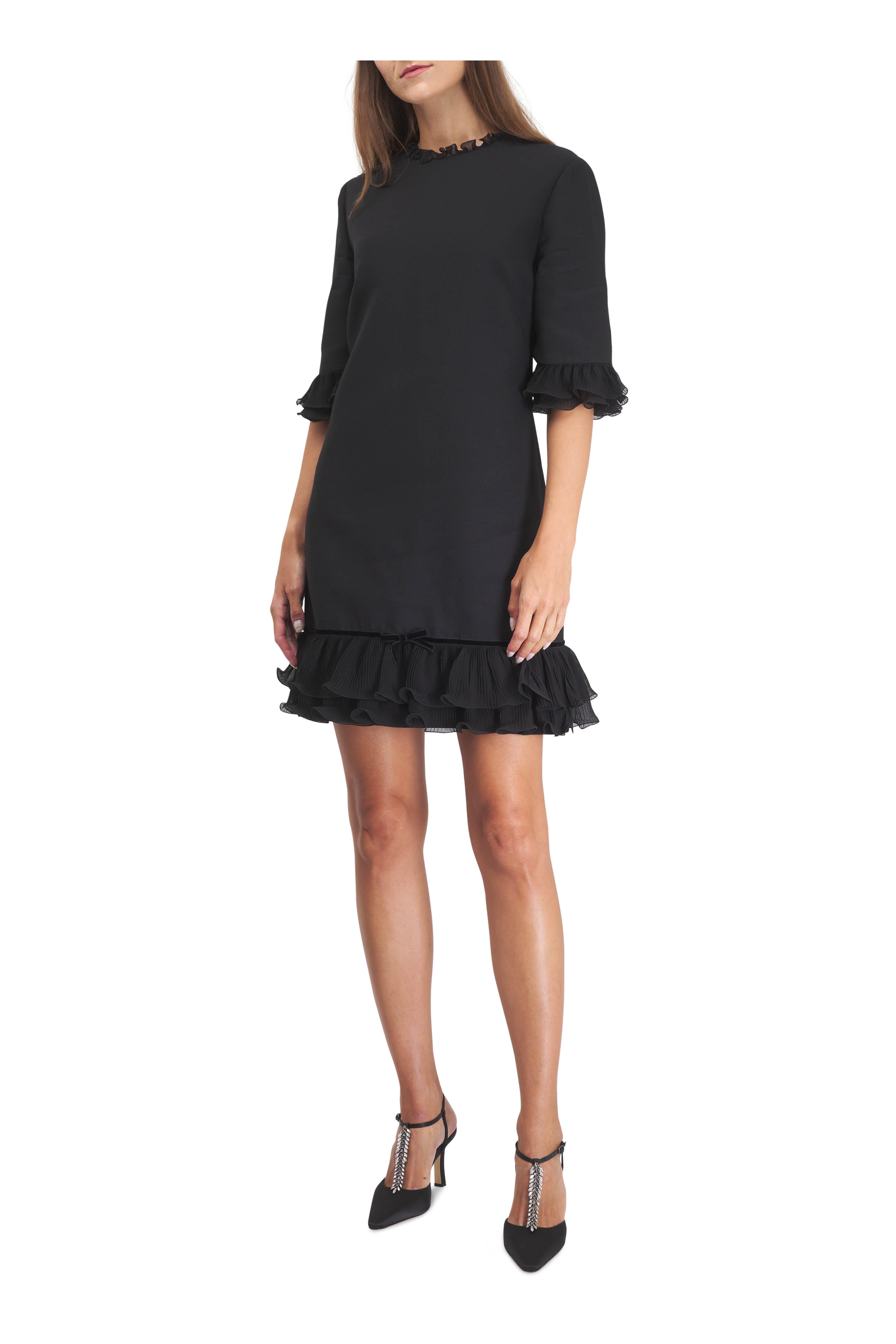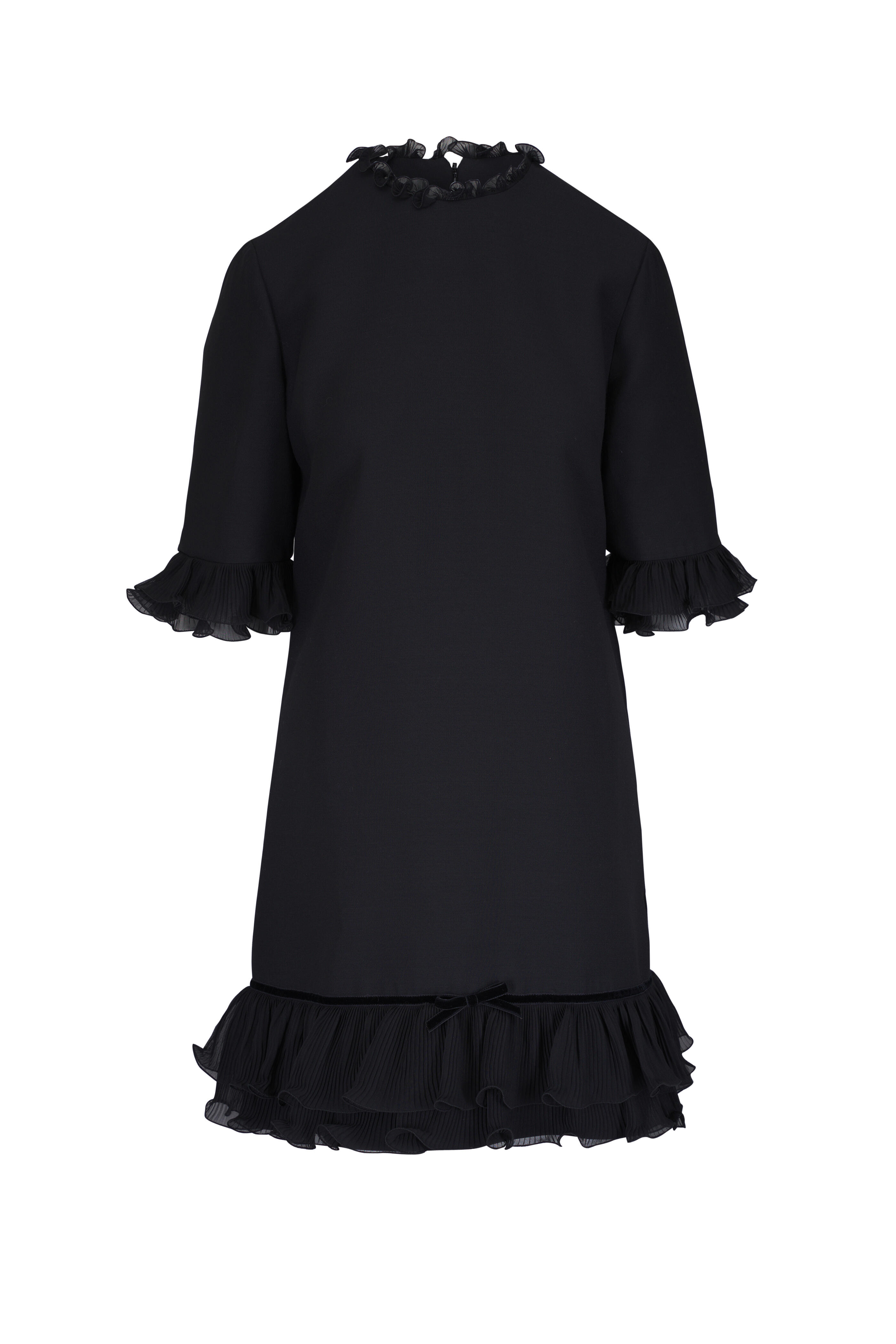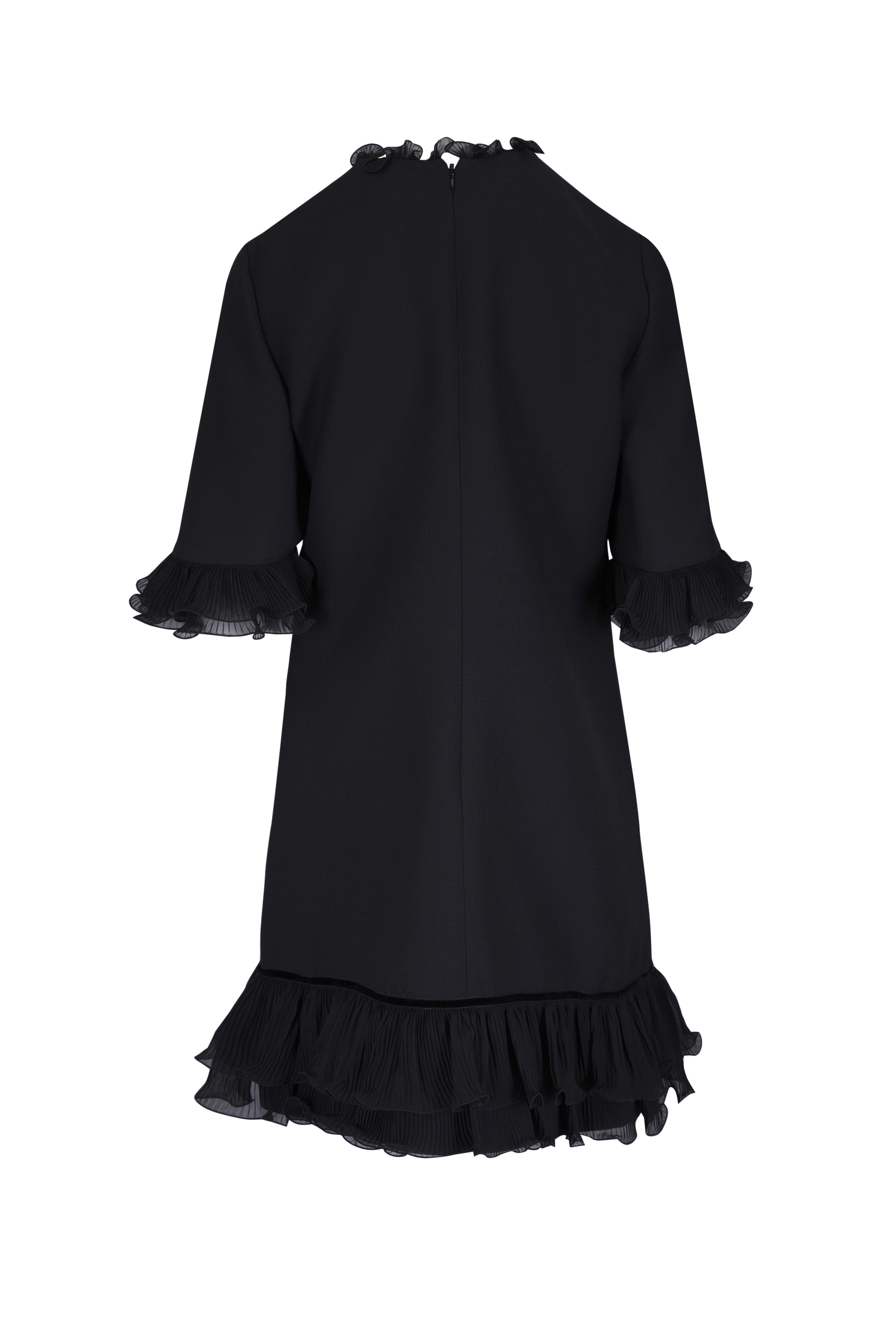Stand collar; ruffled trim. Concealed back zip. Pullover style. Ruffled trims. Velvet ribbon detail at hem. Ruffled hem. Made in Italy. Shoulder to hem 35" (size 8). 100% silk; fabric 2: 65% virgin wool, 35% silk; fully lined; 100% silk. Dry clean.