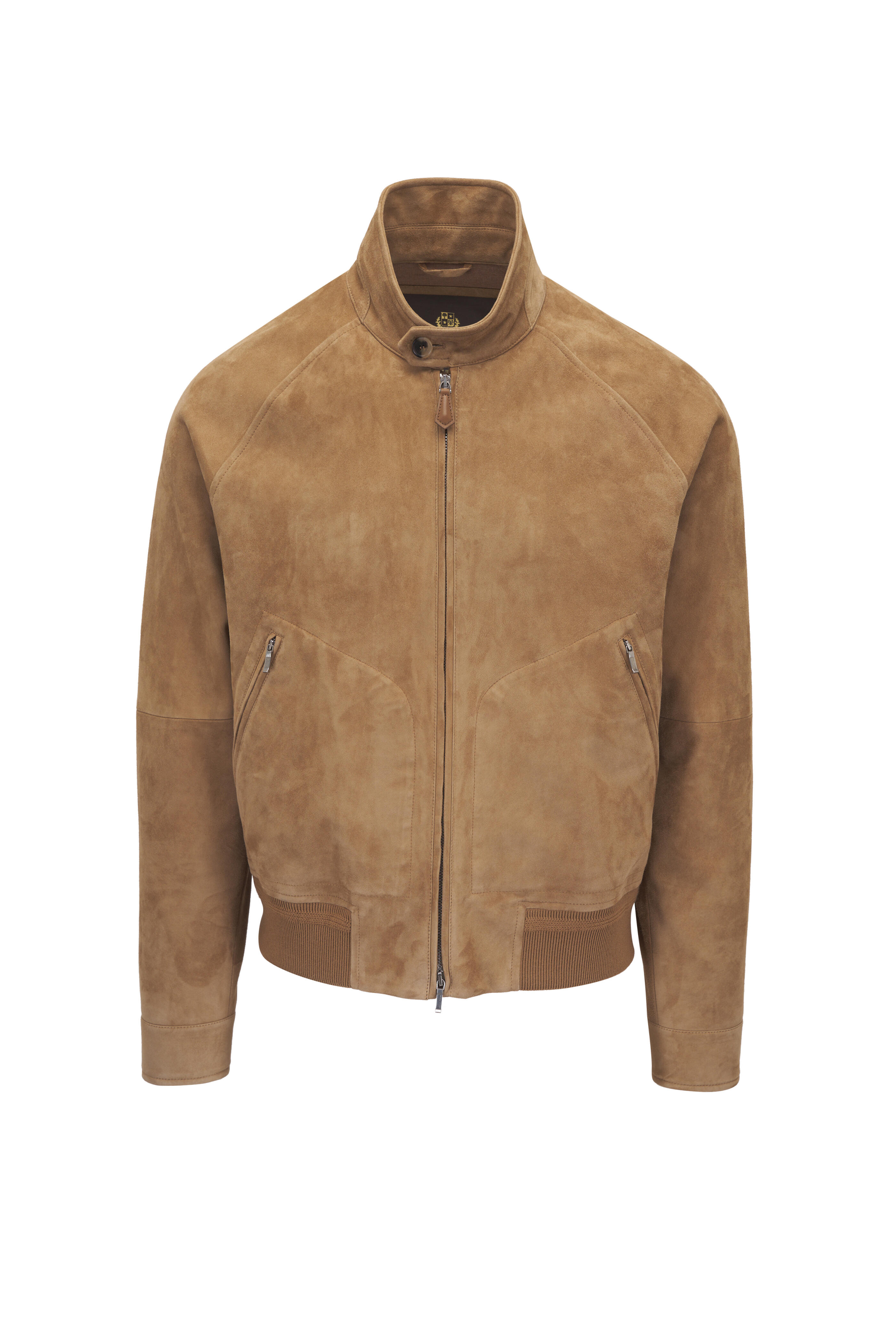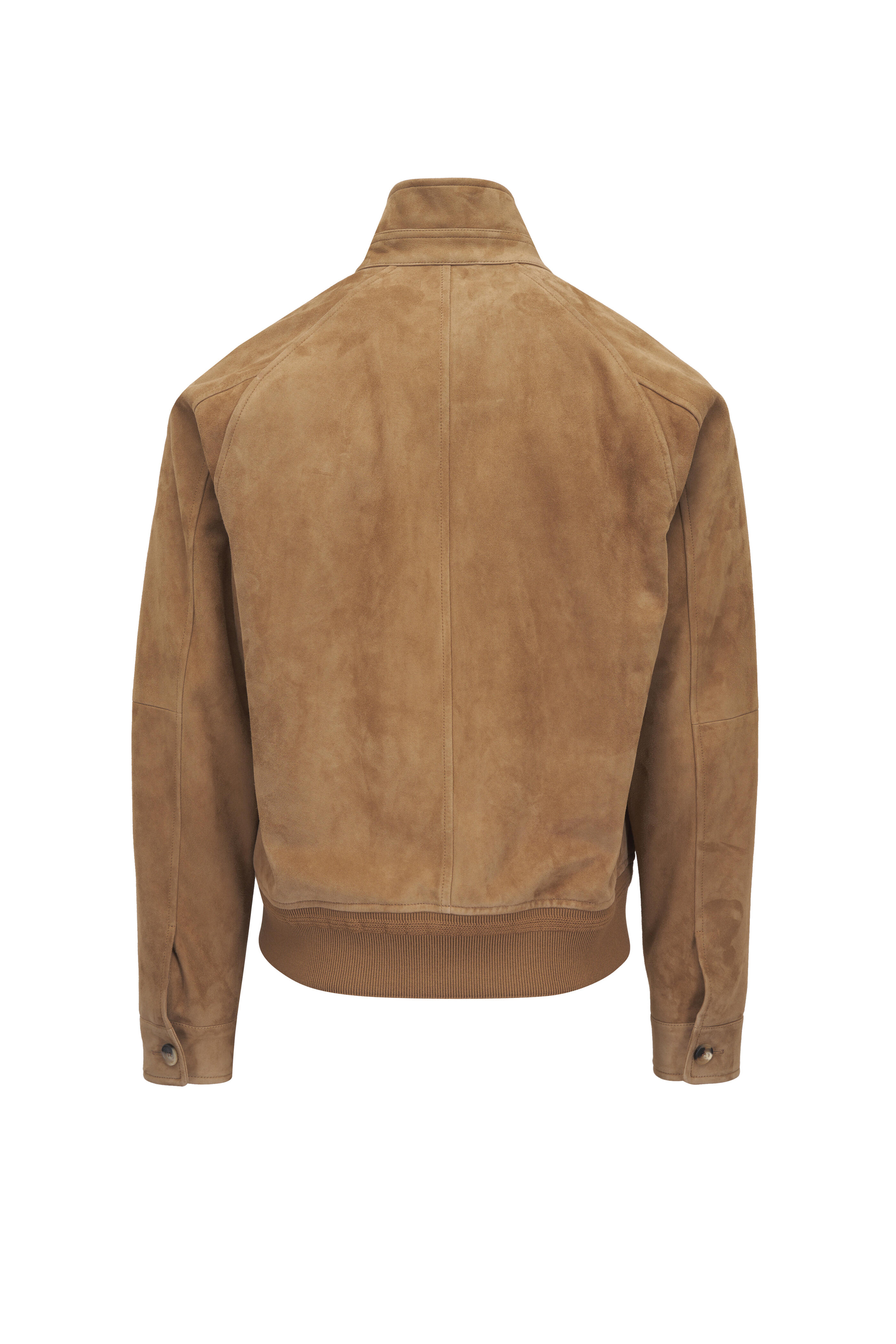 Stand collar; button closure. Two-way front zip placket. Lower waist zip pockets. Single button square cuffs. Ribbed hem. Made in Italy. Shoulder to hem 25" (size 40 R). 100% Lambskin; fully lined. Dry clean.