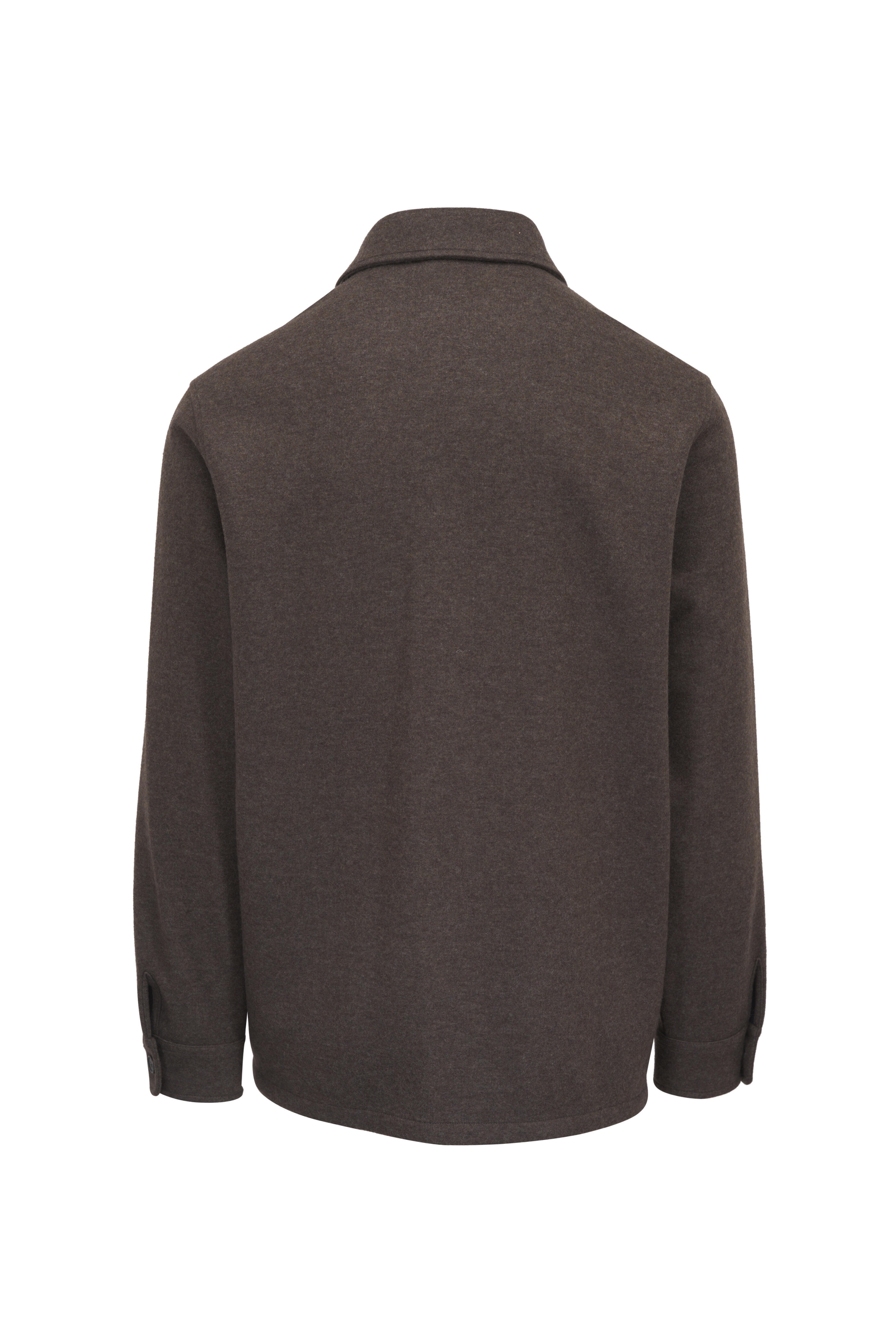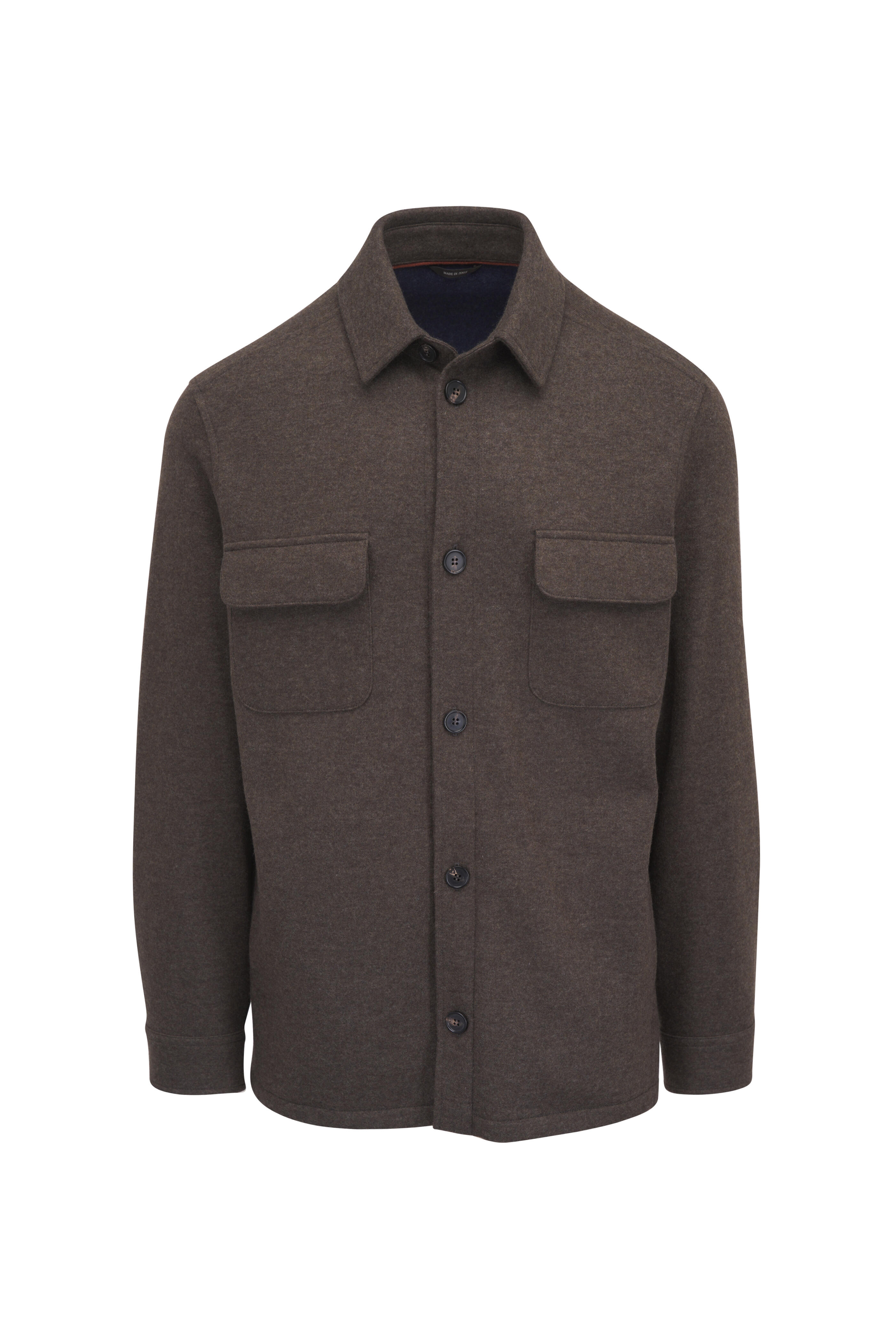 Point collar. Front button placket. Side zip pockets; buttoned flap chest pockets. Single button barrel cuffs. Made in Italy. Approximately 30" shoulder to hem (measurements taken from size L). 96% cashmere, 4% polyamide; trim: 100% goatskin suede. Dry clean.