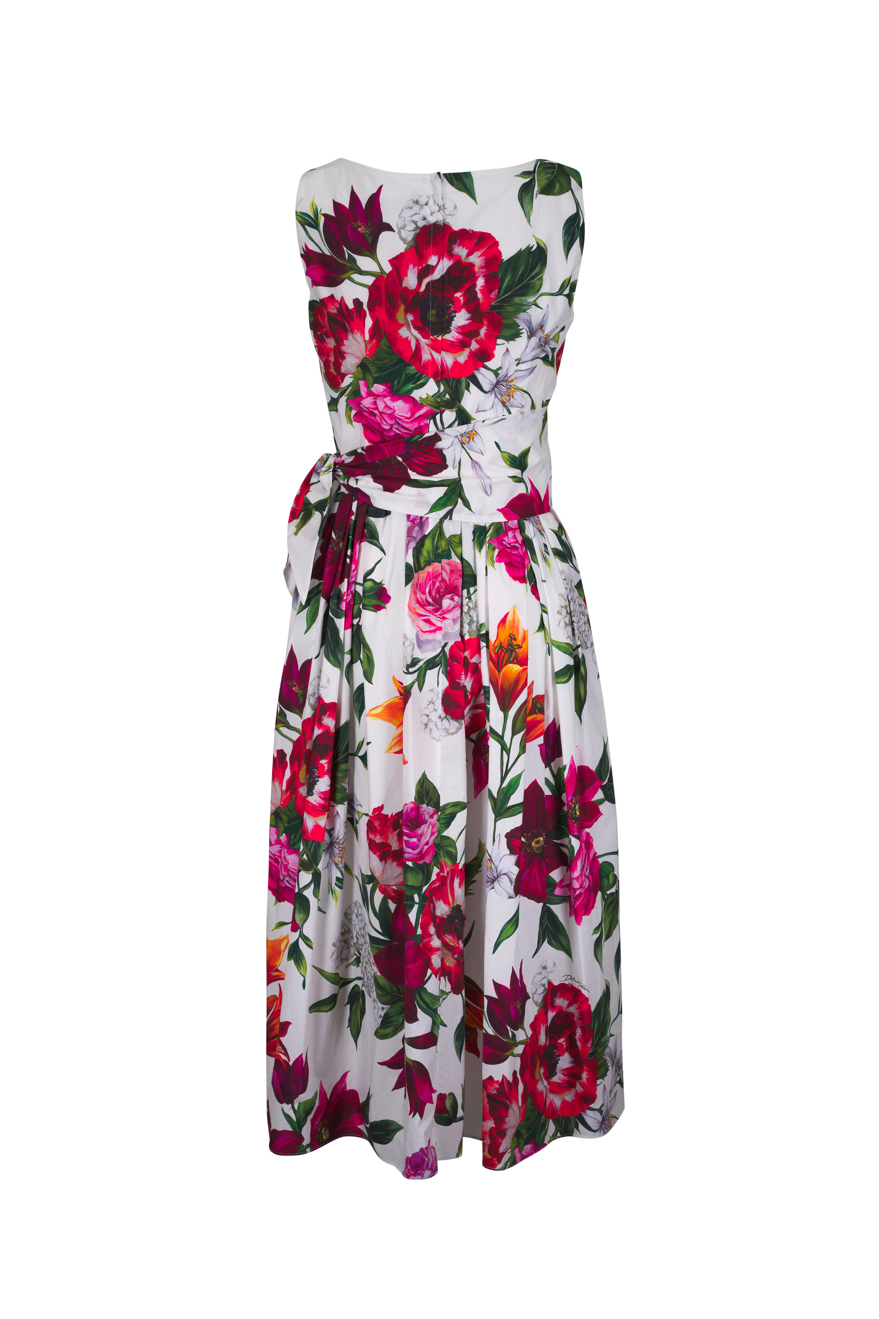 Boat neckline. Back zip; hook-and-bar closure. Self-tie belt. Side slip pockets. Made in Italy. Approximately 49" shoulder to hem. 100% cotton. Dry clean.
