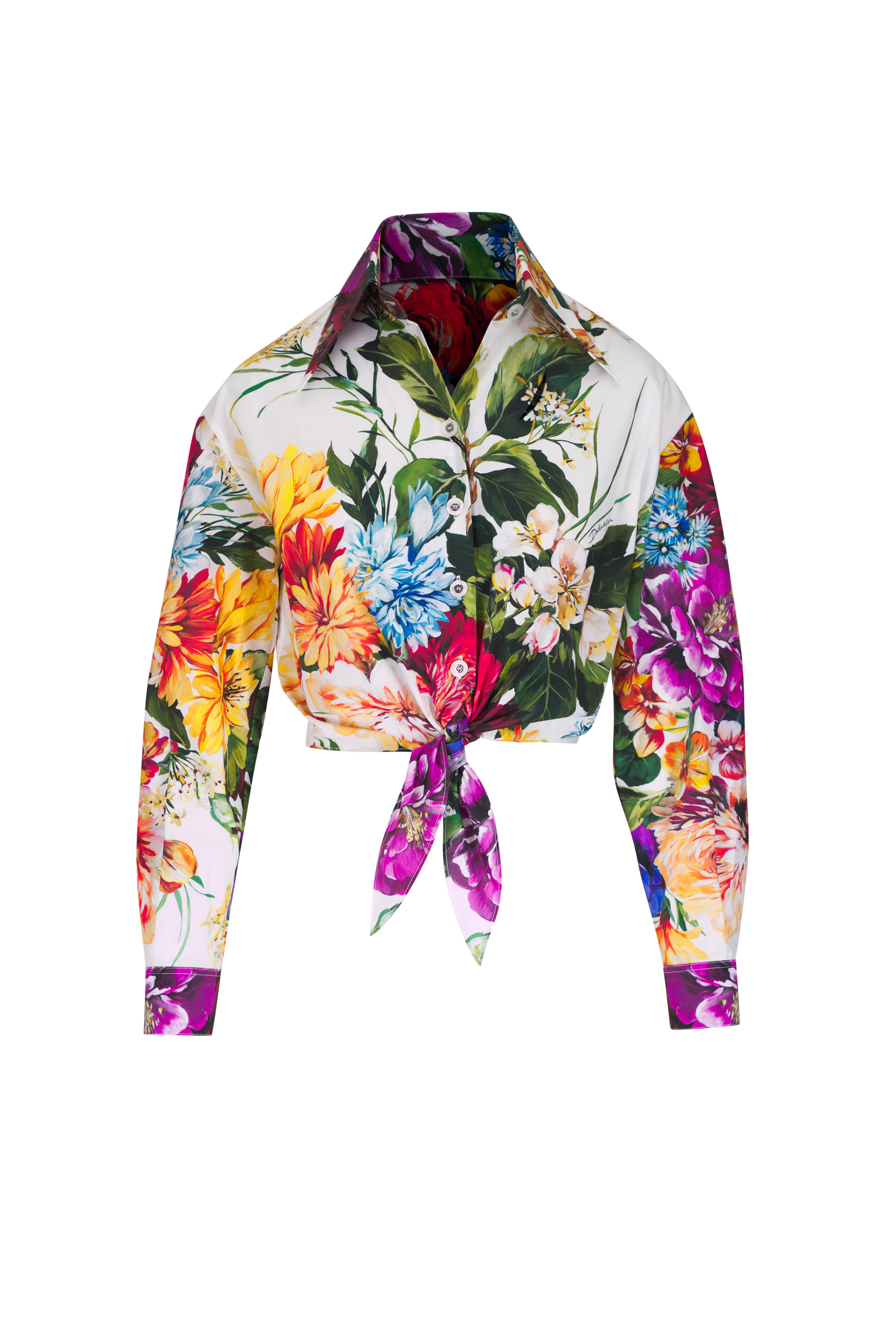 Spread collar. Front button placket. Lower tie. Single button square cuffs. Made in Italy. 100% cotton. Dry clean.
