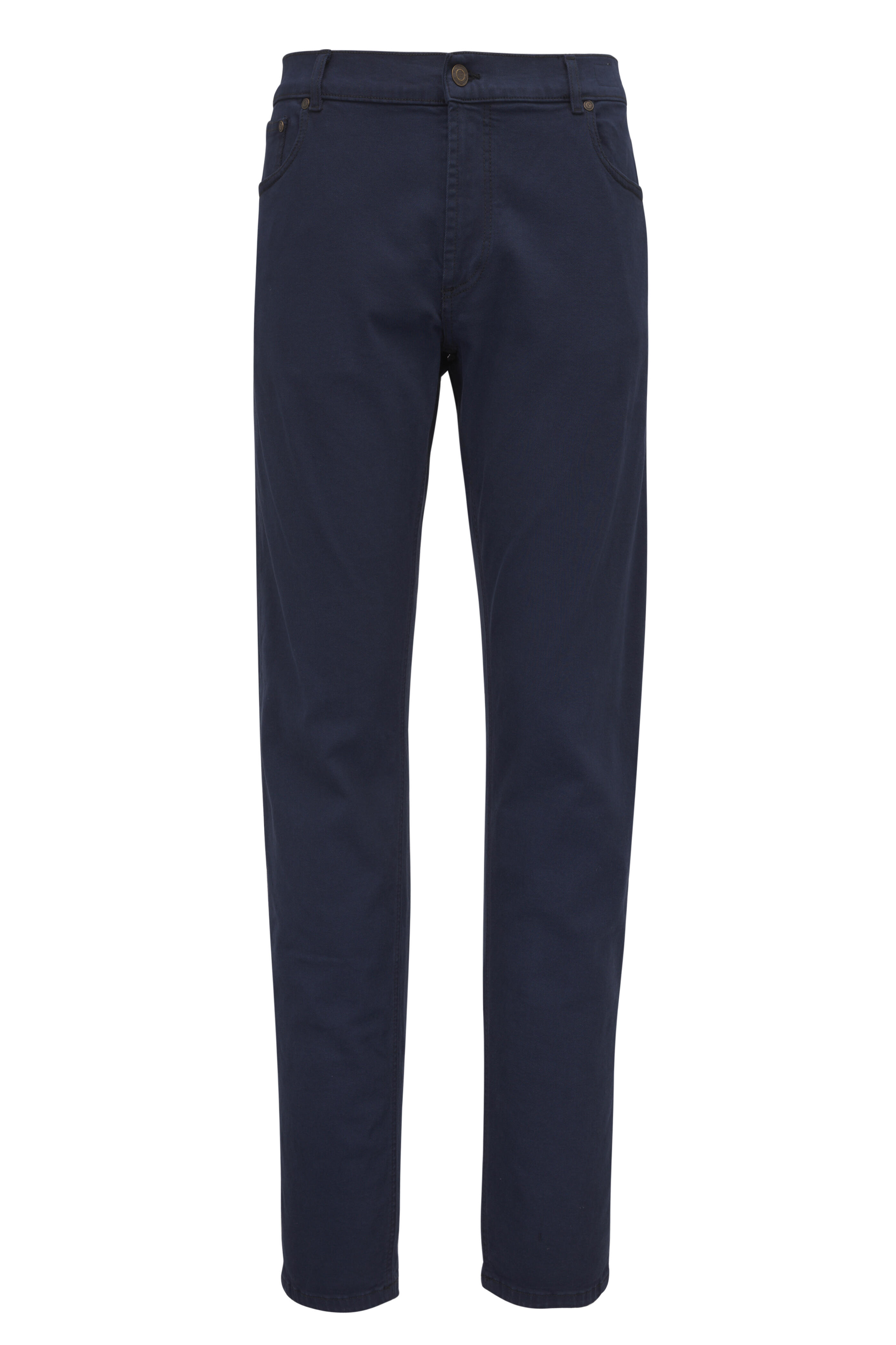 Zip fly with button closure. Banded waist; belt loops. Five pocket styling. Straight hem. Made in Italy. 34" Inseam (size 36 R). 98% cotton, 2% elastane. Dry clean.
