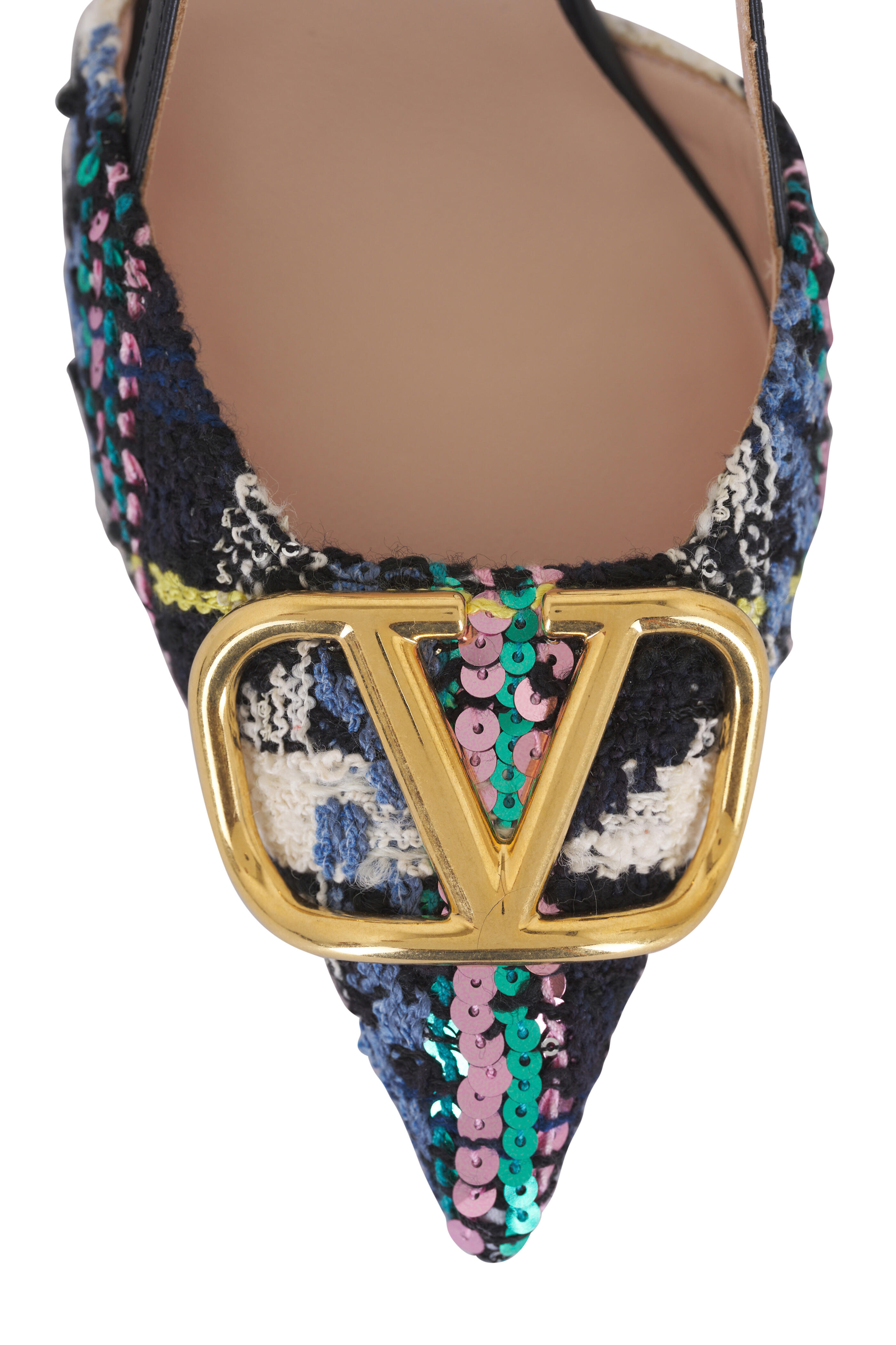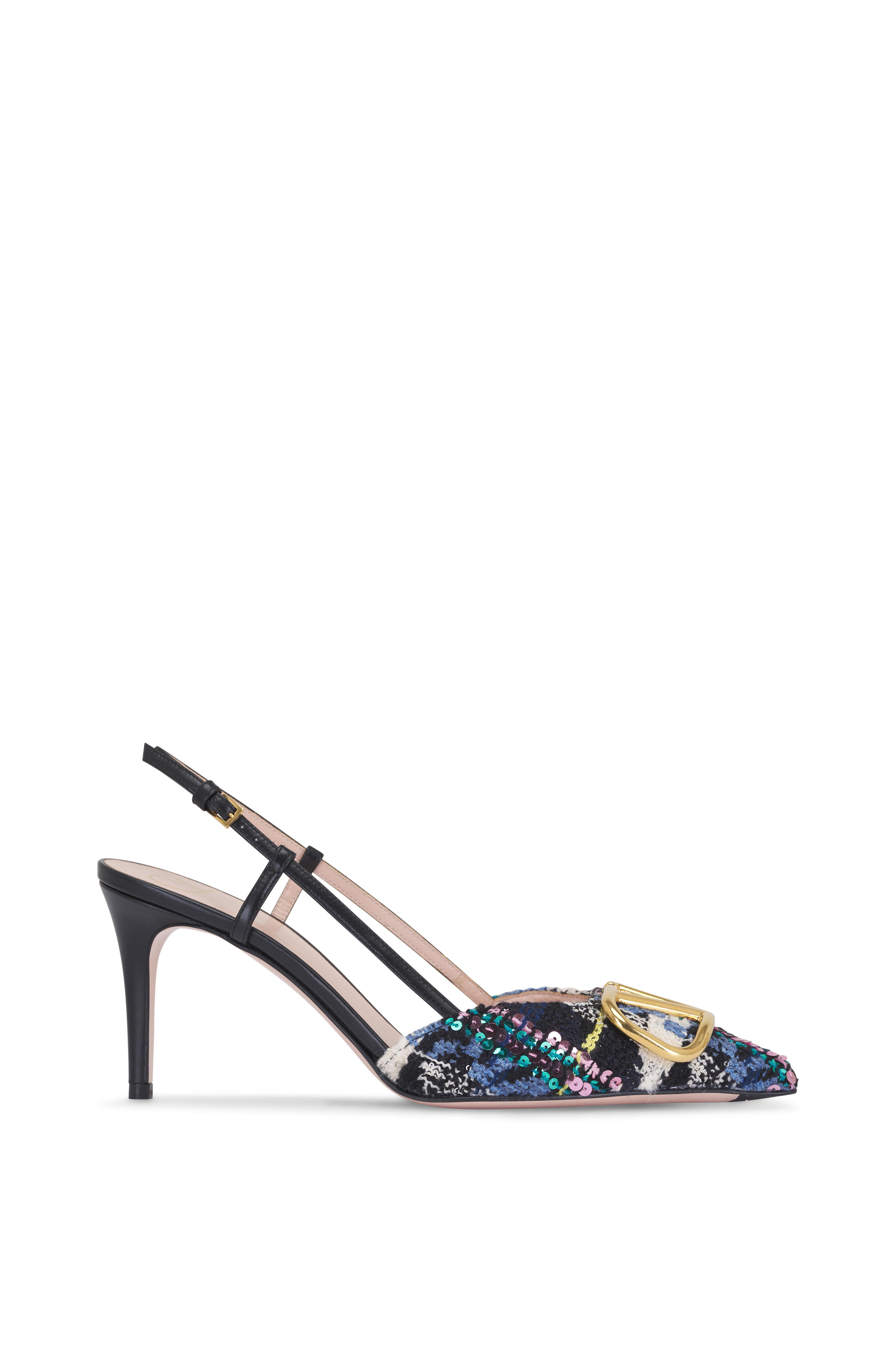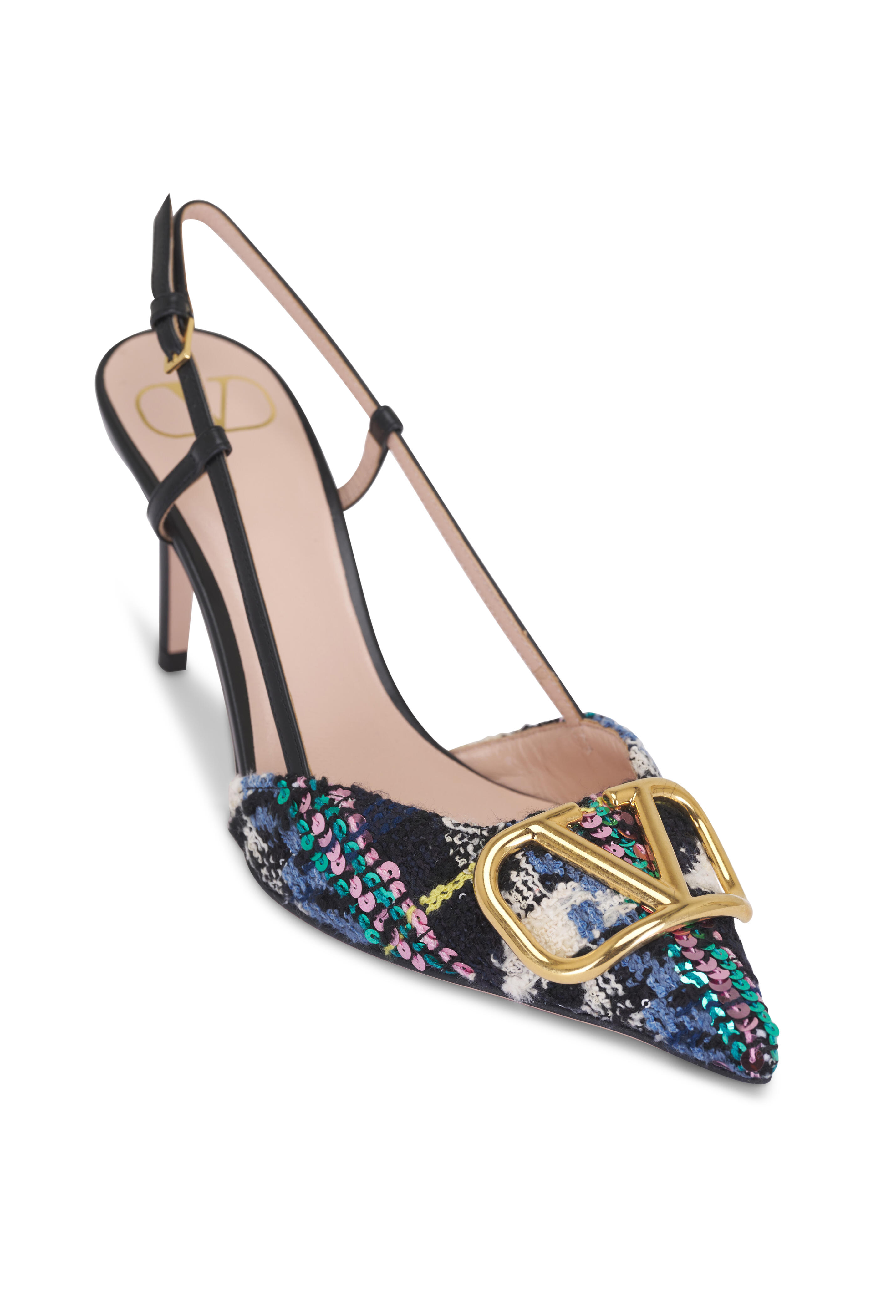 Tweed and leather upper. Pointed toe. Adjustable ankle slingback strap. Gold-tone Vlogo buckle detail. Leather lining and insole. Self-covered heel. Leather sole. Made in Italy. Heel measurement: 80mm.