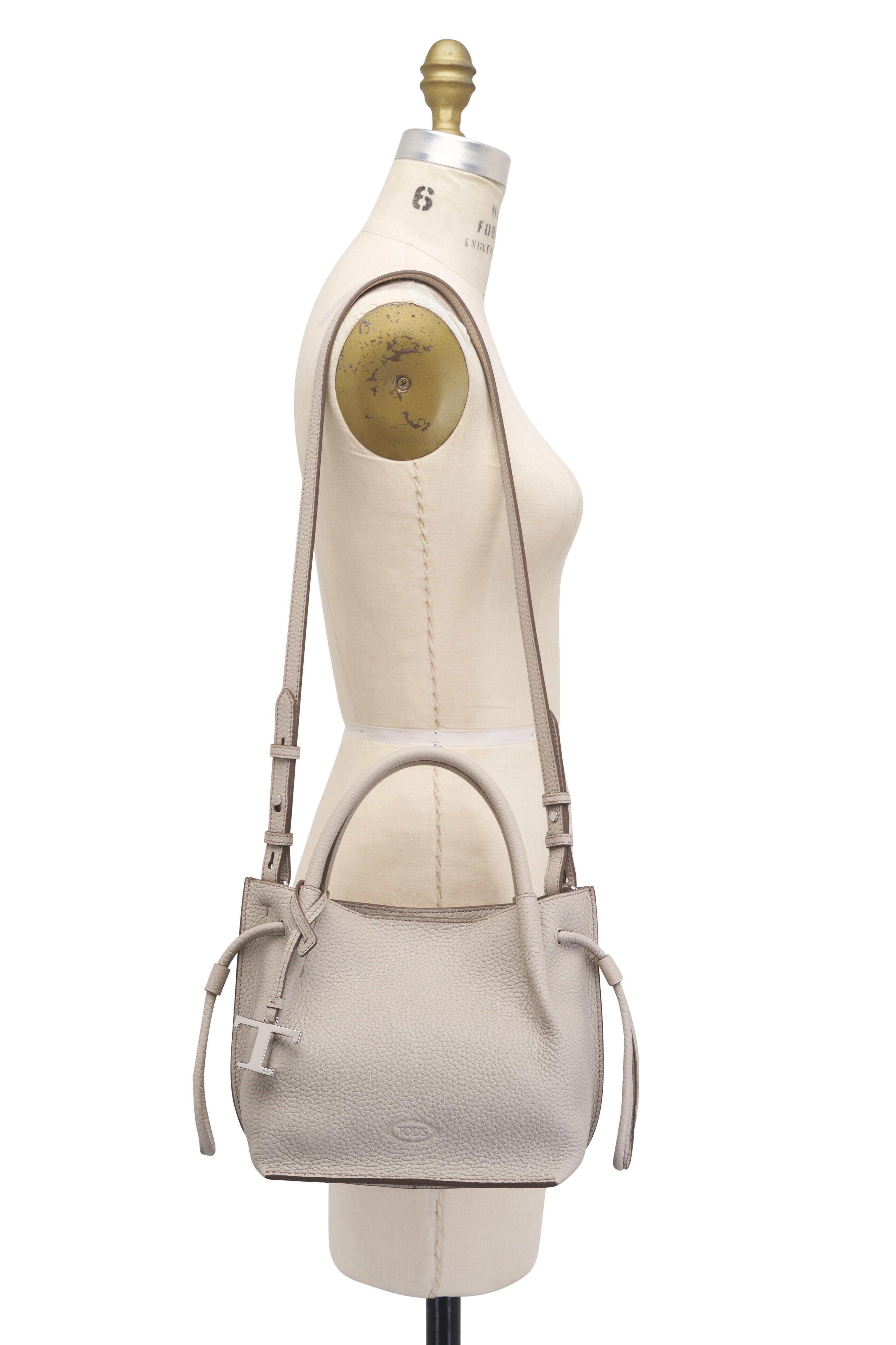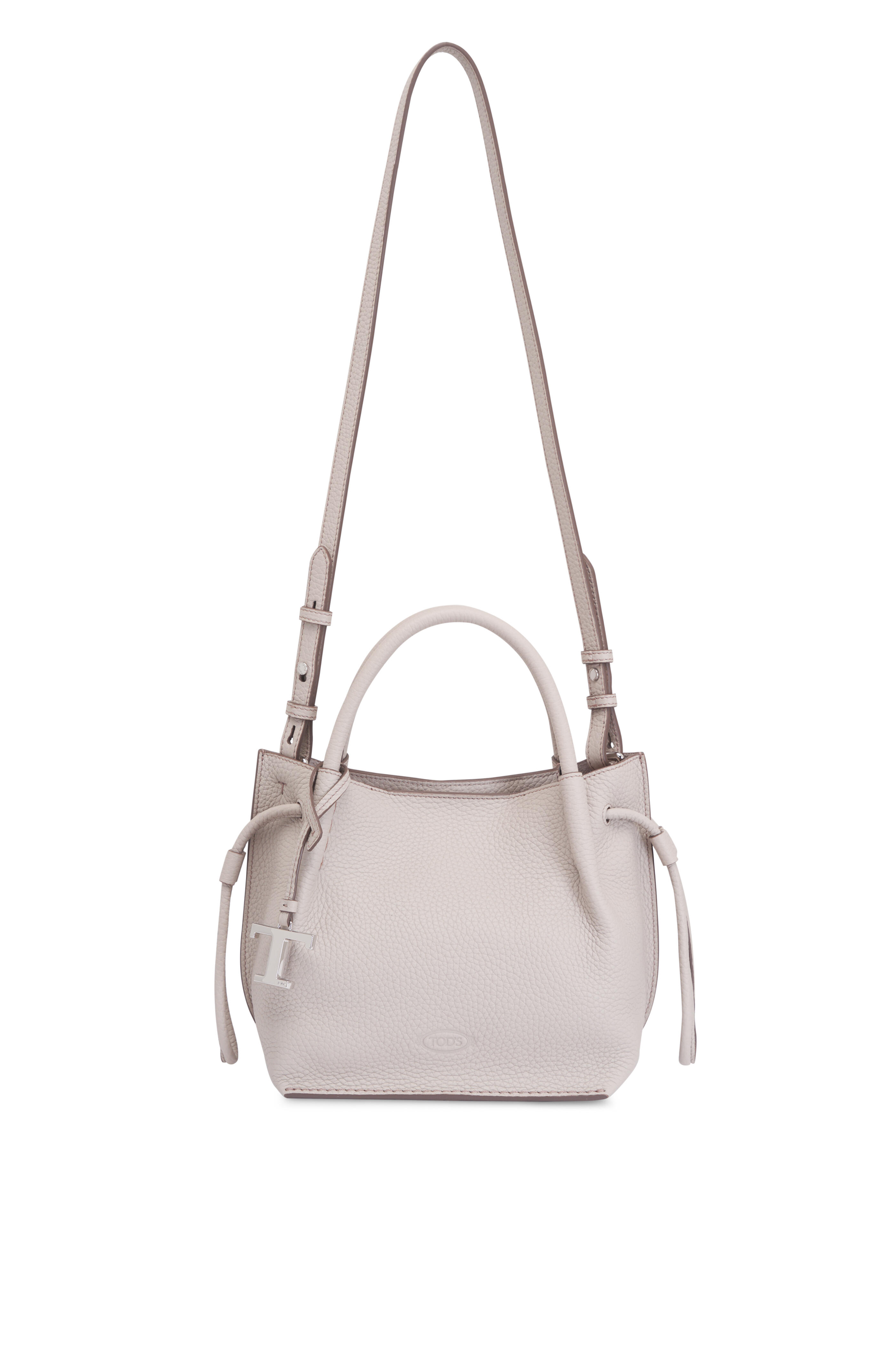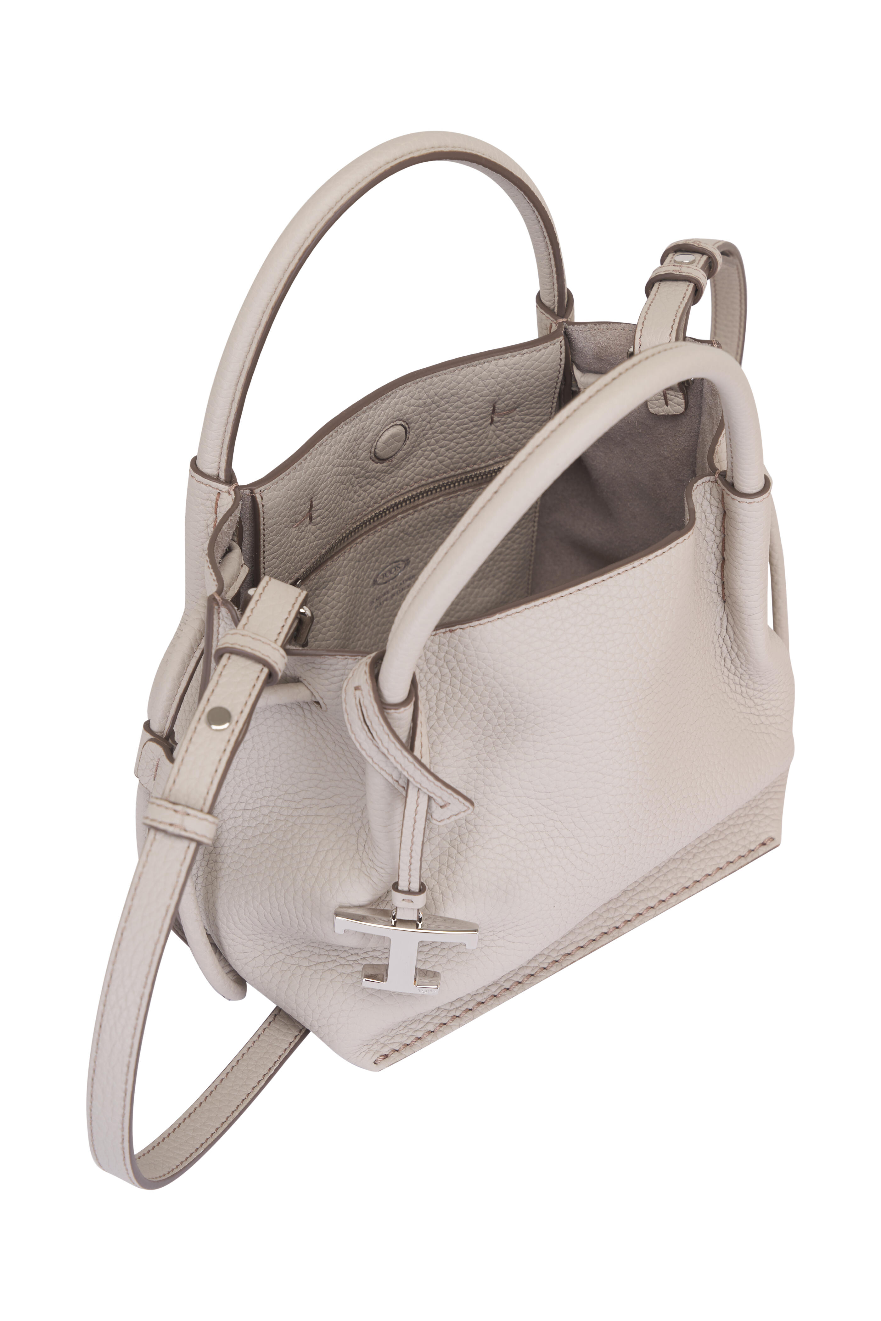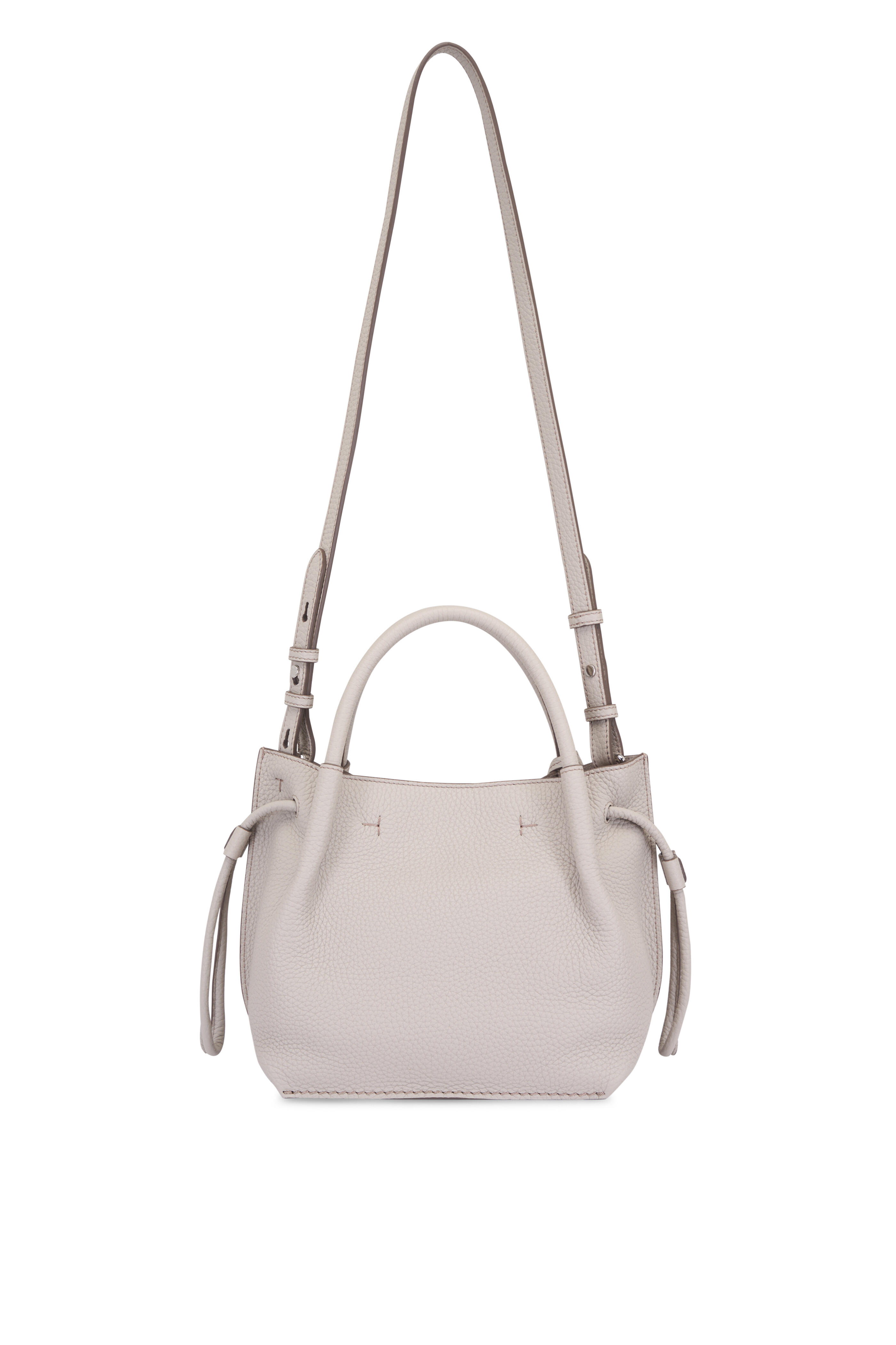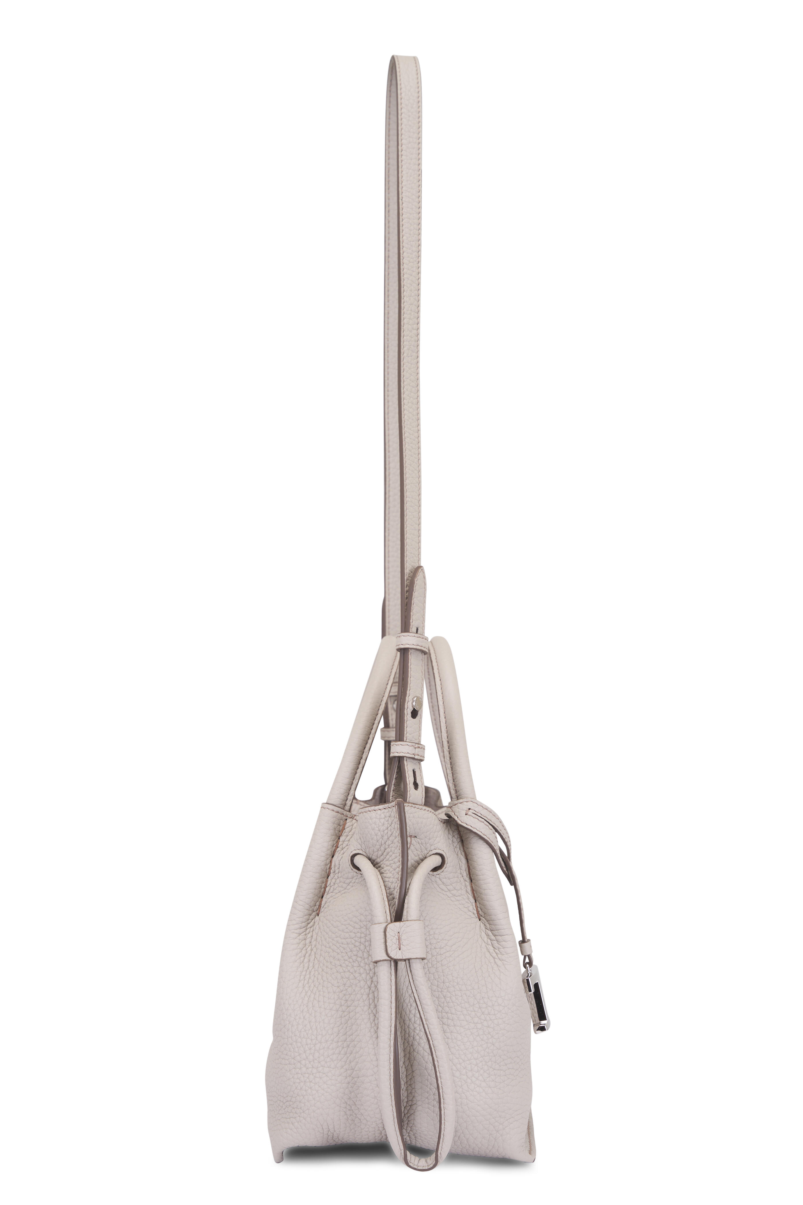 Grained leather. Dual top handles. Detachable, adjustable shoulder strap. Top magnetic snap closure. Single compartment; interior zip pocket. Unlined. Protective feet. Made in Italy. Height: 8". Width: 13". Depth: 6". Handle drop: 4".