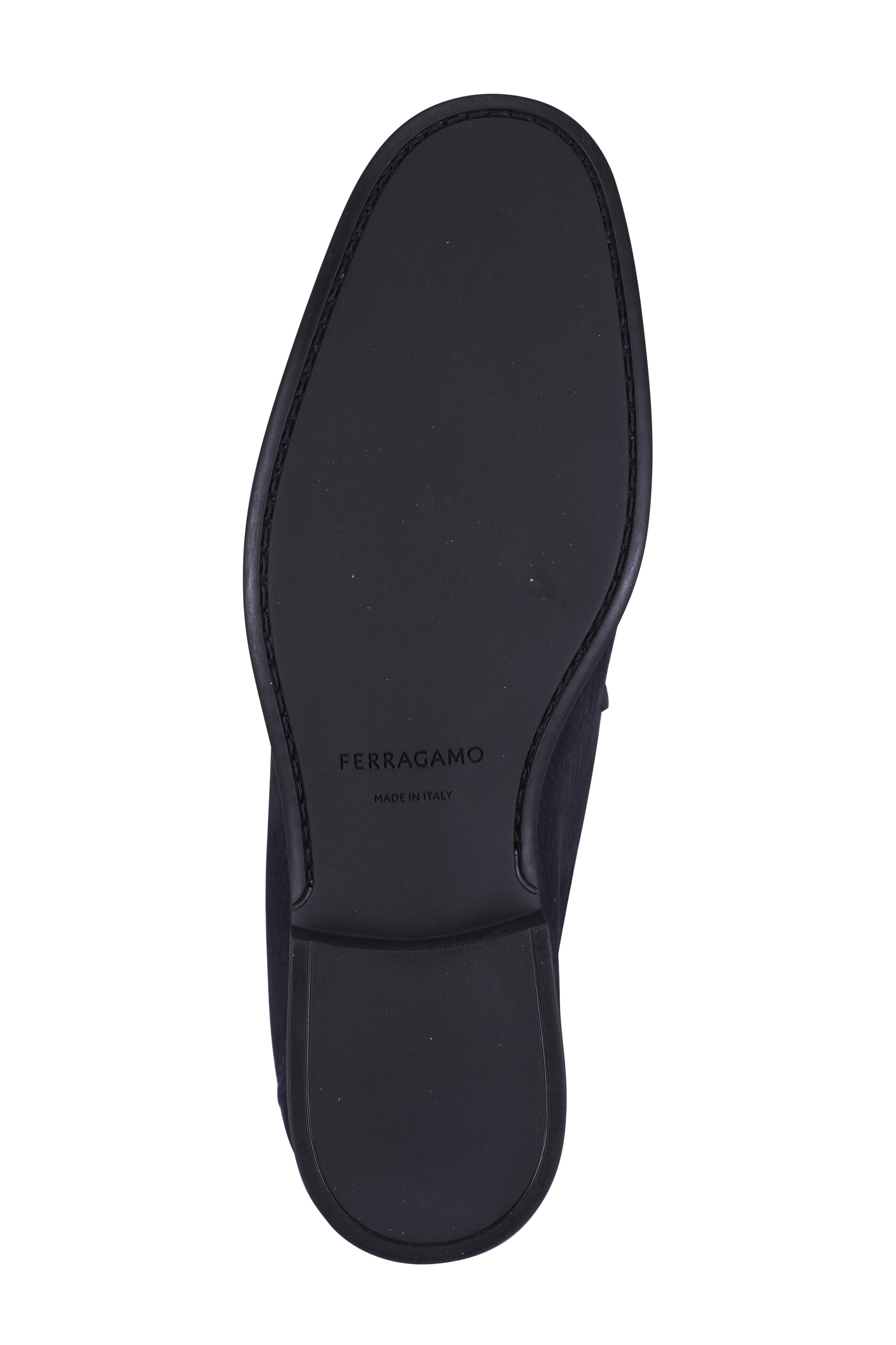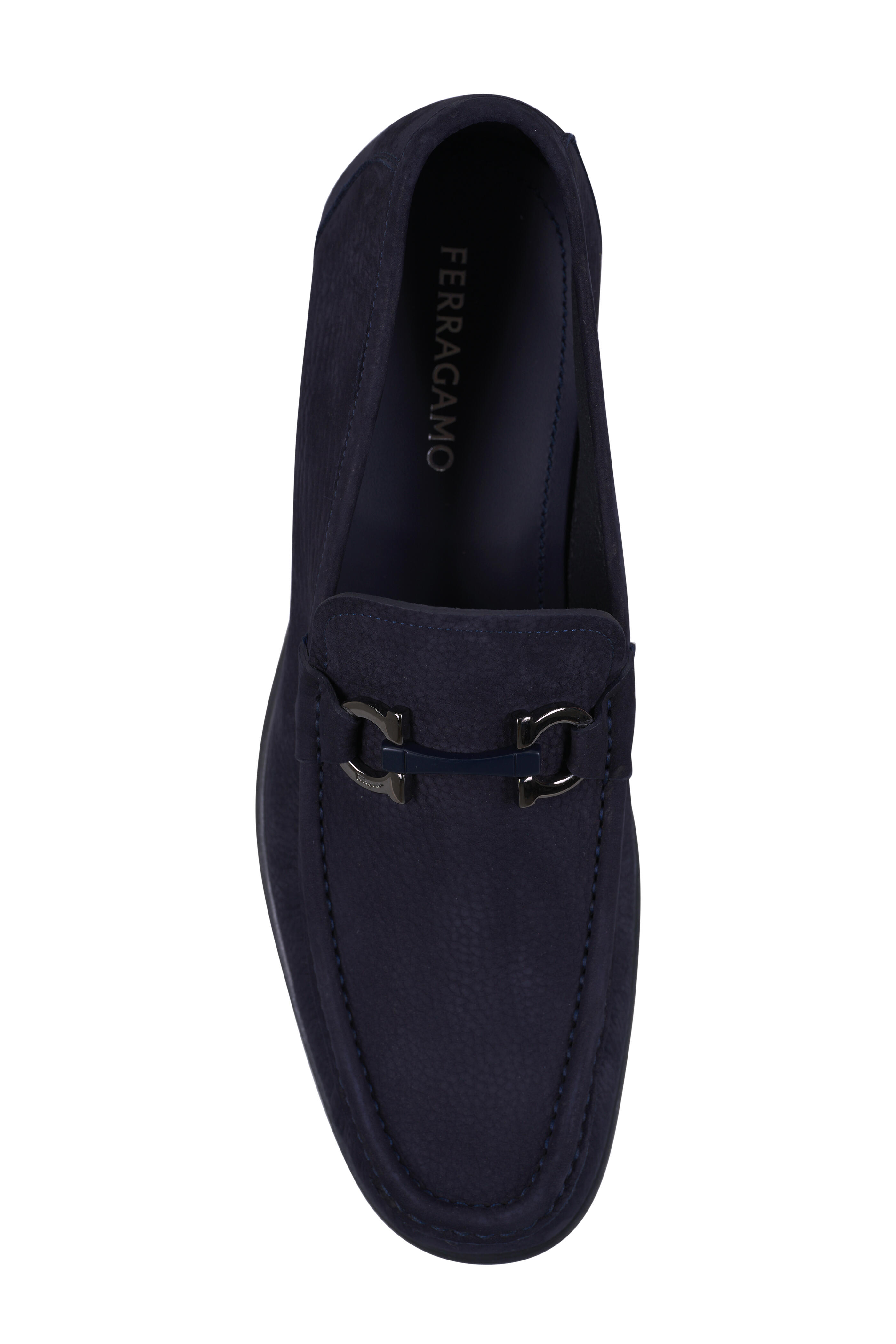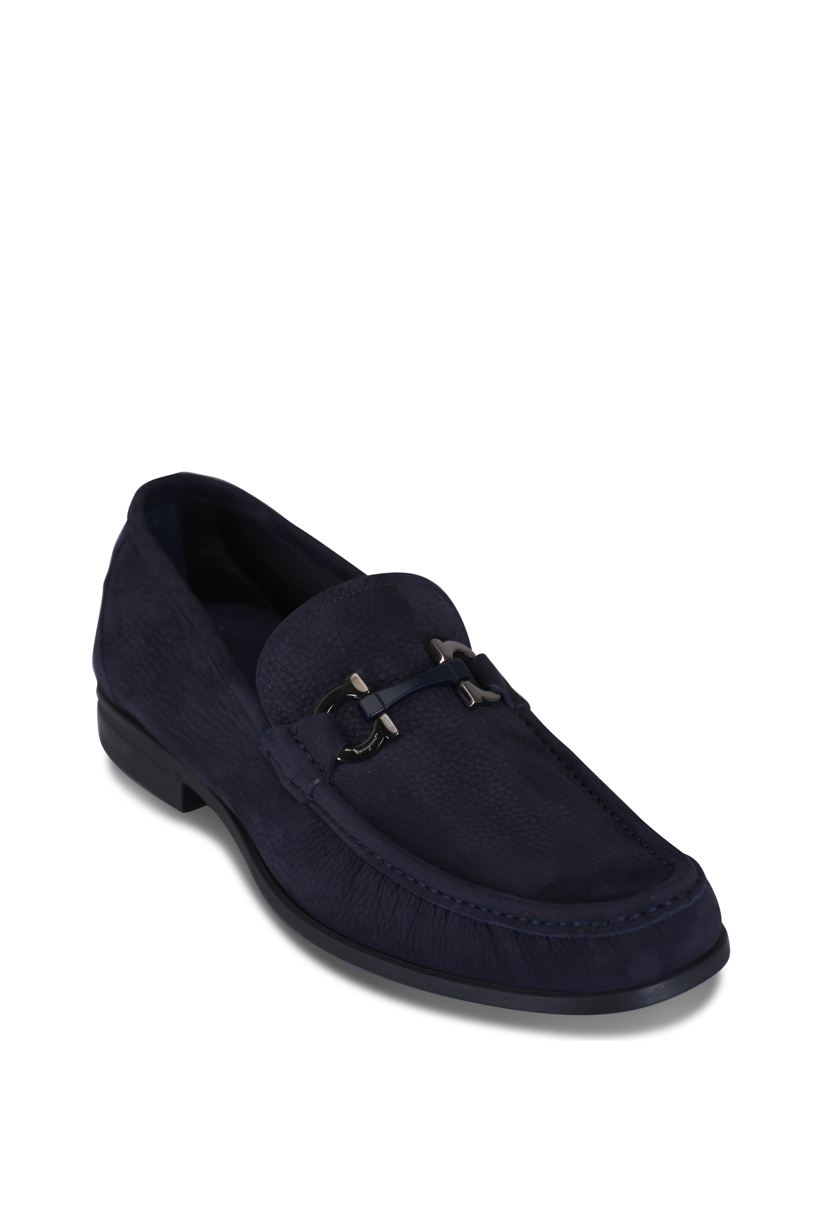 Suede upper. Moc toe. Gunmetal signature gancini bit at vamp. Tonal top-stitching. Leather lining and insole. Rubber sole. Made in Italy.